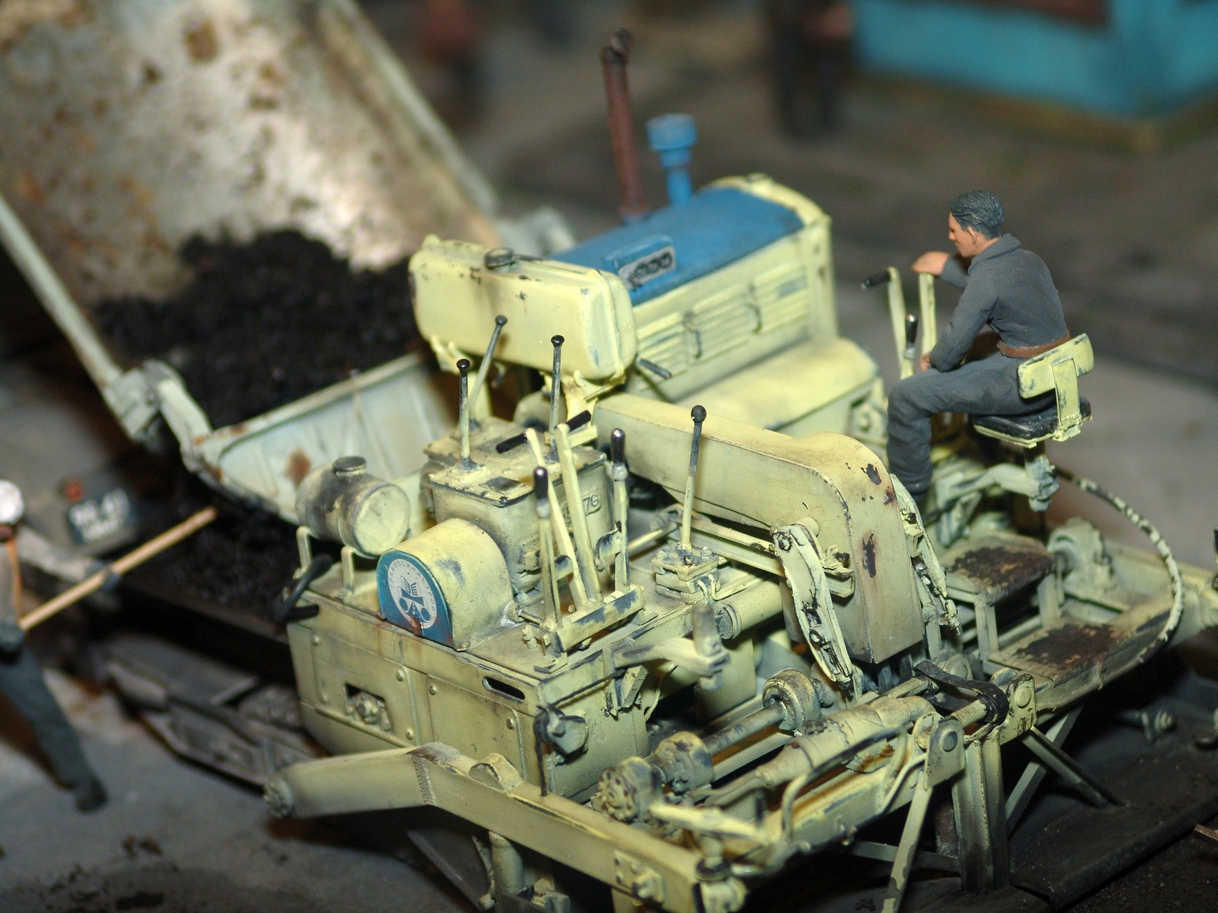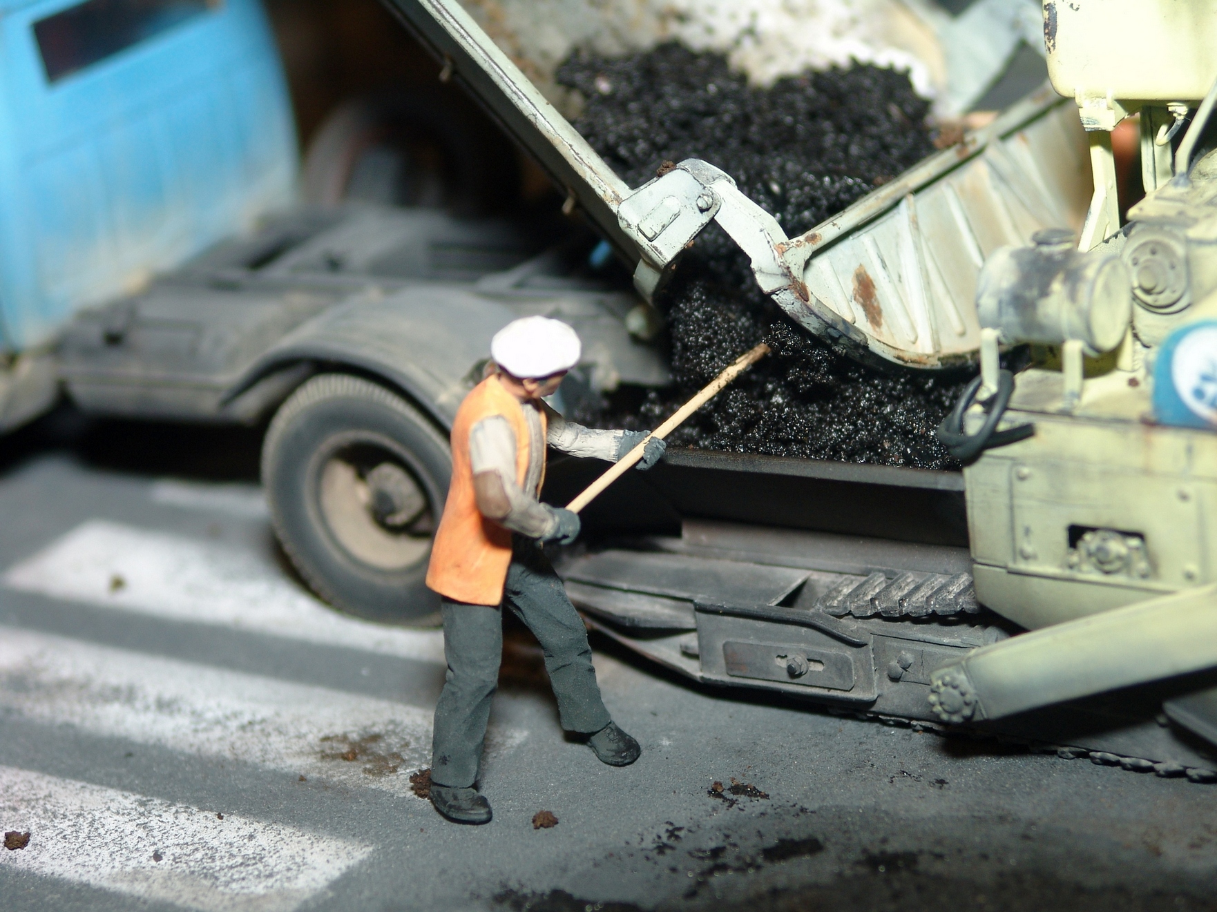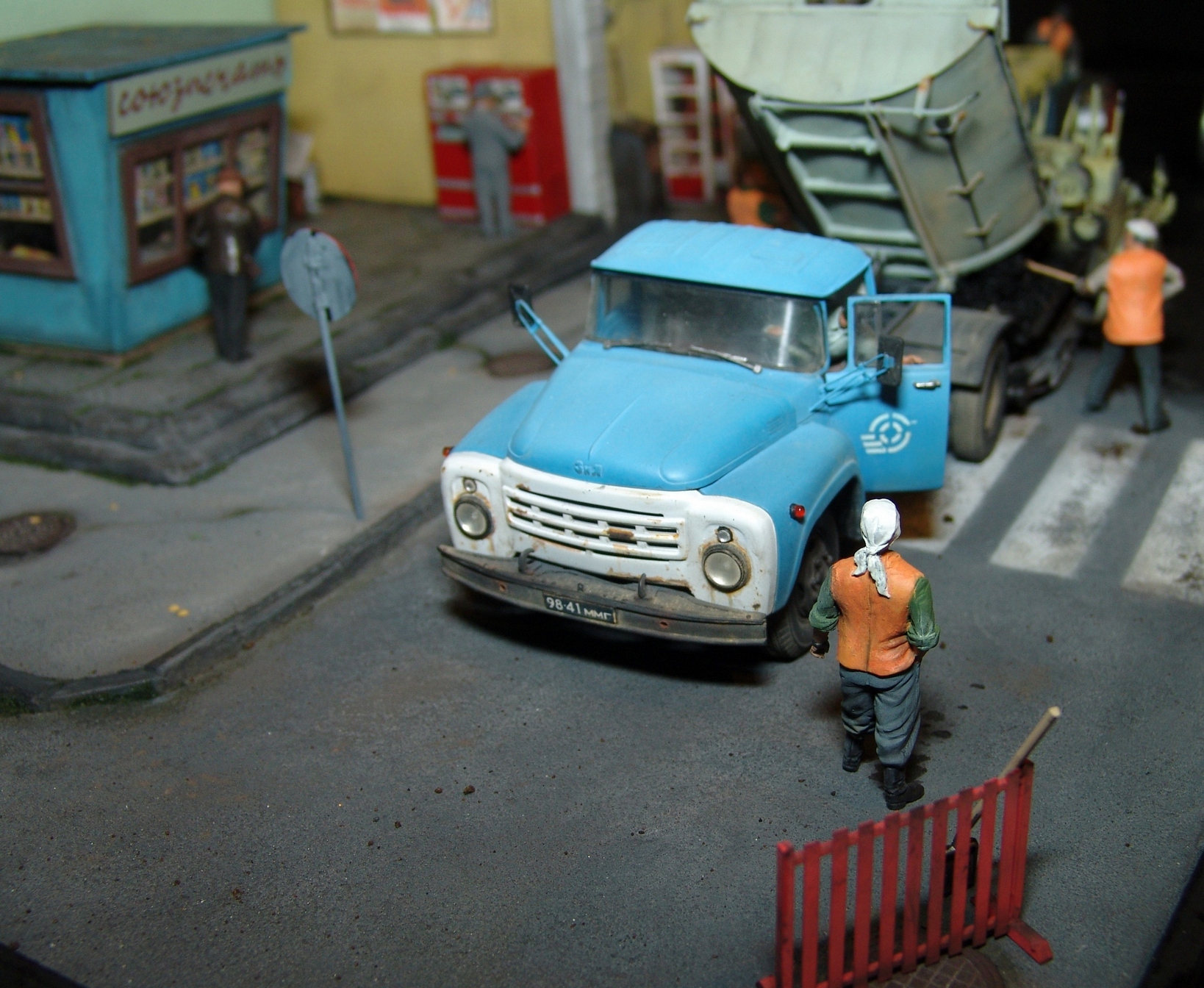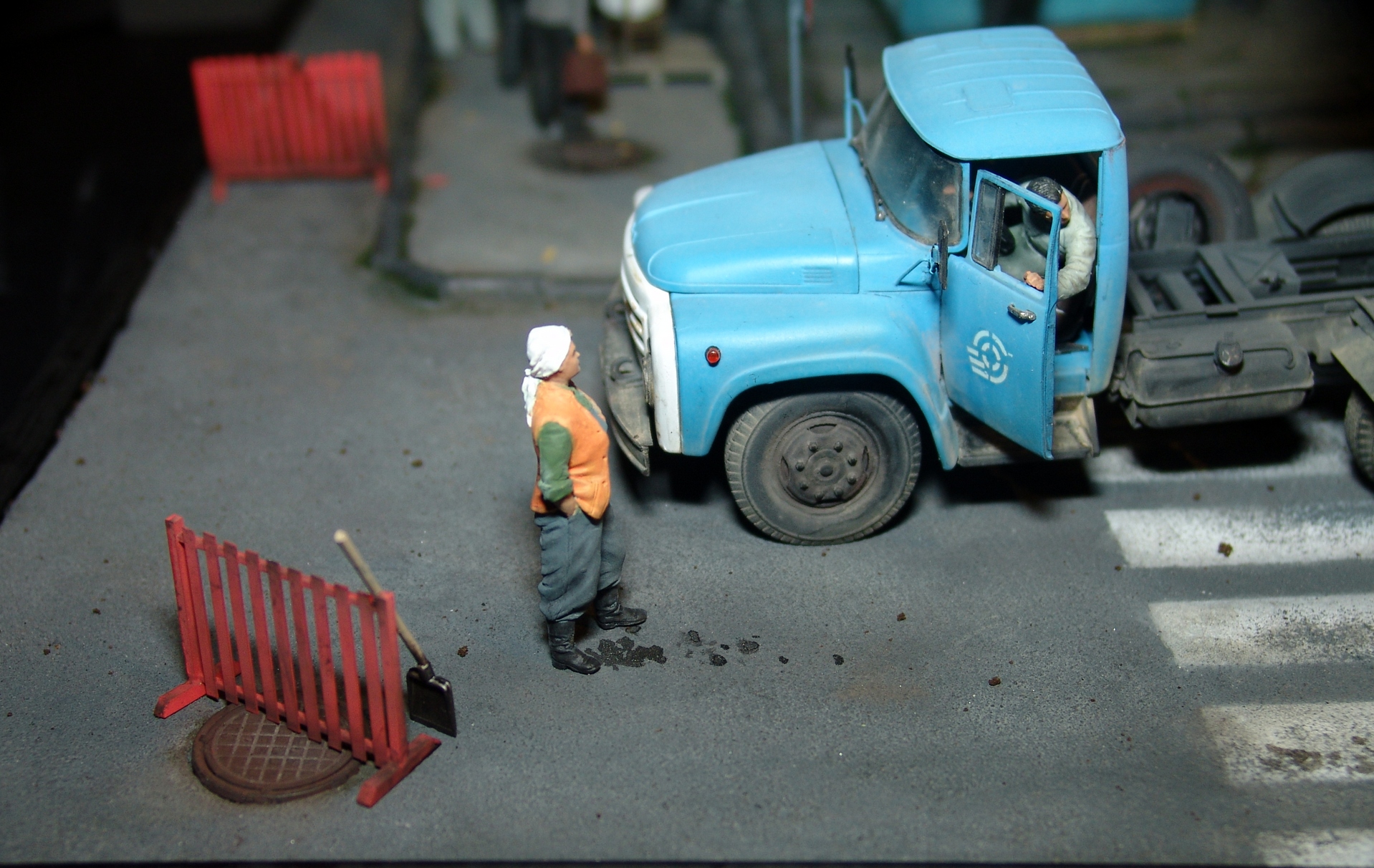 Вся диорама и часть техники самодельная, катки от ребят от Red Irons, бочка с пивом от Кастомфактори и другая мелочевка от различных модельных фирм. Техника покрашена по цвету и с эмблемами московской строительной организации МСМ-7 Главмосинжстроя, которая и занималась прокладкой новых дорог в городе.