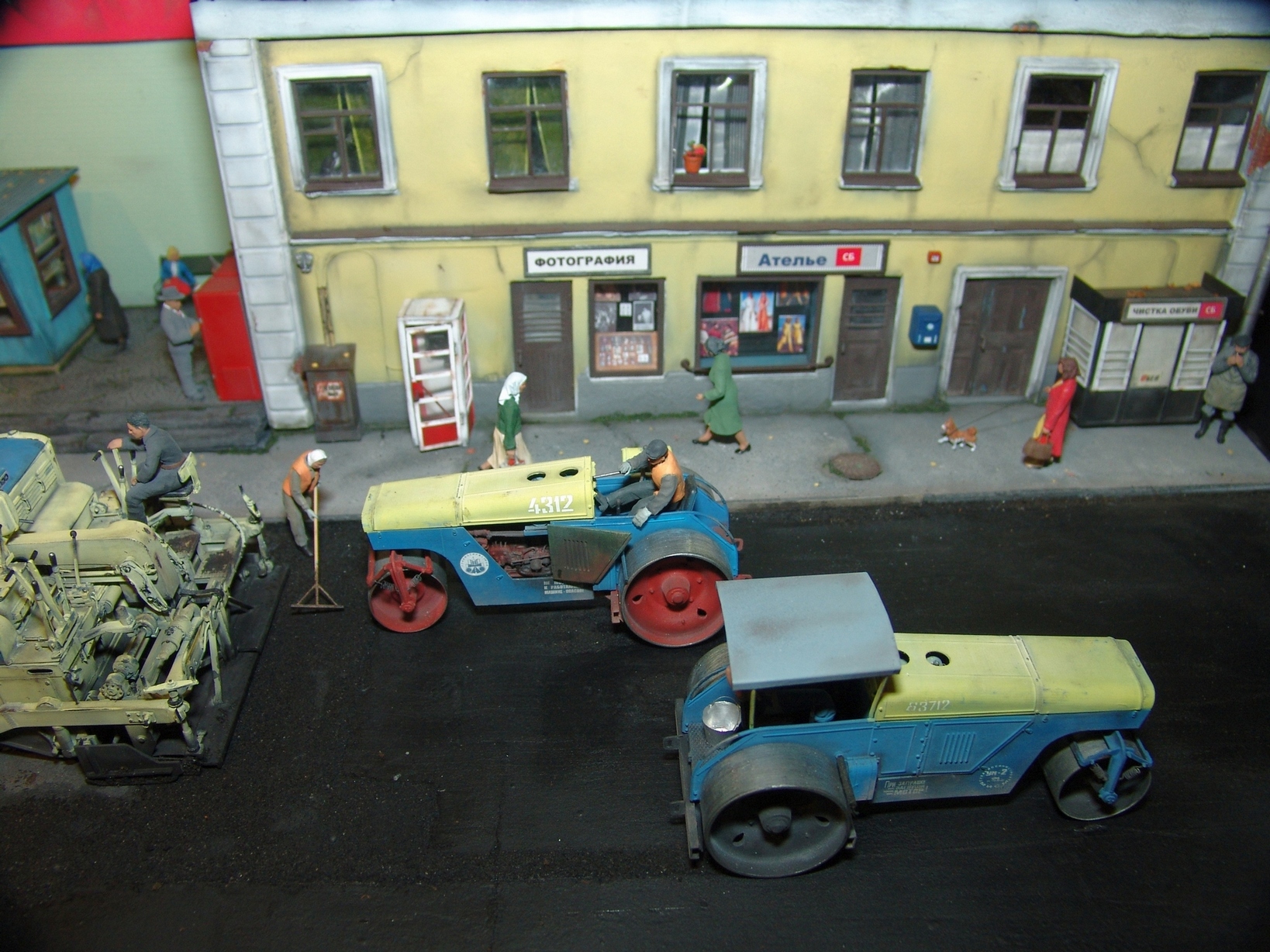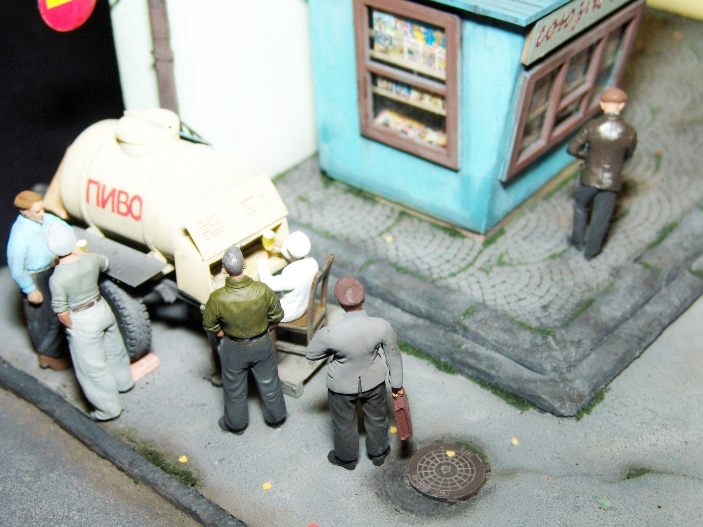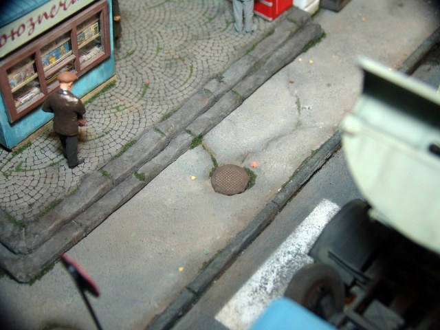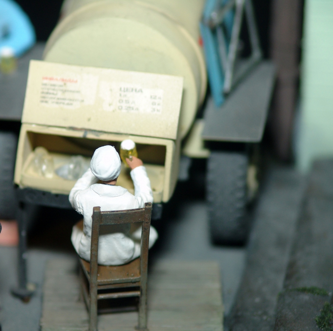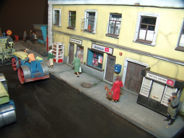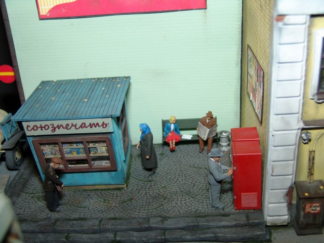 Приятная диорама. Прям отдохнул от войнушек и вдохнул запах свежего асфальта))) Только несколько фигурок вносят анахронизм какой то, дворник в кирзачах больше к 20-30-м тянет, бабушки в платочках и босота с пивком. Порадовали мужички в шляпах, прям Парткома вышли)))