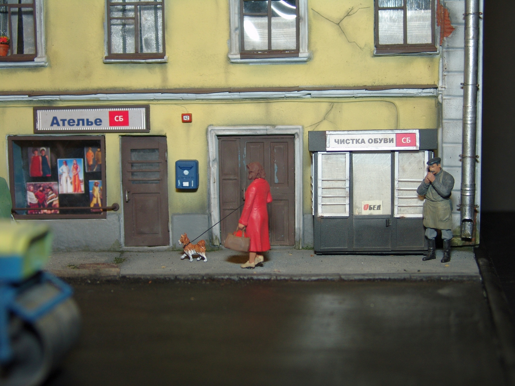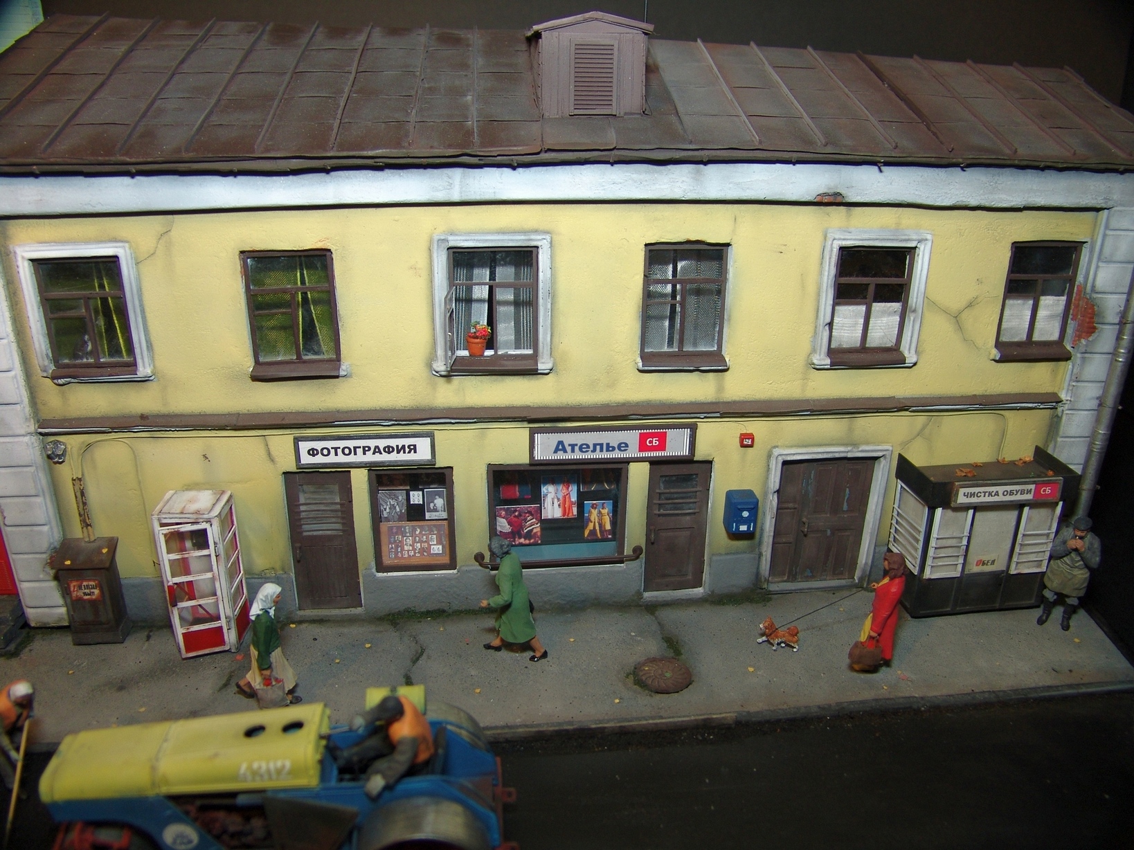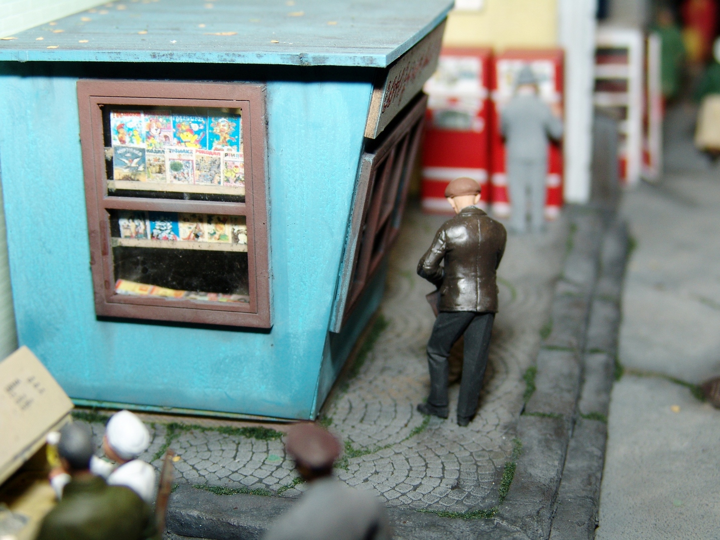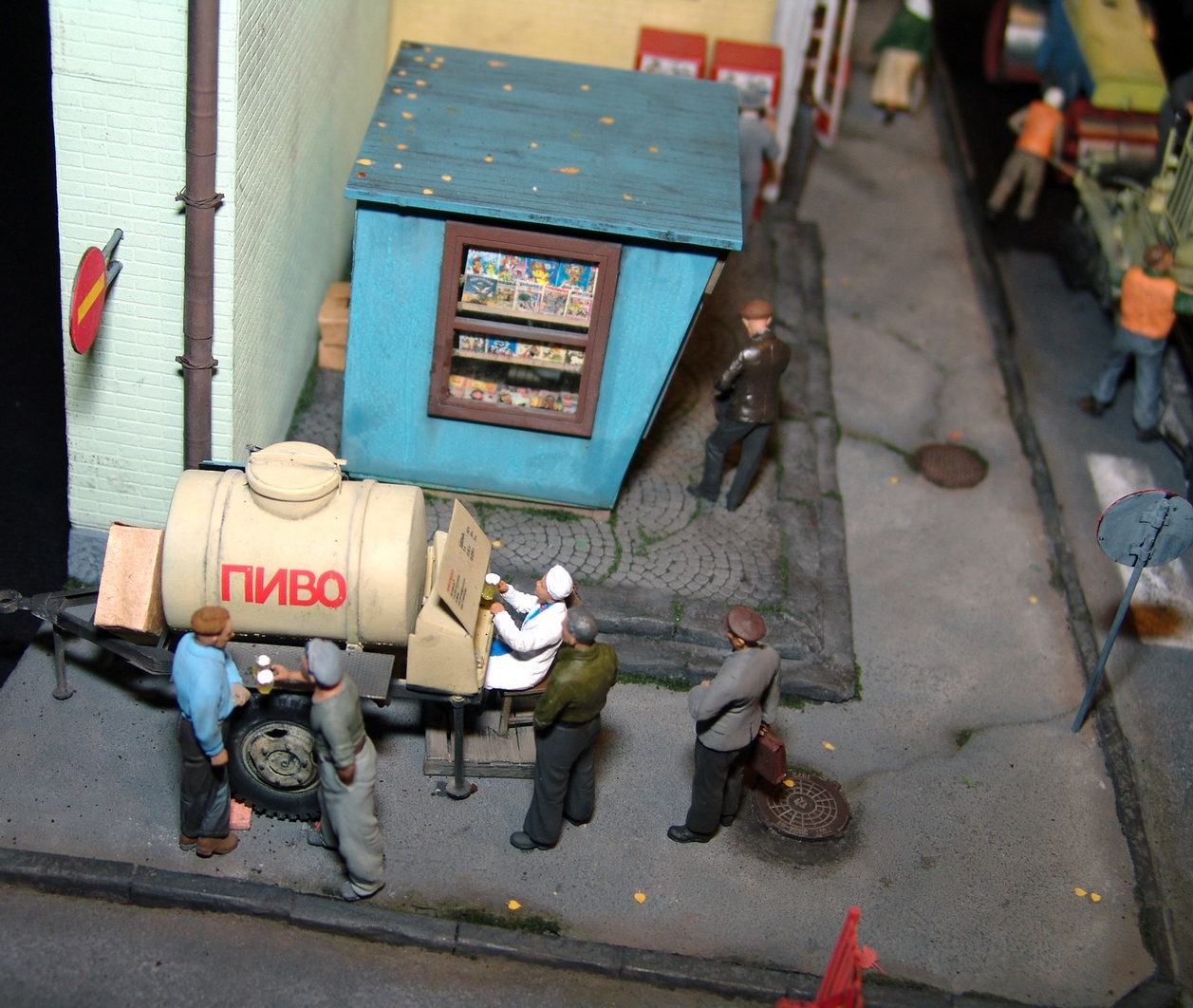 Приятная диорама. Прям отдохнул от войнушек и вдохнул запах свежего асфальта))) Только несколько фигурок вносят анахронизм какой то, дворник в кирзачах больше к 20-30-м тянет, бабушки в платочках и босота с пивком. Порадовали мужички в шляпах, прям Парткома вышли)))