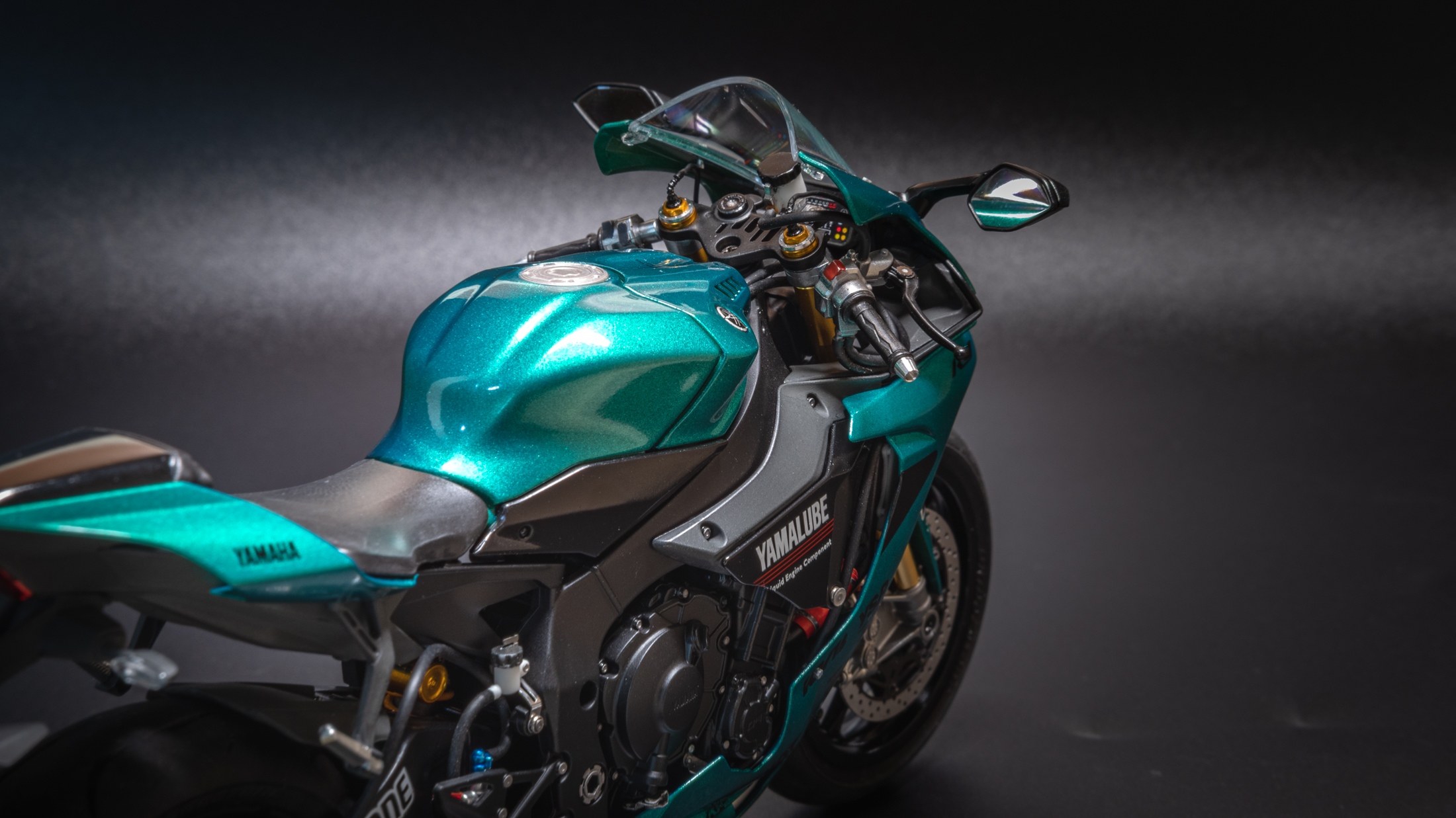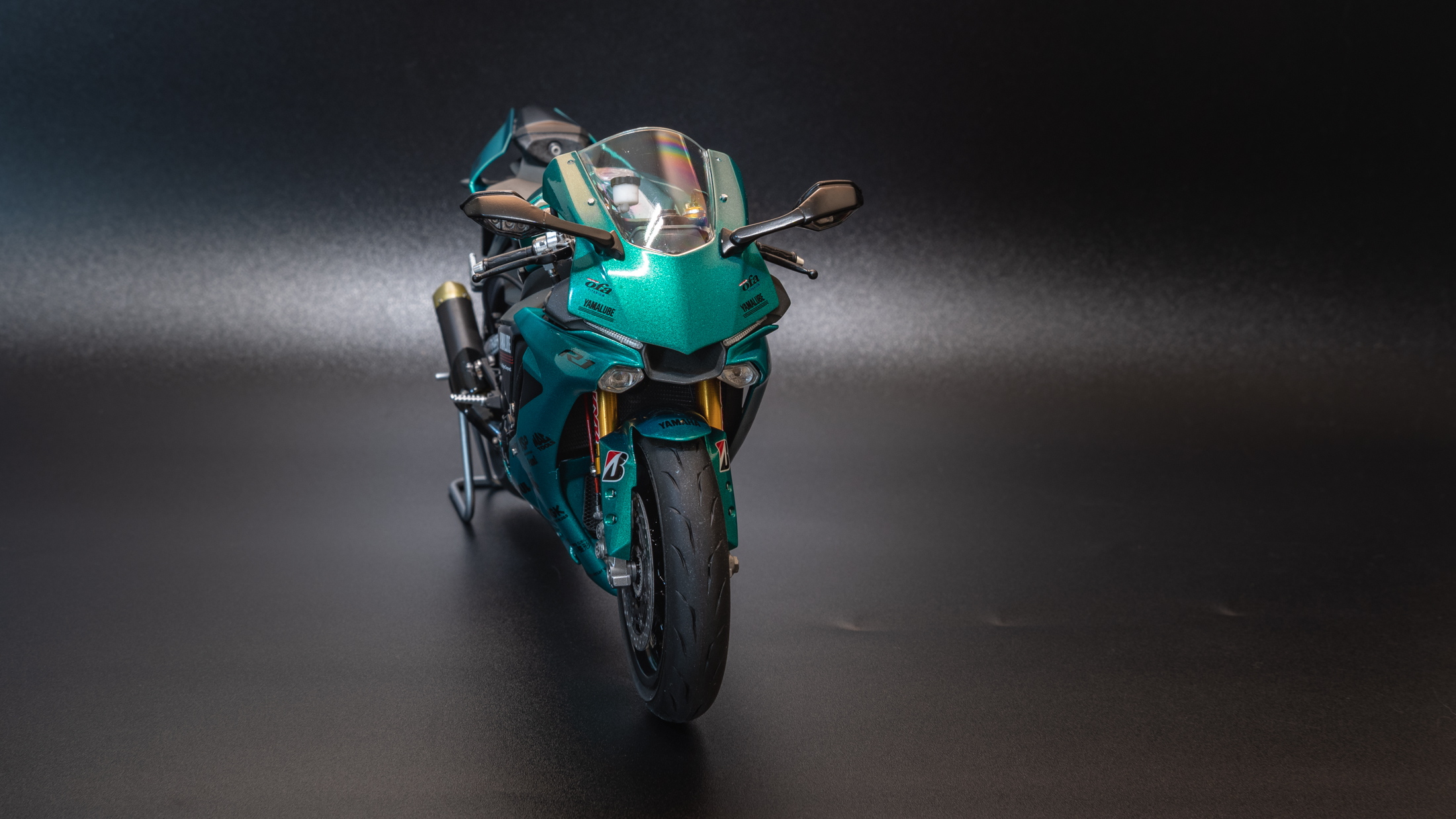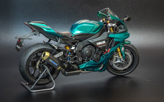 Закончил очередной мотоцикл, на этот раз новинка от Тамии Yamaha R1M. Отличный набор, вообще никаких проблем не доставил. Также прикупил к нему небольшой набор допов от Top Studio, набор с металлической передней вилкой от Тамии, и набор декалей от Studio 27. Красил акрилом и LP Тамии. Лак также LP. Основной цвет Mr. Color Metallic Green. Камеры (пробовал на 3-х разных) почему то не передают настоящий цвет, на самом деле он полностью зеленый без бирюзового оттенка. Приятного просмотра!