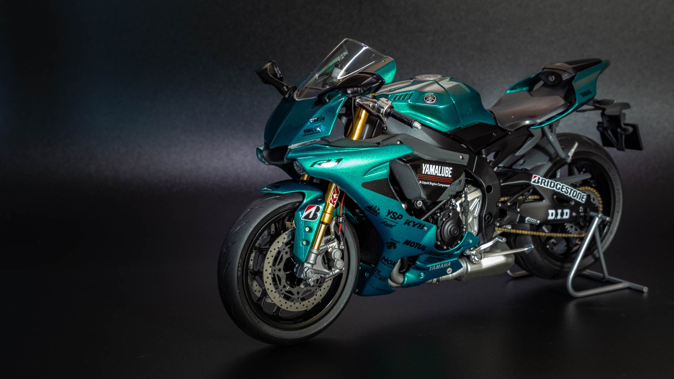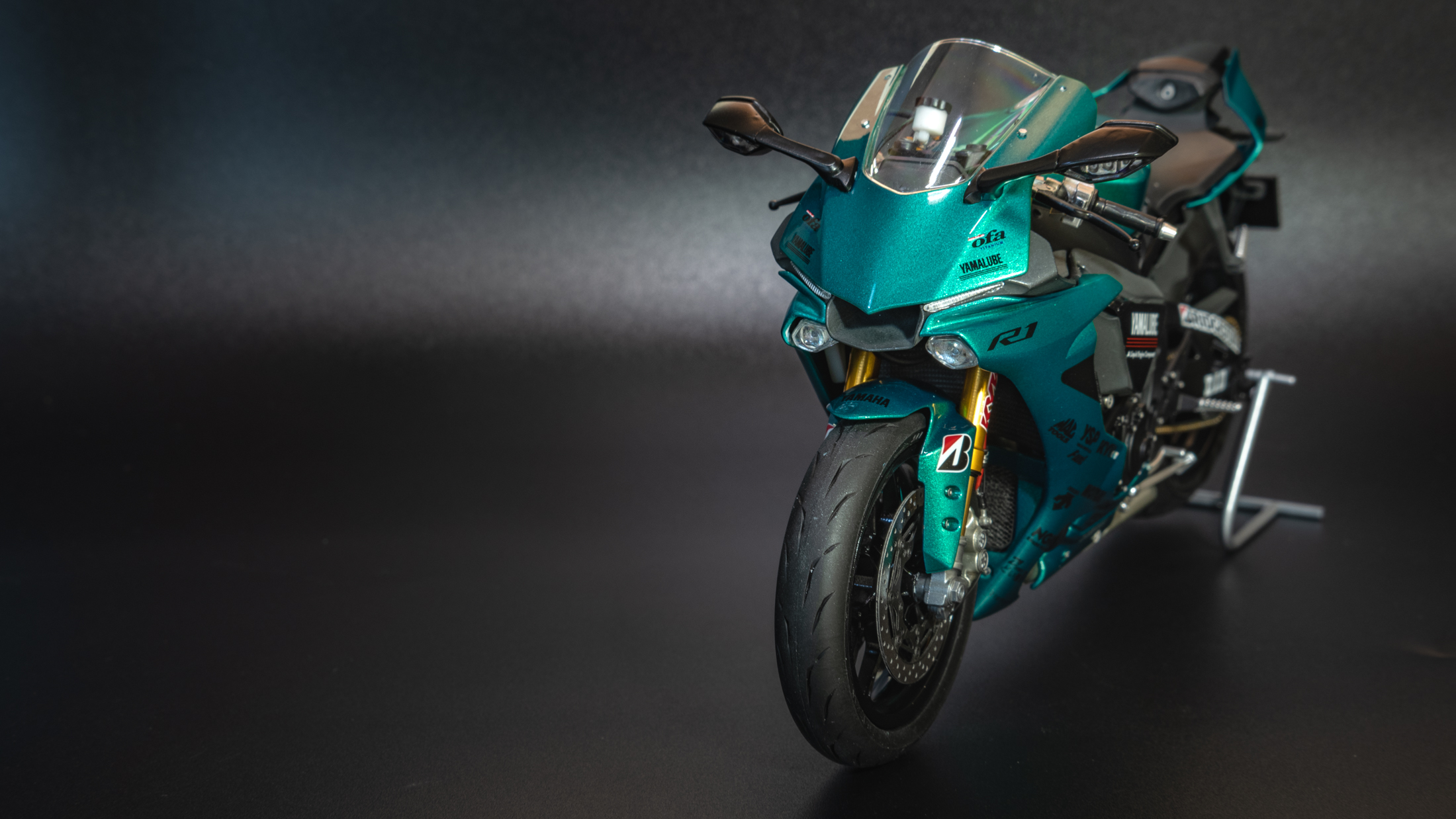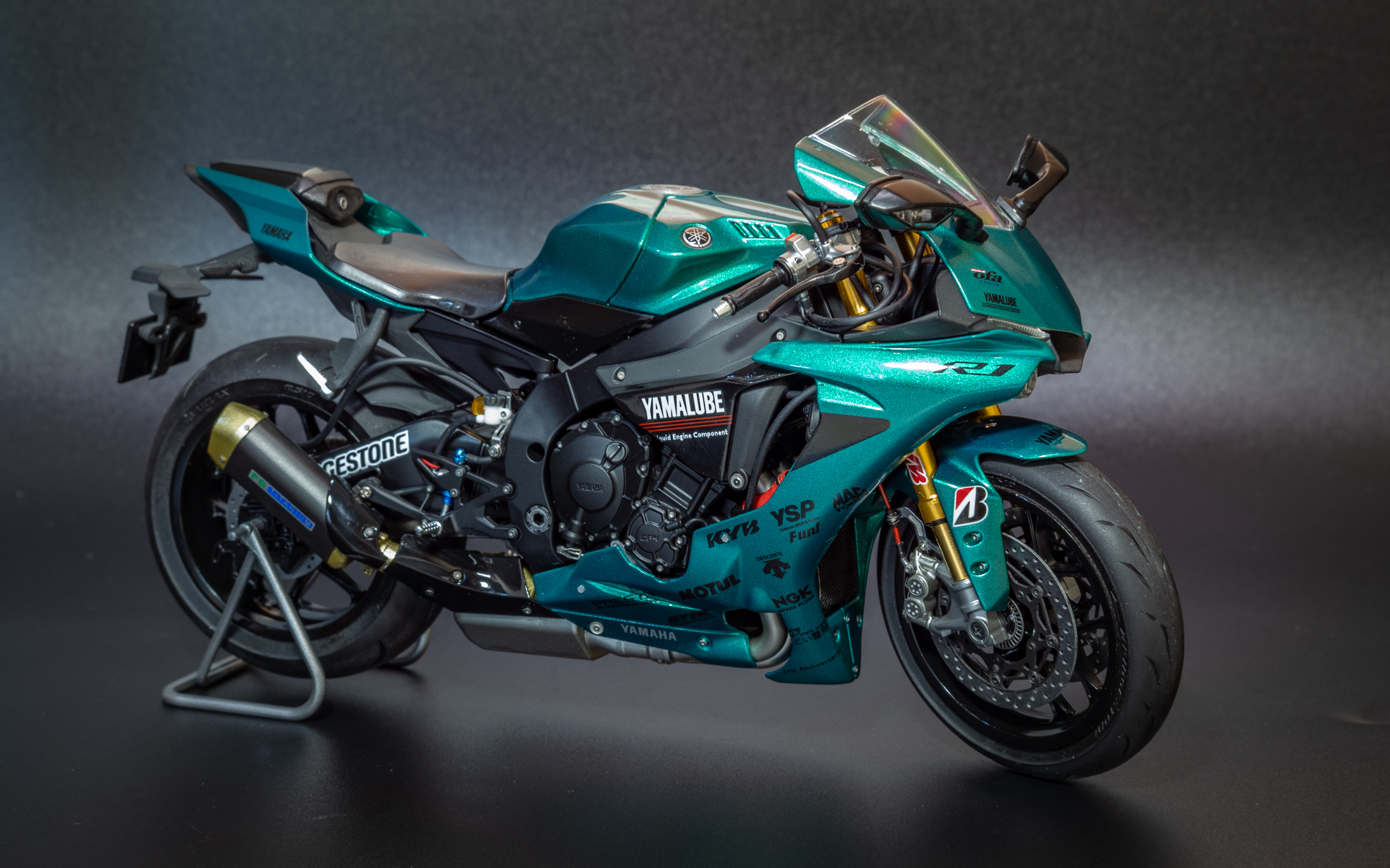 Закончил очередной мотоцикл, на этот раз новинка от Тамии Yamaha R1M. Отличный набор, вообще никаких проблем не доставил. Также прикупил к нему небольшой набор допов от Top Studio, набор с металлической передней вилкой от Тамии, и набор декалей от Studio 27. Красил акрилом и LP Тамии. Лак также LP. Основной цвет Mr. Color Metallic Green. Камеры (пробовал на 3-х разных) почему то не передают настоящий цвет, на самом деле он полностью зеленый без бирюзового оттенка. Приятного просмотра!