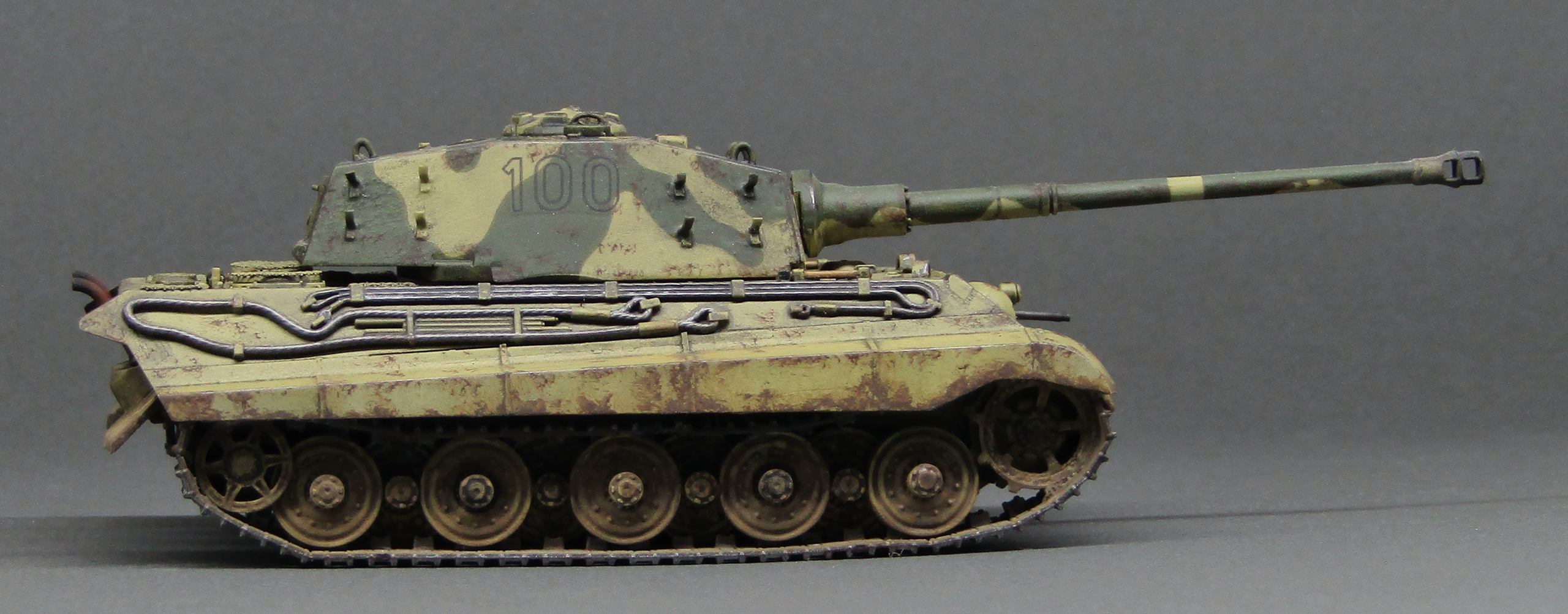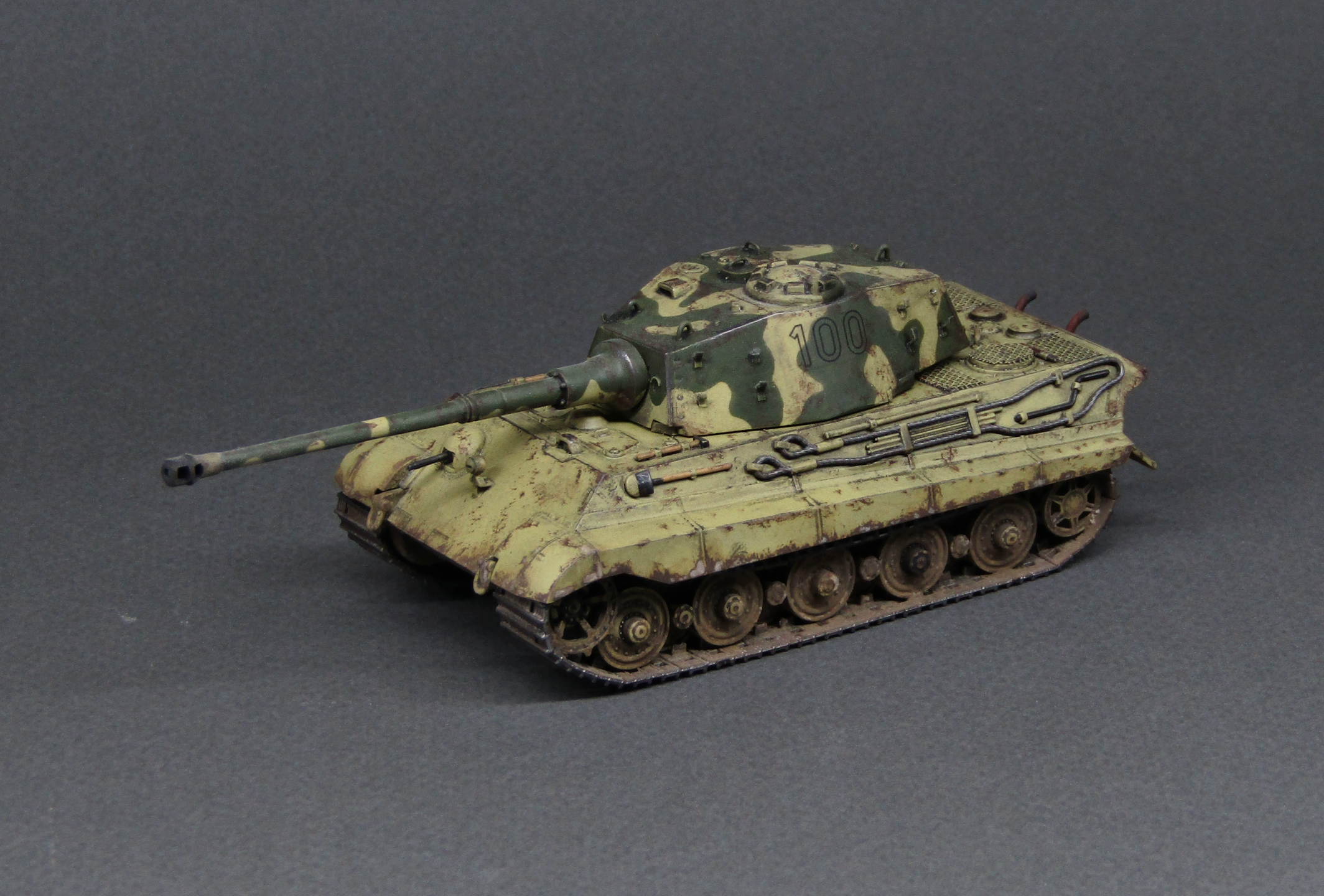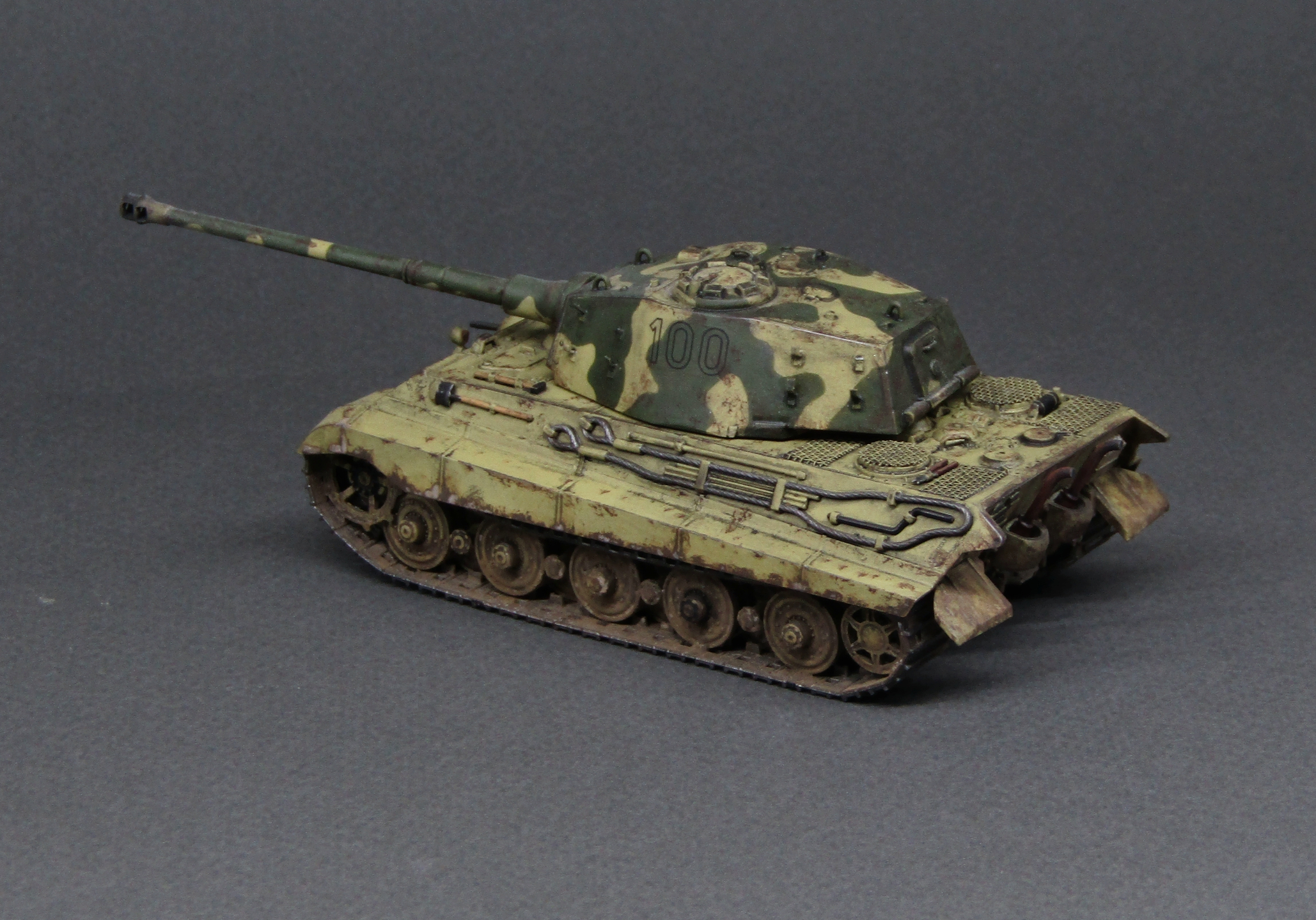 Приветствую коллеги! На этот раз захотелось немного повозиться с бронёй в 72-м масштабе. Набор всем хорошо известен, поэтому описывать не буду. За основу взял боковики королевского тигра Ausf. B оберштурмфюрера СС Липперта из 1-й роты 503-го батальона тяжёлых танков СС, Берлин, Май 1945 г. Для соответствия боковикам пришлось зашпаклевать отверстия на башне и повесить "петли" для запасных траков, также добавил сетки на МТО и заменил ручки на проволоку. Декали "100" заказывал у Алексея Бацких. Грунтовал серой Ганзой, красил акрилами от АКАН'а, смывал тамией. Добавил немного сколов и пигментов от Zip maket. Финишное покрытие матовым лаком от revell. Вот собственно и всё, приятного просмотра...