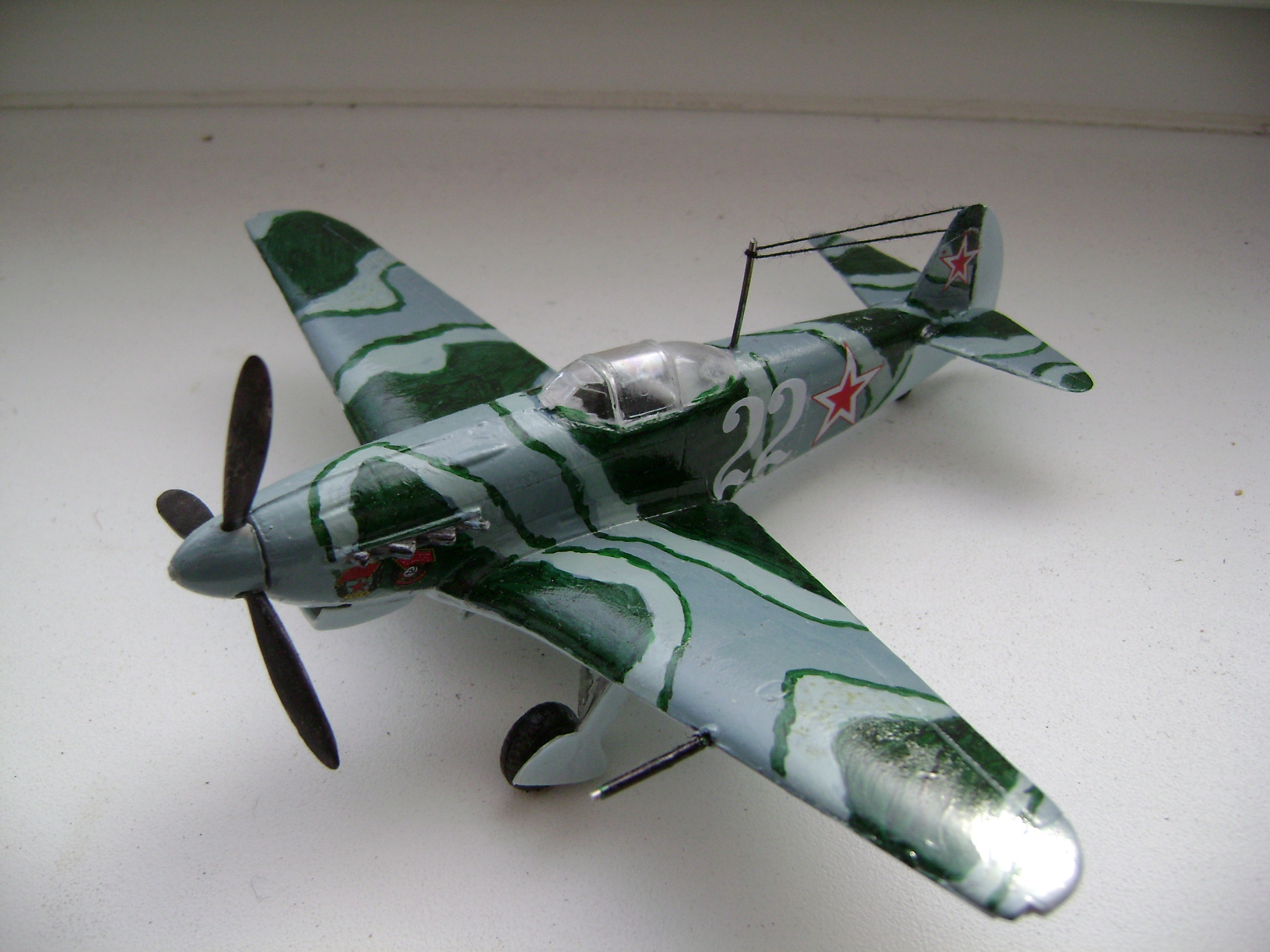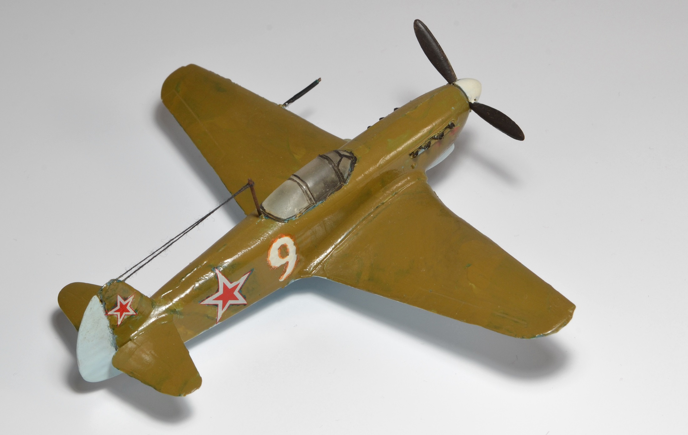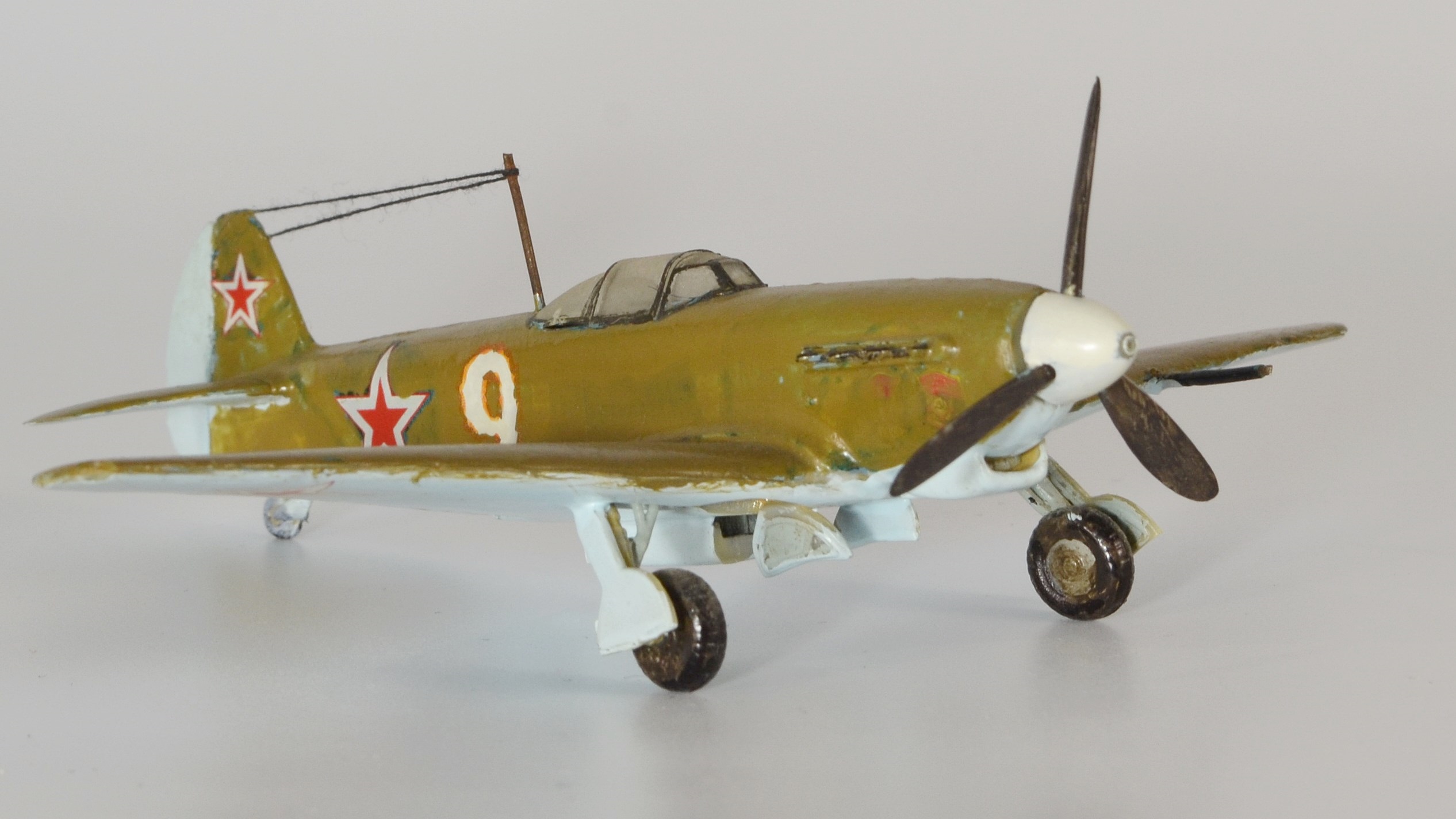 Однажды, когда, я надеюсь, мои навыки достигнут профессионального уровня, буду показывать эти снимки начинающим коллегам, приговаривая, что мастерами не рождаются! Это ответ на ваш немой вопрос: "Для чего я выкладываю сюда эту "красоту"?")) 2011 год.Только что собран Су-33 от Звезды (см. предыдущий альбом). Видимо, заметив огонек в моих глазах, моя тогдашняя подруга решила подарить еще один набор на какой-то праздник. Помню, говорит: "Присмотрела тебе самолетик с именем Павел на борту (Ту-160 "Павел Таран" от Звезды), но когда пришла второй раз в магазин, его уже не было, так что взяла то, что попалось под руку, держи!" Под руку ей тогда попался Як-9 от Моделиста. Спустя годы, мысленно благодарю того покупателя, что опередил в тот день мою девушку, иначе, трудно представить в какого монстра я бы превратил красавца "Лебедя" с моим-то никаким опытом))