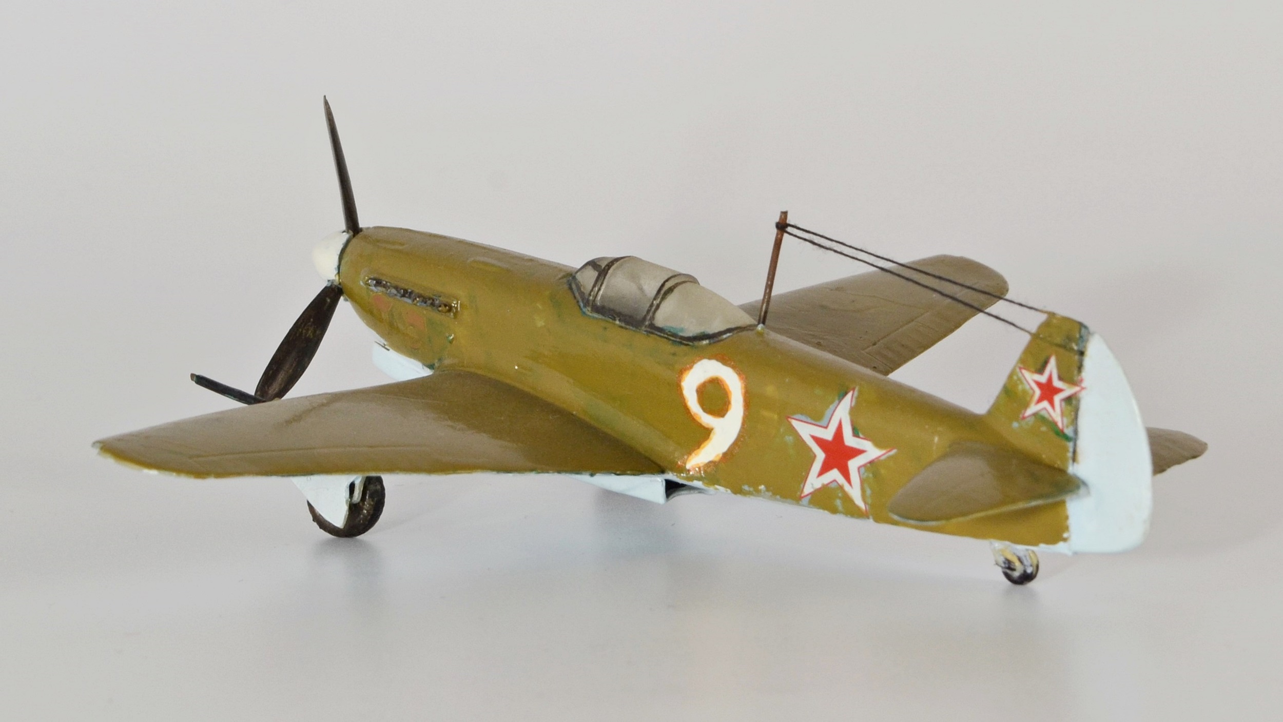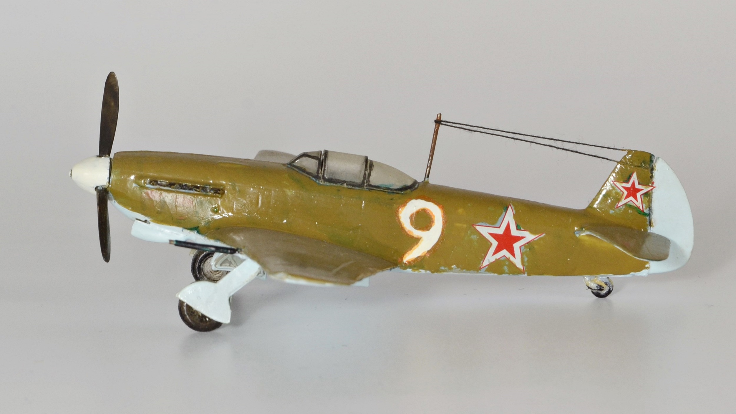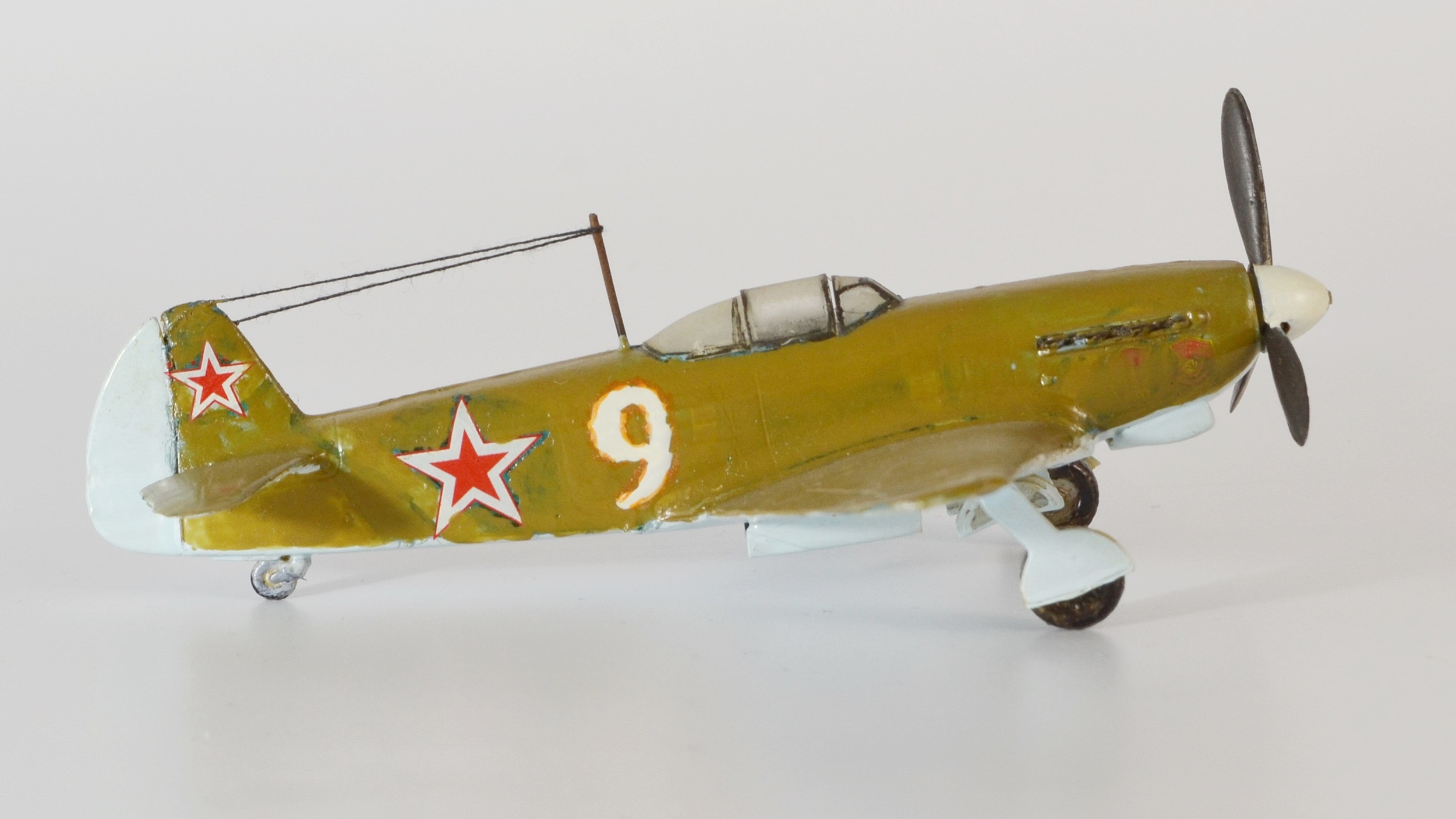 Однажды, когда, я надеюсь, мои навыки достигнут профессионального уровня, буду показывать эти снимки начинающим коллегам, приговаривая, что мастерами не рождаются! Это ответ на ваш немой вопрос: "Для чего я выкладываю сюда эту "красоту"?")) 2011 год.Только что собран Су-33 от Звезды (см. предыдущий альбом). Видимо, заметив огонек в моих глазах, моя тогдашняя подруга решила подарить еще один набор на какой-то праздник. Помню, говорит: "Присмотрела тебе самолетик с именем Павел на борту (Ту-160 "Павел Таран" от Звезды), но когда пришла второй раз в магазин, его уже не было, так что взяла то, что попалось под руку, держи!" Под руку ей тогда попался Як-9 от Моделиста. Спустя годы, мысленно благодарю того покупателя, что опередил в тот день мою девушку, иначе, трудно представить в какого монстра я бы превратил красавца "Лебедя" с моим-то никаким опытом))