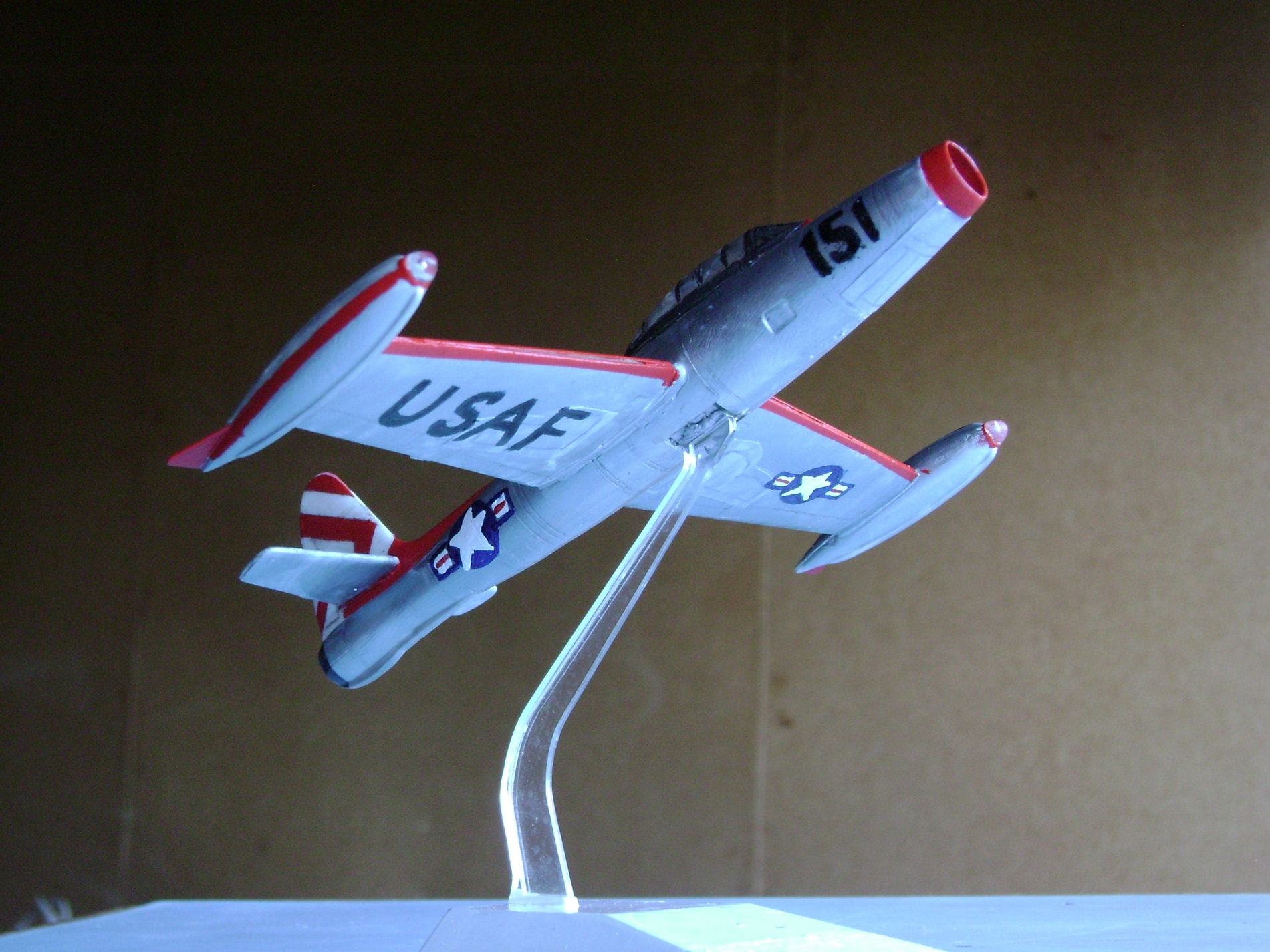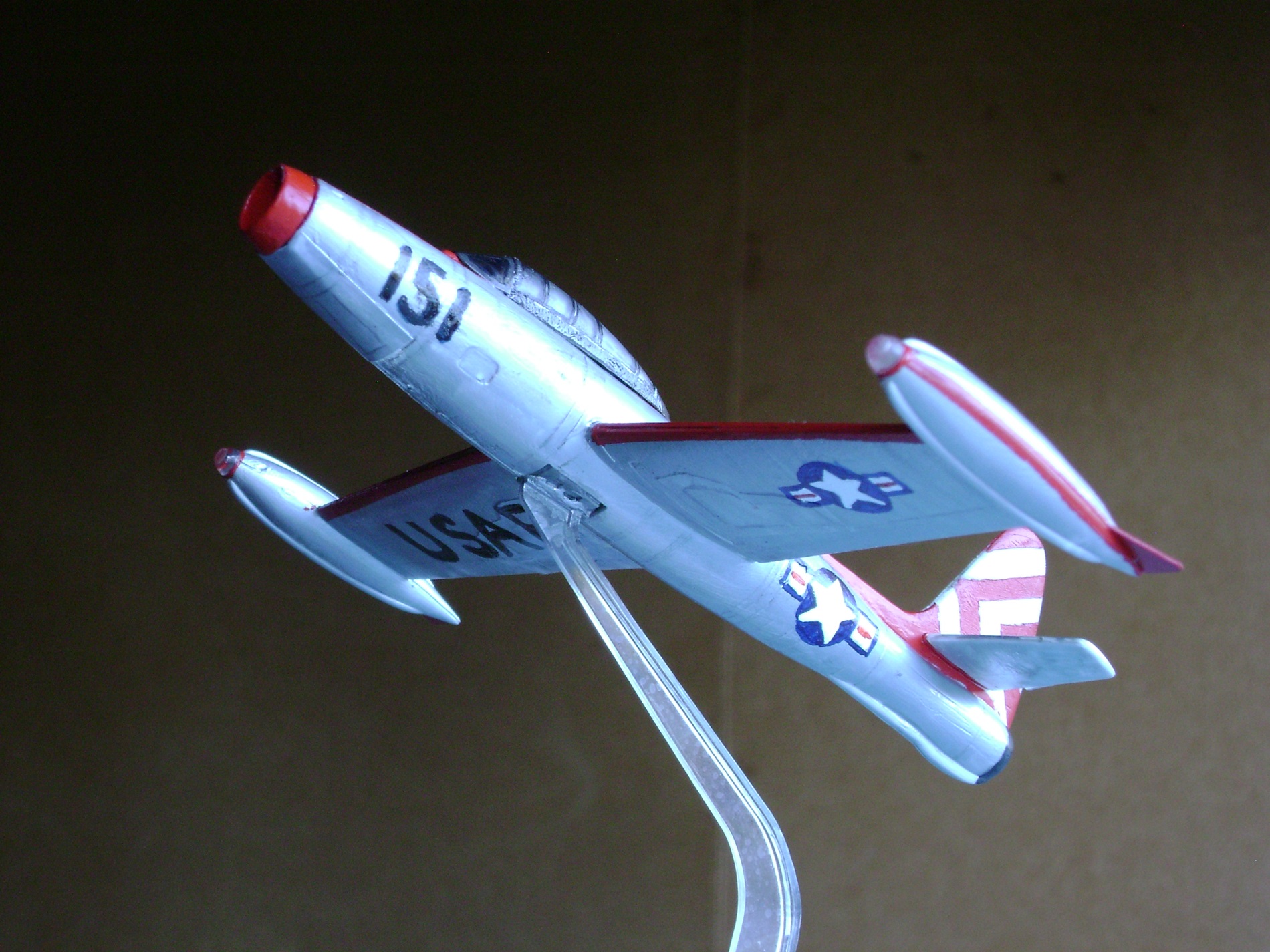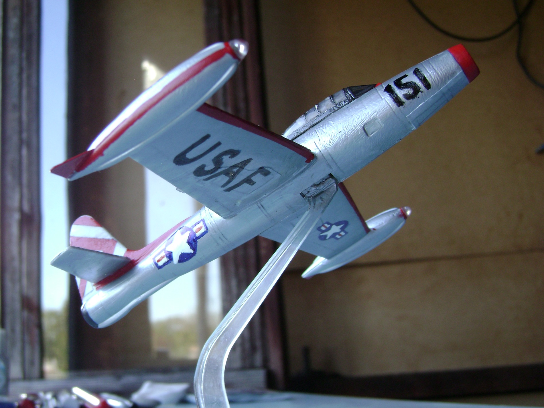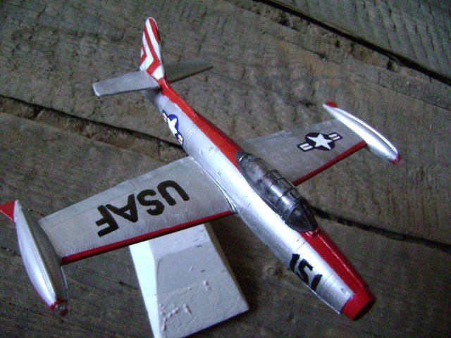 А был еще такой случай. 2015 год. С момента своей последней постройки прошло почти 5 лет. В тот год отдыхал в отпуске на малой родине у родителей. Разбирая коробку со старыми вещами, заметил небольшое чудо - полуразвалившуюся модельку F-84. "Бедненький ты мой!" - аккуратно освободив от хлама, держал в руках самолетик, словно выпавшего из гнезда птенца... (Будучи школьником, после сборки самой первой своей модели (МиГ-29 от Monogram, находится на реконструкции), получил в подарок от кого-то из родственников еще один набор для сборки. Но тот "Реактивный гром"(Thunderjet) меня особо не впечатлил - ни размером, ни формами. Кое-как слепив половинки деталей, отправил ее в свободное существование...) "Надо бы привести тебя в порядок!" Производителя набора так и не смог идентифицировать. Могу лишь сказать, что оригинальный пластик был белого цвета, а родная декаль содержала бортовой номер FS-306 и бело-голубые треугольные полосы на киле. Шасси со временем отвалились и потерялись - сделал полетный вариант; также не хватало передней части фонаря - вырезал и согнул из пластиковой бутылки. Результат соответствовал моему тогдашнему уровню, но всё лучше, чем было. Грела мысль, что даешь предмету вторую жизнь, пусть даже в таком виде. С собой забирать не стал, оставил там, где он первоначально увидел свет) Переделывать в третий раз не вижу смысла - если вдруг захочу F-84 в коллекцию, то однозначно новый набор, с нуля и собирать по всей науке...
