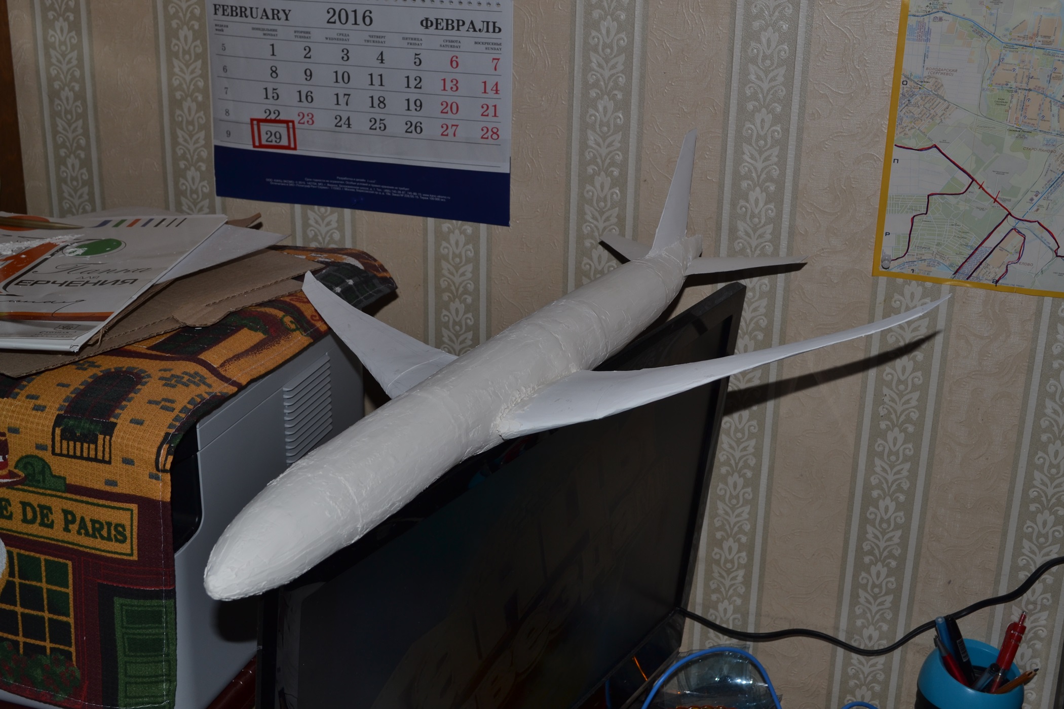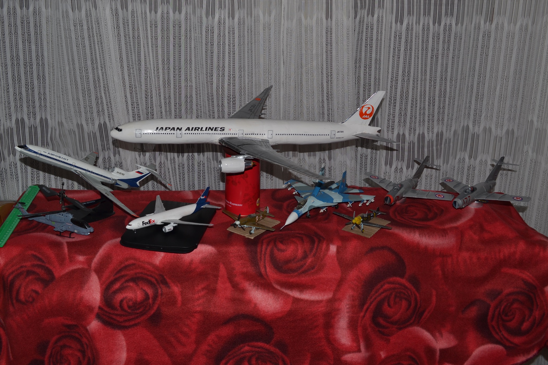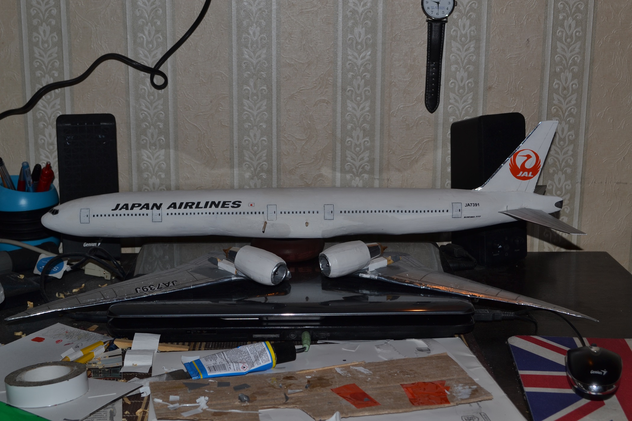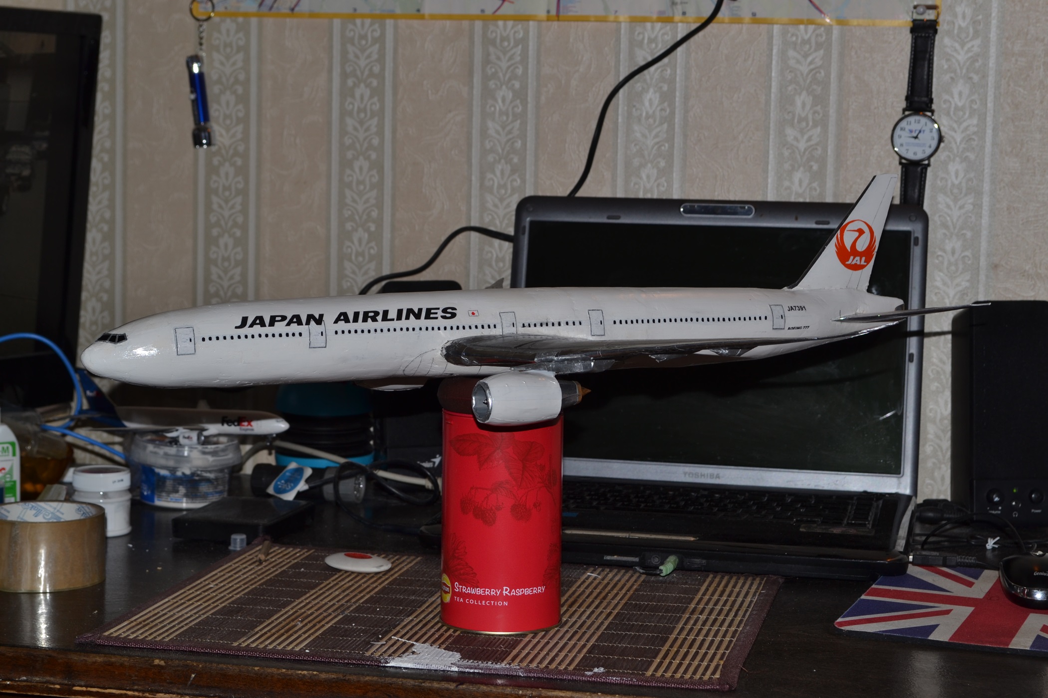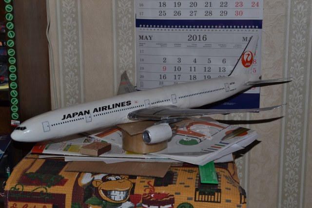 Продолжим. Конец 2015 года и весь 2016 решил попробовать собирать модели из бумаги. К подобным экспериментам подтолкнуло приобретение принтера для домашних нужд. Кроме того, вспомнил, что в детстве была книжка с моделями самолетов ВОВ: к плоскому рисунку фюзеляжа надо было приклеить такие же плоские крылья и стабилизаторы. А также настольная игра "Аэропорт" - там немного сложнее, но суть та же - 2D-шные картонные модели техники и зданий на игровом поле с имитацией ВПП и рулежек. Думал в интернете есть сканы тех изданий, хотелось распечатать, склеить, поностальгировать... Но все, что нашел - пару упоминаний об "Аэропорте", даже без картинок. Зато было очень много других выкроек для склейки из бумаги - от самых простых, плоских, и до всяких сложных, для продвинутых моделистов. Там вообще целая индустрия, как выяснилось. Более того, даже вспомнил, что мне когда-то дарили 2 номера от "Халински": Су-27 (выпуск 96 г.) и японский "Зеро"(94 г.). Позже, я даже нашел то, что от них осталось - если в наборе "Сухого" не хватало двух листов (при желании можно допечатать на цветном принтере - в нэте есть сканы тех изданий - и попытаться собрать), то от японца осталась лишь обложка и листы с инструкцией. Слишком юн был тогда я для подобных вещей - не ценил, только портил)) Чуть-чуть потренировавшись на совсем простеньких моделях, решил взяться за что-нибудь посложнее. Внимание привлекли выкройки гражданской авиации от "Canon". Выбрал Боинг-777. Впринципе, если не нужна подробная детализация, а просто модель похожая на самолет, например, чтобы подвесить под потолок, то это очень неплохое издание, а моделист среднего уровня, не говоря уже о профи, сможет доработать результат этих выкроек до вполне приемлемого уровня. Мой результат, конечно, оказался не вполне приемлемым, но в итоге был получен опыт, а это самое ценное. Масштаб получился где-то 1:100. Модель уже отжила свое (бумага все-таки), выкладываю те немногие сохранившиеся снимки.