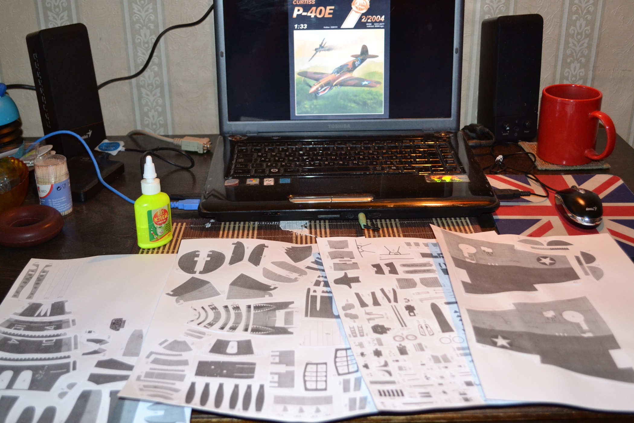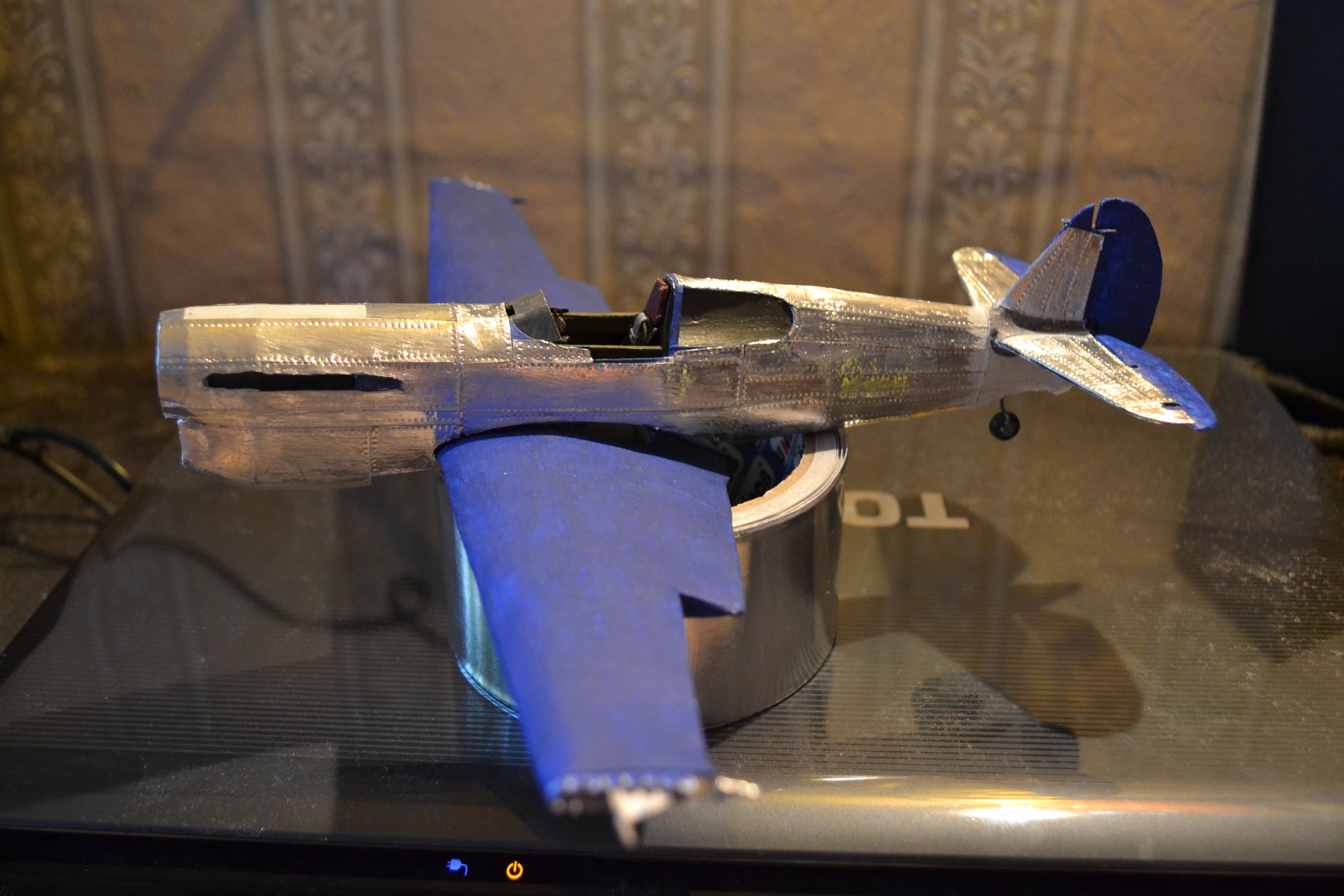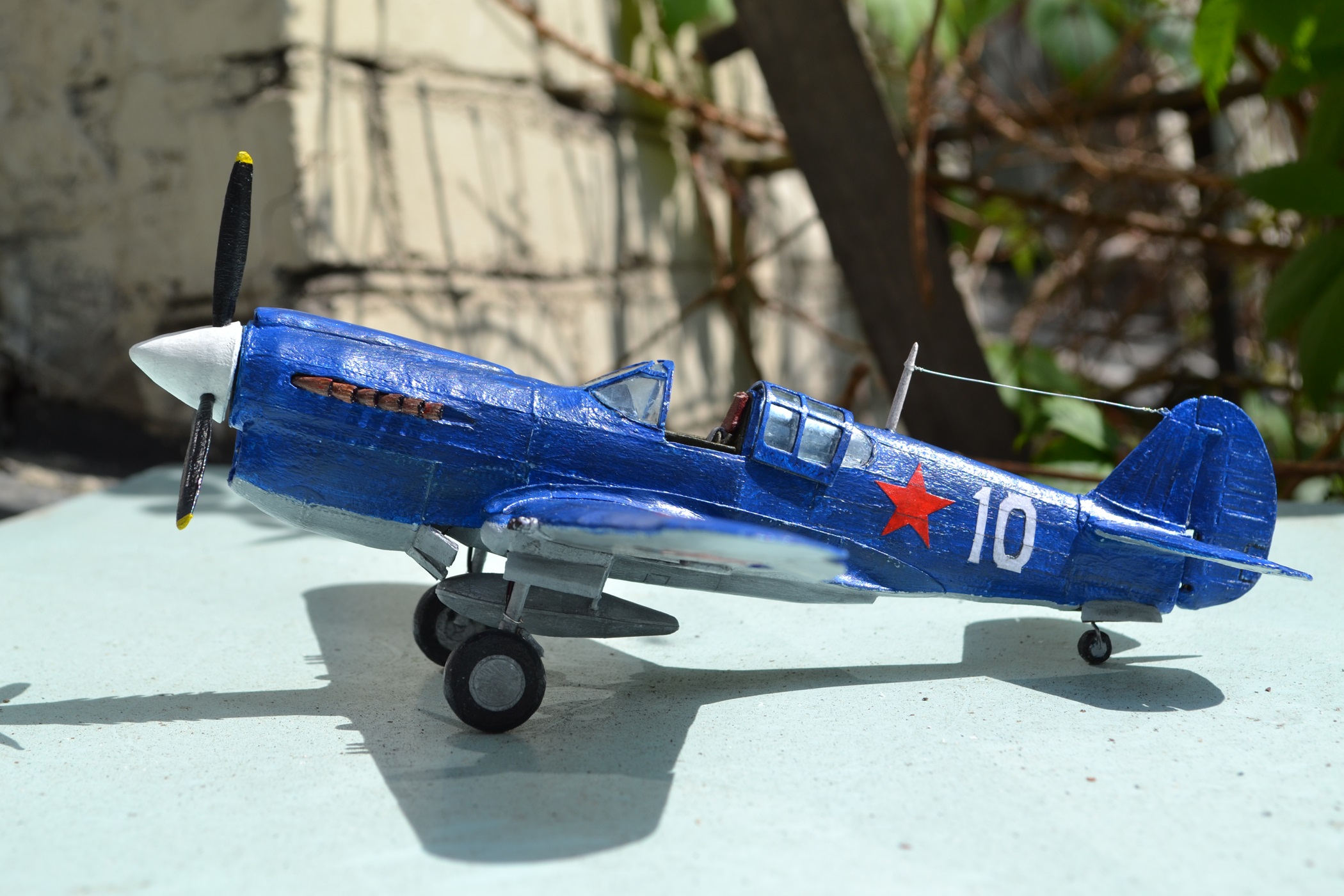 А вот еще дело было... Лето 2016 года. Решил продолжить тему самолетов, на которых летал Борис Сафонов. Заинтересовал нестандартный синий цвет его Р-40, хотя в сети было много споров, могла ли его машина действительно быть покрашена таким образом. Но я не стал заморачиваться над достоверностью и покрасил так, как нравилось самому - делал-то исключительно для себя, в свое удовольствие)). Конечно вышло грубо, конечно не хватает эстетики, но зато было приятно осознавать, что изначально это были лишь плоские бумажные листы с выкройками. Еще один шаг на пути к профессиональному моделизму. Масштаб, кстати, примерно 1:33.
