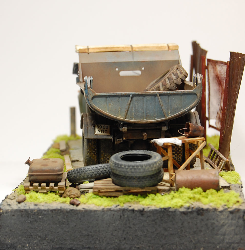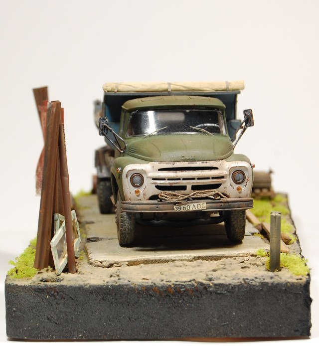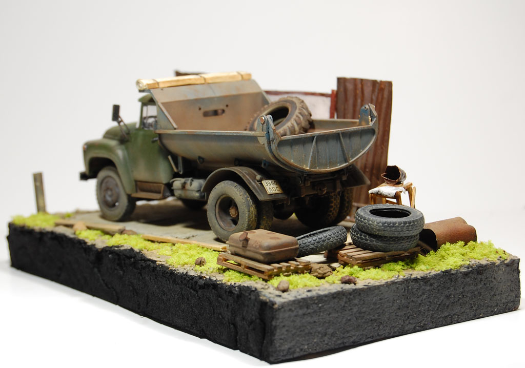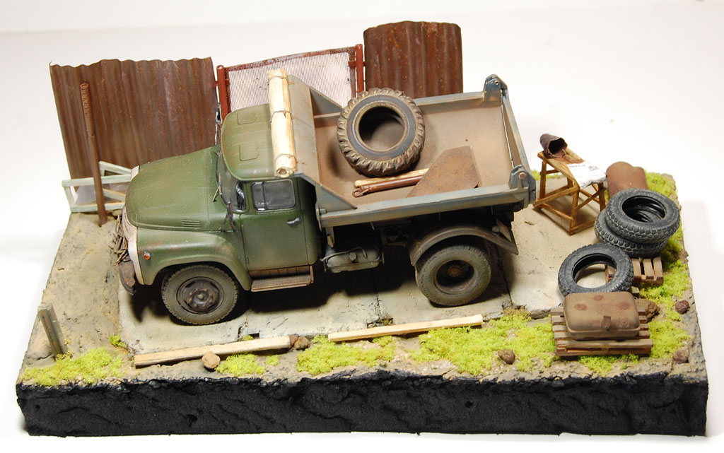 Здравия всем!ЗиЛ-130 ММЗ-555,АВД,1/43.Закончил подставку!Использовал материалы:Сметанная фольга-части забора и ведро,накидка на кузов-салфетка,поддоны,верстак и оконные рамы-палочки для мороженного,подставка-полистирол.