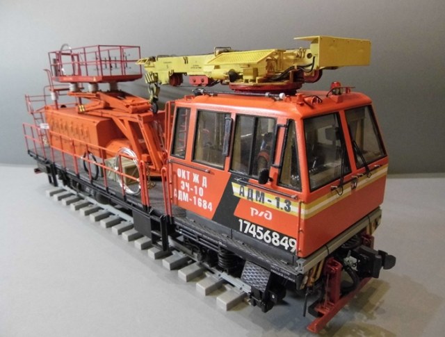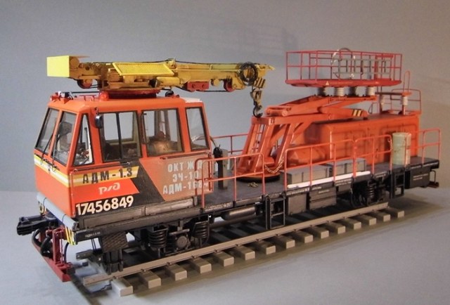 Модель ж.д. дрезины АДМ-1.3 в масштабе 1:35. Все делал с нуля, опираясь на чертежи и фотографии. Я понимаю, что сильно копийный аппарат изобразить не получится, но я старался. Длина модели 34 см (37 по осям автосцепок), а ширина 9 см. Расстояние между осями 7 метров или 20 см. Размеры капота - большой части 4120х1520, маленькой "пристроечки" 1300х1220. Высота его в пересчете 40 мм, а пристройки - 21 мм. В работе использовал Тамиевский пластик различной толщины (макс. 2 мм), а так же различные профили и стержни. Колеса выливал из эпоксидной смолы в формах из пластилина. Из афтермаркета: фары и катафоты от Эльфа, трос и цепи от RB Models. Болты, гайки, заклепки от MasterClub. Перед окраской все загрунтовано серой грунтовкой от Тамии из баллона. Окраска акрилом Тамия. Немного пигментов Mig, матовый и полуматовые лаки из баллонов. Модельный скоч для масок. Трафареты на кабину заказывал в рекламном агенстве. Приборы в кабине уменьшены с оригинала и распечатаны на принтере. Поверх наклеил обычный скотч, получились стекла. Стекла в кабине - прозрачный пластик от Тамии. Кран поворачивается, стрела выдвигается. Рабочая площадка так же поднимается вверх (к сожадению нет фиксатора). Дрезина в дальнейшем будет использована на диораме, где все будет зафиксированно на клей. Бочка и ящики не покрашены. Поставил для "массовки". Ещё будет заземляющая штанга и расчалки крепления крана, ящик с инструментом. Вот наверно и все описание...