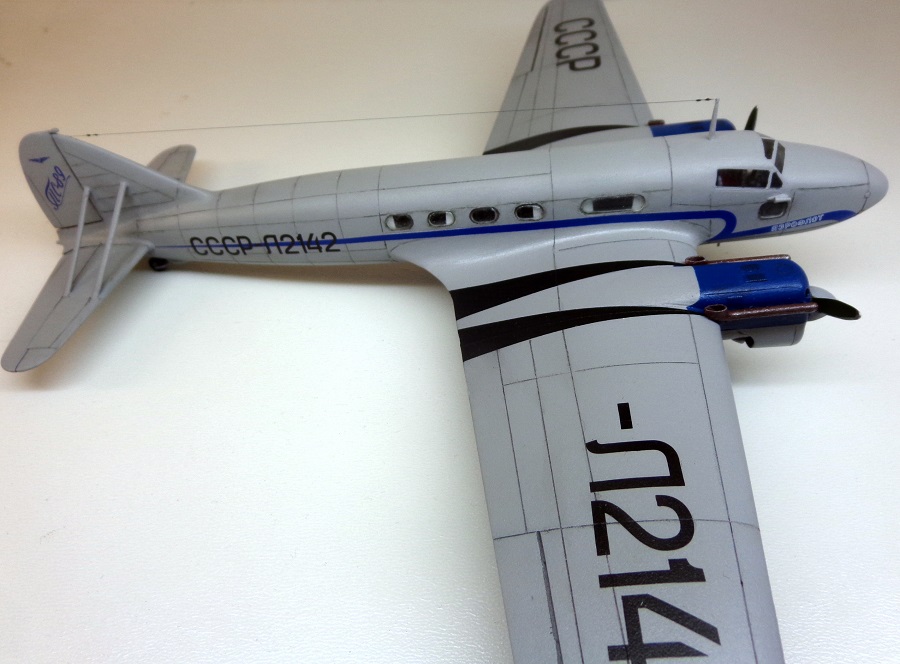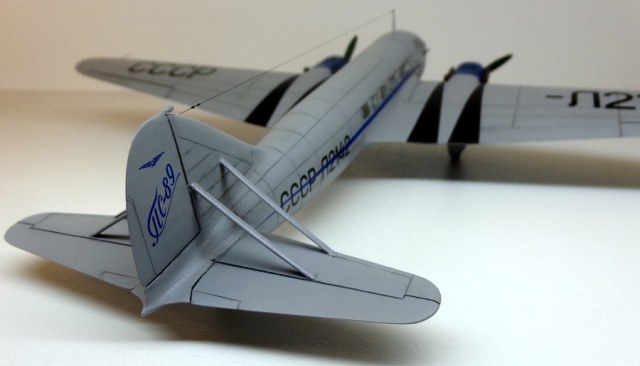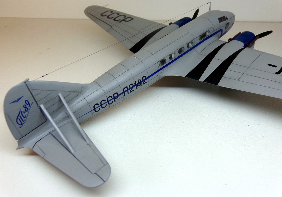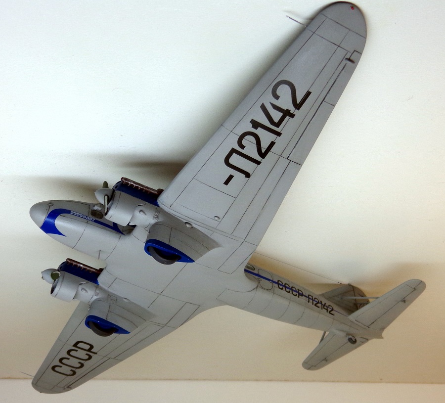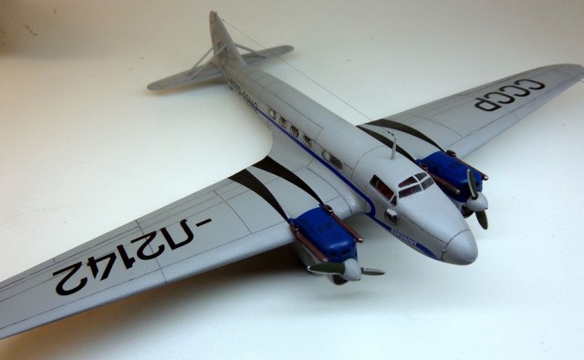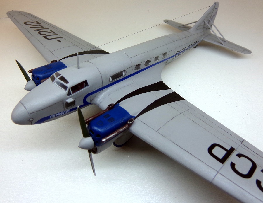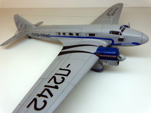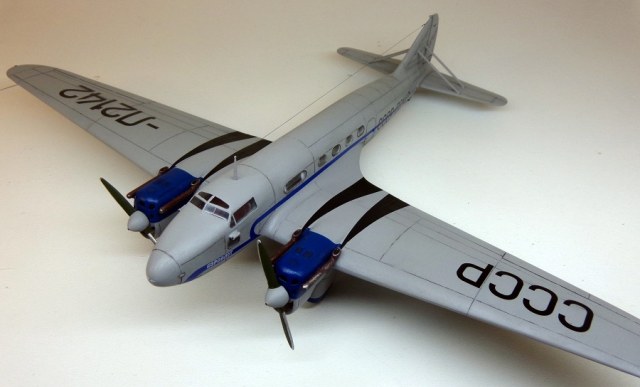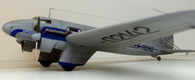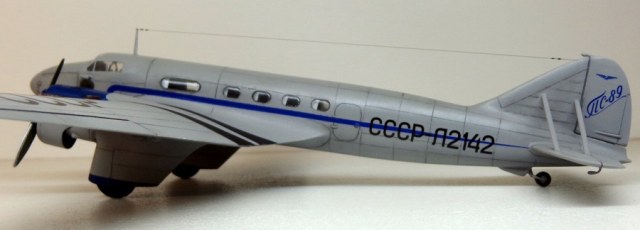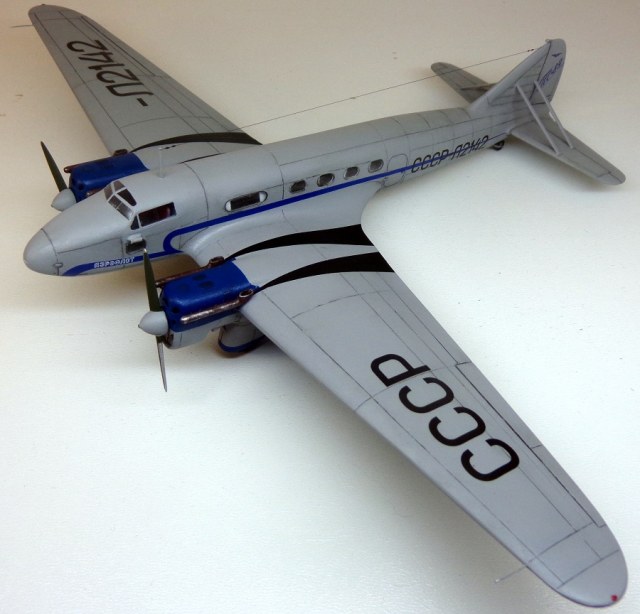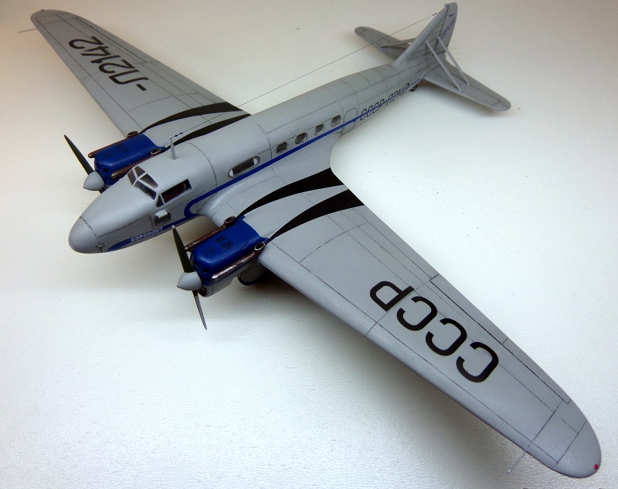 Модель из смолы от Александра Козырева, приобретена мной уже после того как мастера не стало. Сборка оказалась не сложной (а я когда-то так "боялся" подобной технологии). Были опасения по поводу вклейки остекления цианокрилом, но всё получилось относительно неплохо. Доработал некоторые отсутствовавшие мелочи. Модель более-менее удалась, но не без изъянов. В качестве прототипа выбрал борт СССР-Л2142, который отметился в истории участием в курьёзном случае на Центральном аэродроме, когда пассажиров летевших в Свердловск и Харьков перепутали и посадили (и даже уже отправили) на противоположные направления. Во время финской войны самолет использовался для перевозки раненных бойцов РККА. С началом Великой Отечественной был включен в состав 1-й эскадрильи МАГОН ГВФ. Подробности военной судьбы самолета не известны, но видимо был списан незадолго до окончания войны.