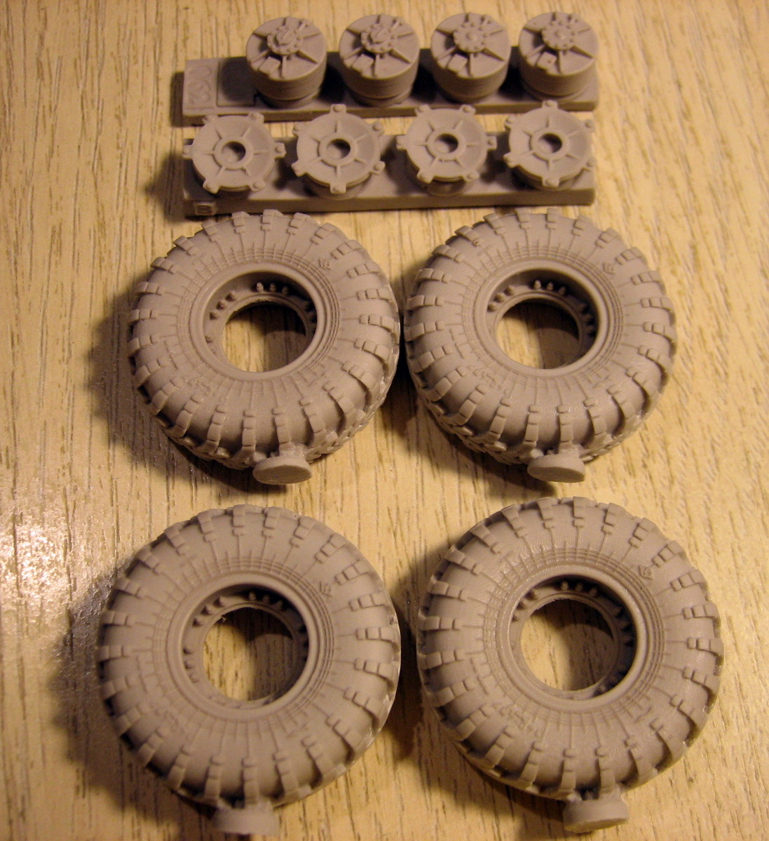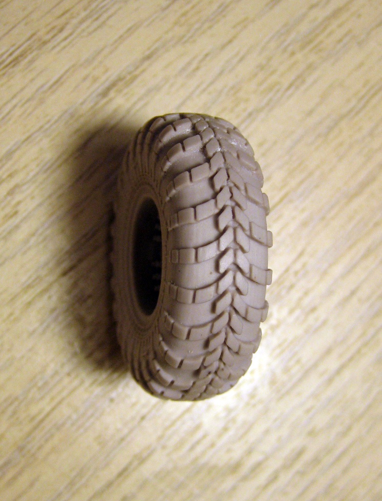 Итак, набор колёс для БРДМ-2 от MINIARM . Литьё очень понравилось. Достаточно чётко и чисто. Есть небольшие недоливы , но возле питателей, снизу и особо на модели не заметно. Как мне мажется.Протектор чёткий, глубокий. Надписи расположены в одном месте, относительно питателя. Плюс или минус , не скажу. Надписи , эмблема завода, стрелка направления присутствуют. Стрелка и эмблема читаемы, надписи(мелкий шрифт) нет. Есть небольшое "гуляние" в наружном диаметре покрышки , до 0.5 мм, но из-за богатого рисунка на боковине покрышки, это не сильно заметно.