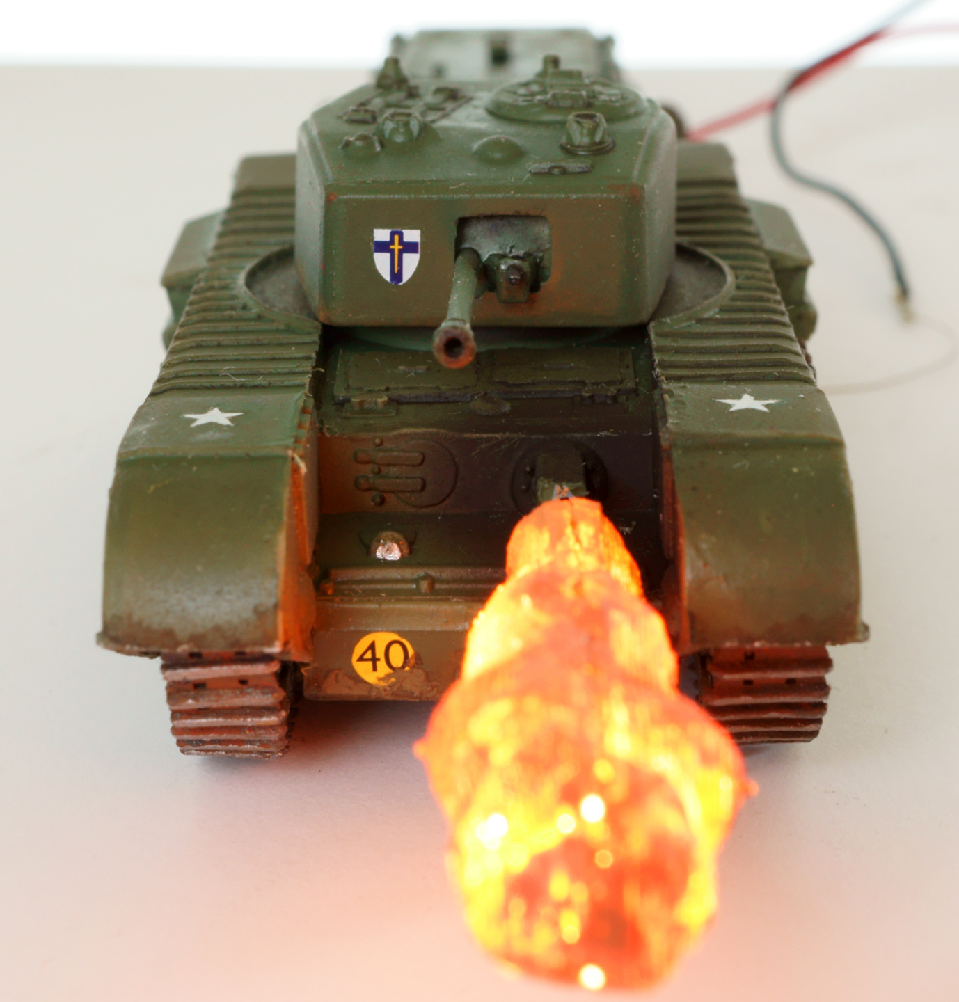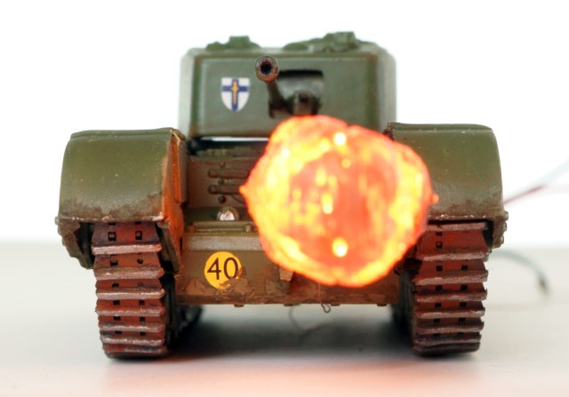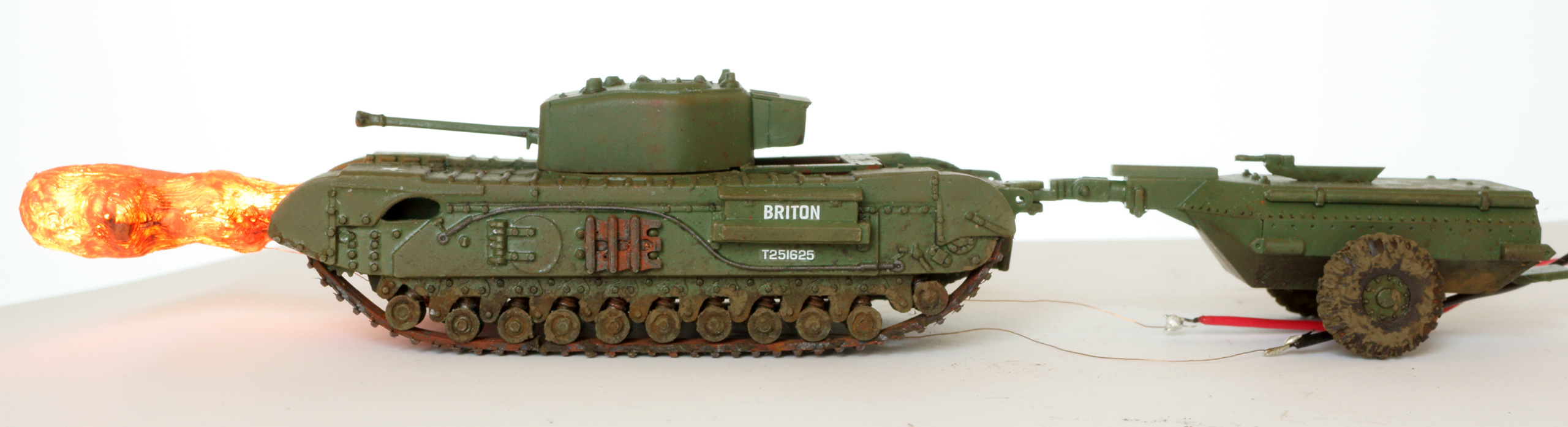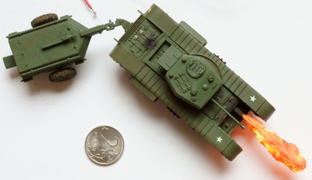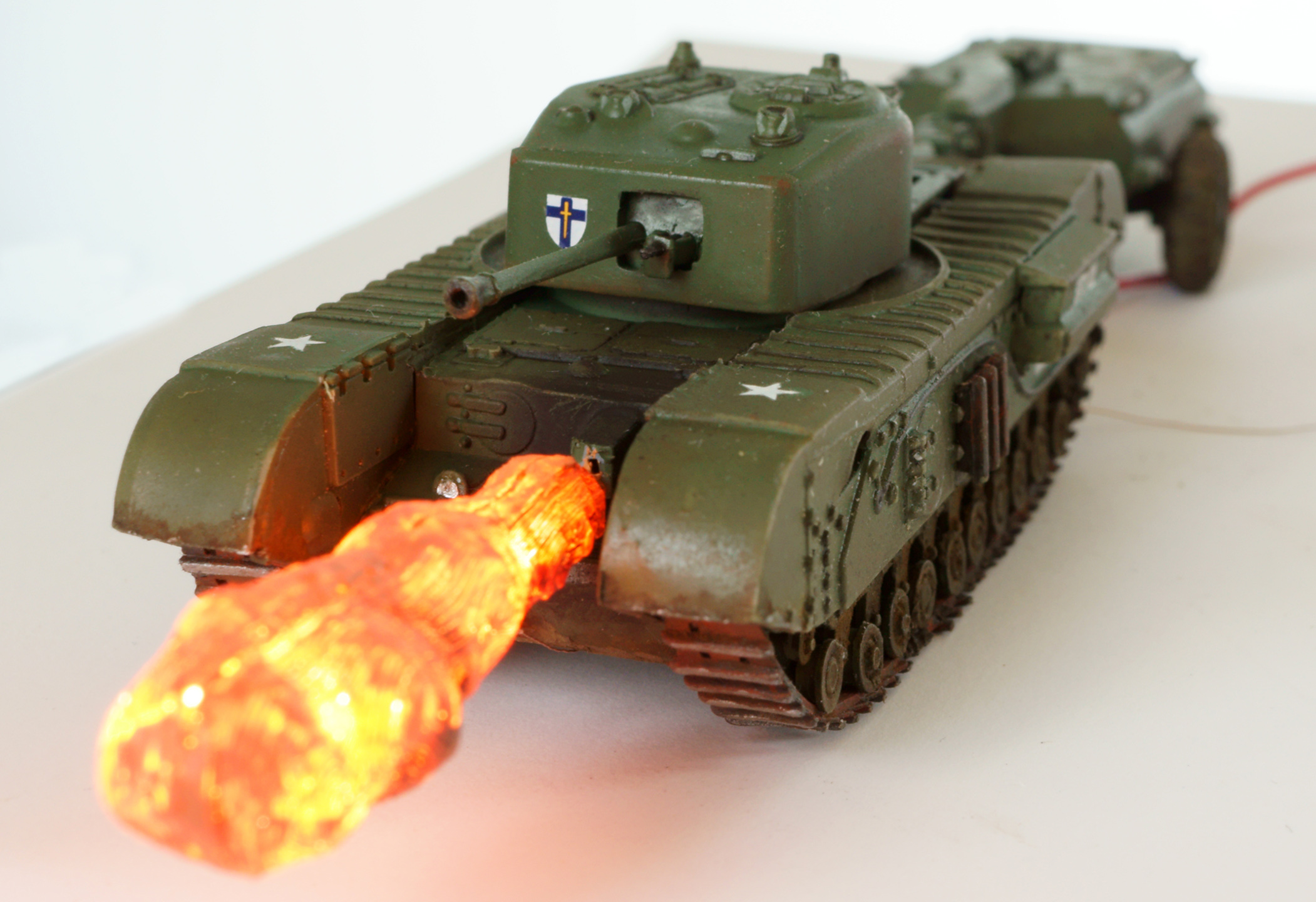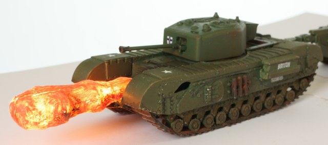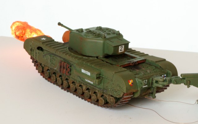 Танк - огнемётный Черчилль Крокодил в странном airfix'овском масштабе 1:76. Основная фишка (ради которой, собственно, я и выбрал огнемётный танк) - подсвеченная изнутри струя огня. Сделана из двух половинок, напечатанных на 3д-принтере. Внутри 4 3х-вольтовых диода, питание от 2х АА батареек во внешнем батарейном отсеке.