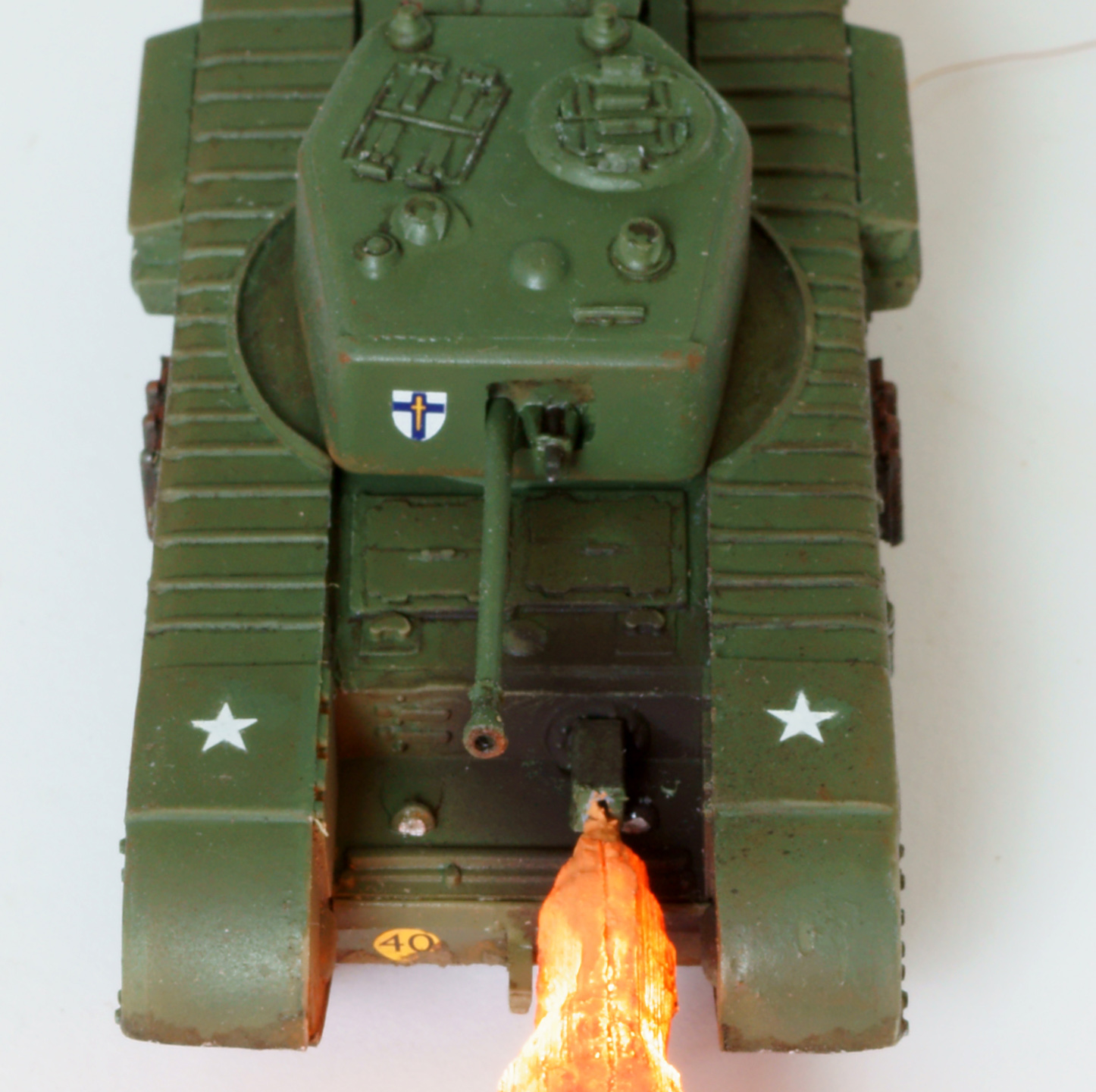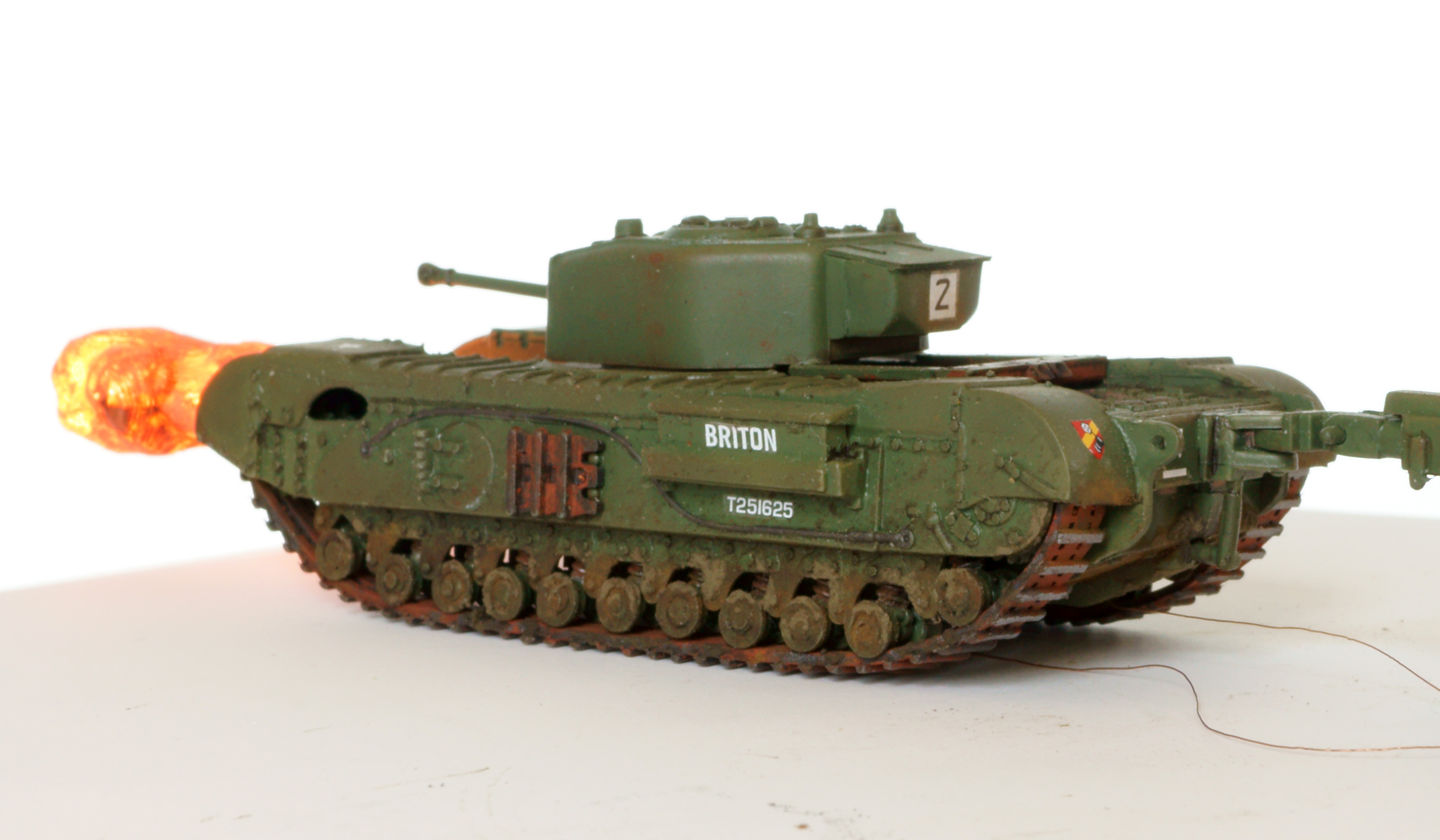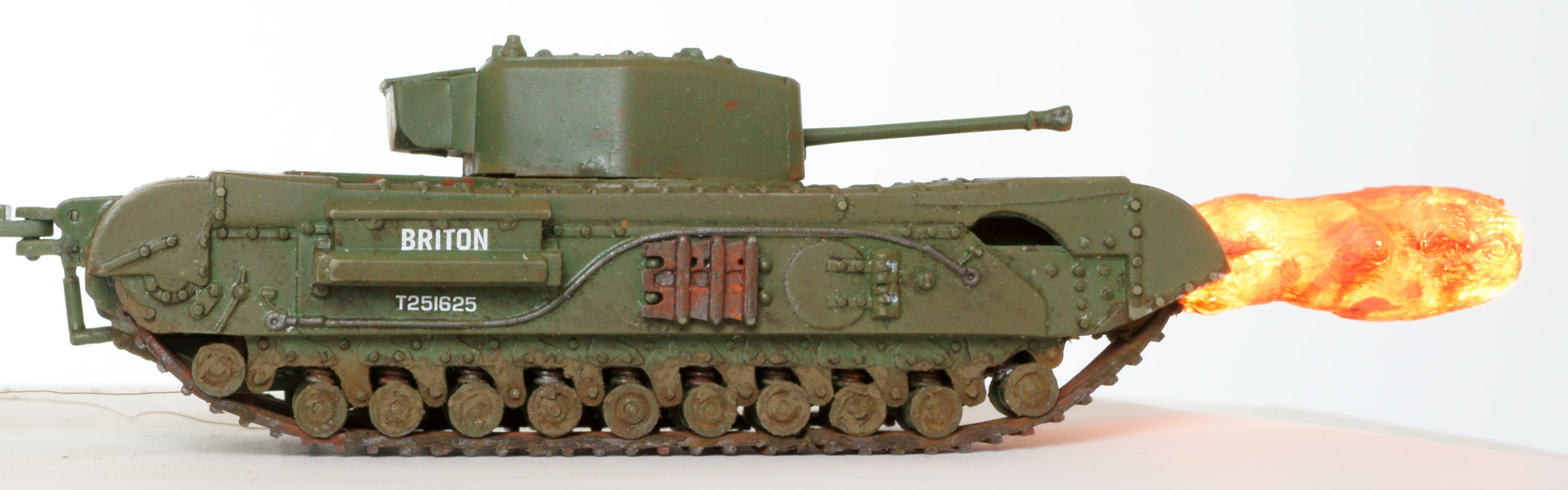 Танк - огнемётный Черчилль Крокодил в странном airfix'овском масштабе 1:76. Основная фишка (ради которой, собственно, я и выбрал огнемётный танк) - подсвеченная изнутри струя огня. Сделана из двух половинок, напечатанных на 3д-принтере. Внутри 4 3х-вольтовых диода, питание от 2х АА батареек во внешнем батарейном отсеке.