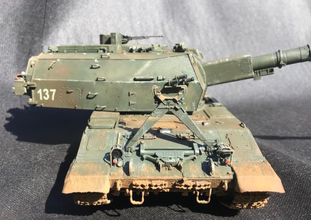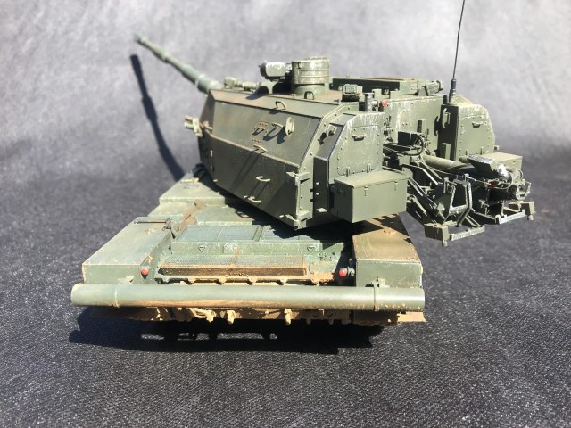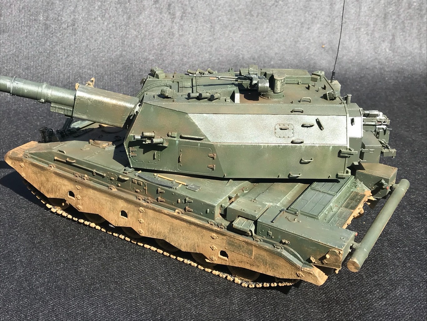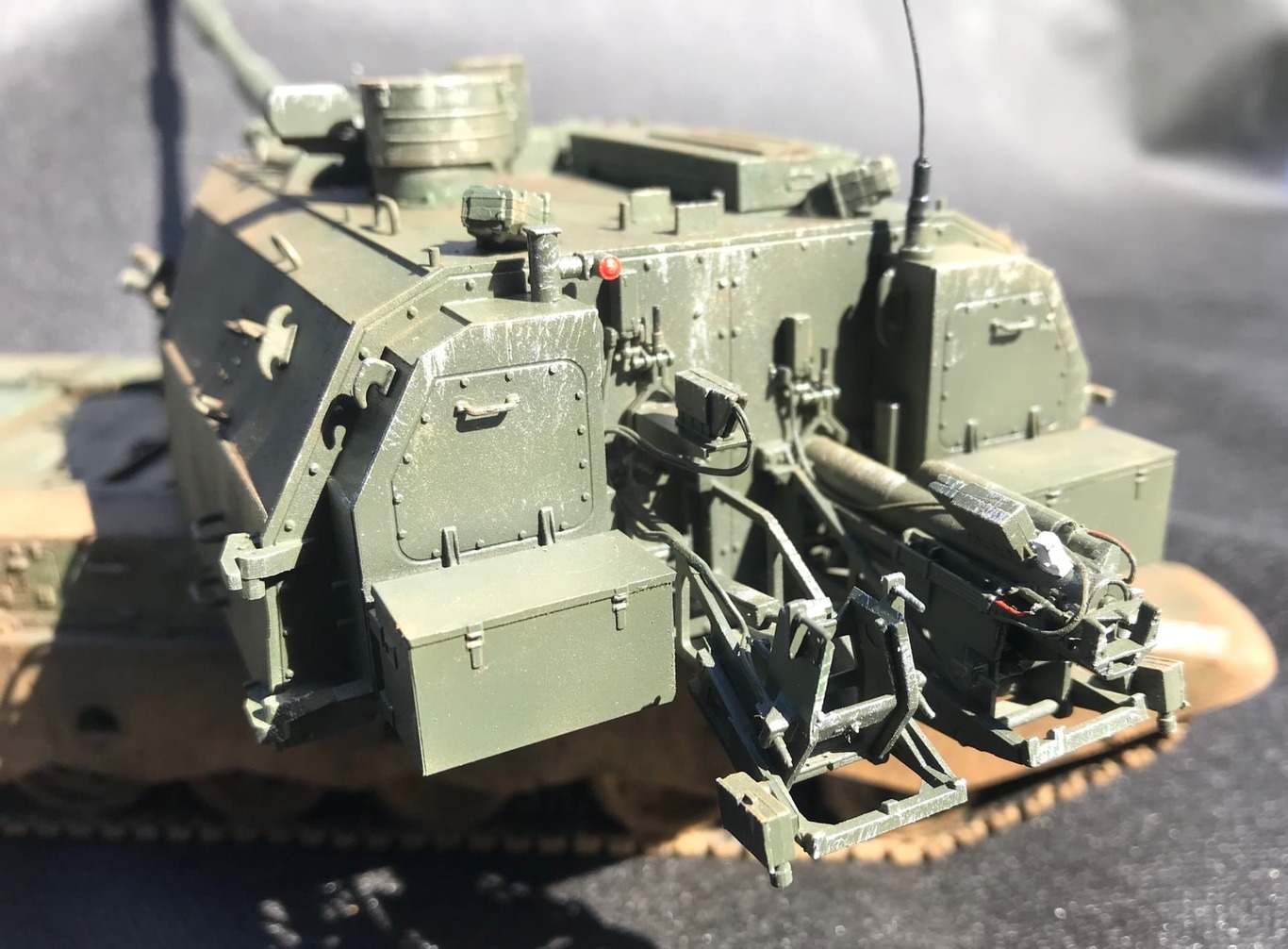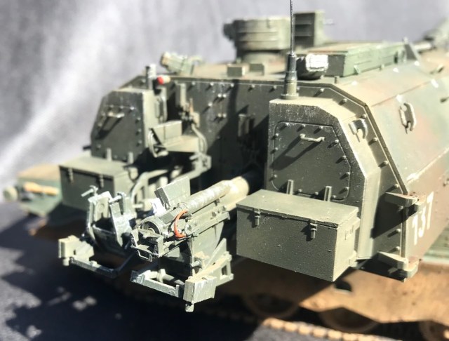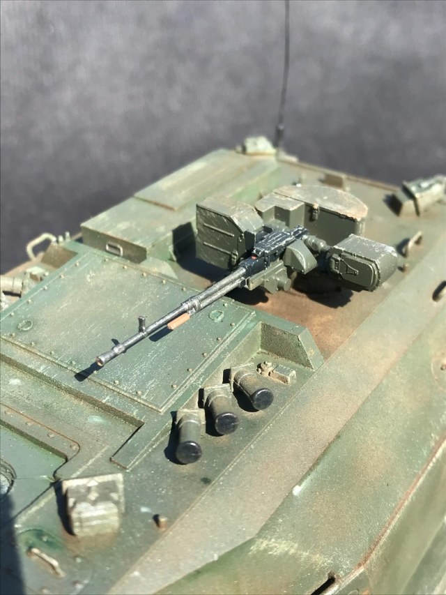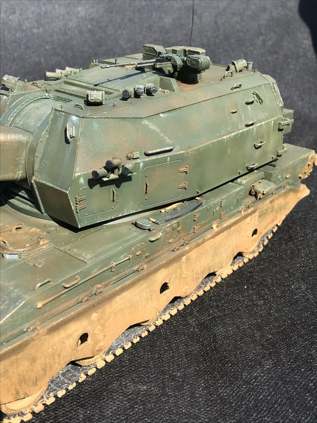 Неустраненные литьевые швы на мелких деталях, следы толкателей на видных местах, корявая антенна. Ствол, по-моему, изогнут вниз, но на таких фото сложно это понять. Однотонно покрашено и так же однотонно замазано грязью. Рельеф никак не выделен, потому что смывки нет вообще.