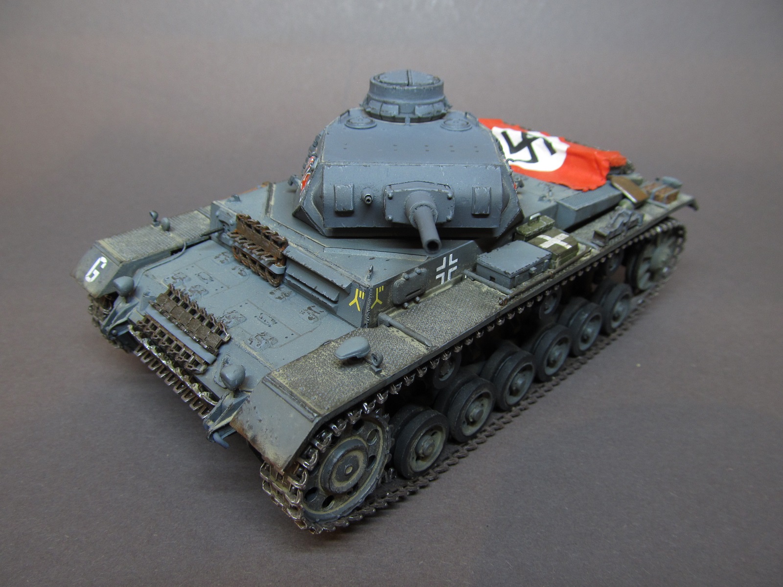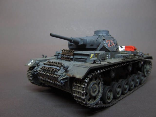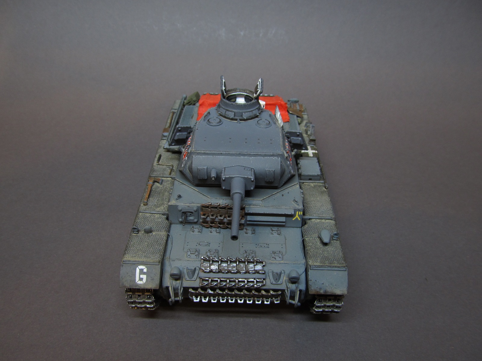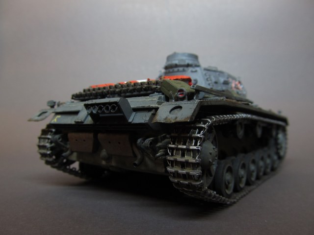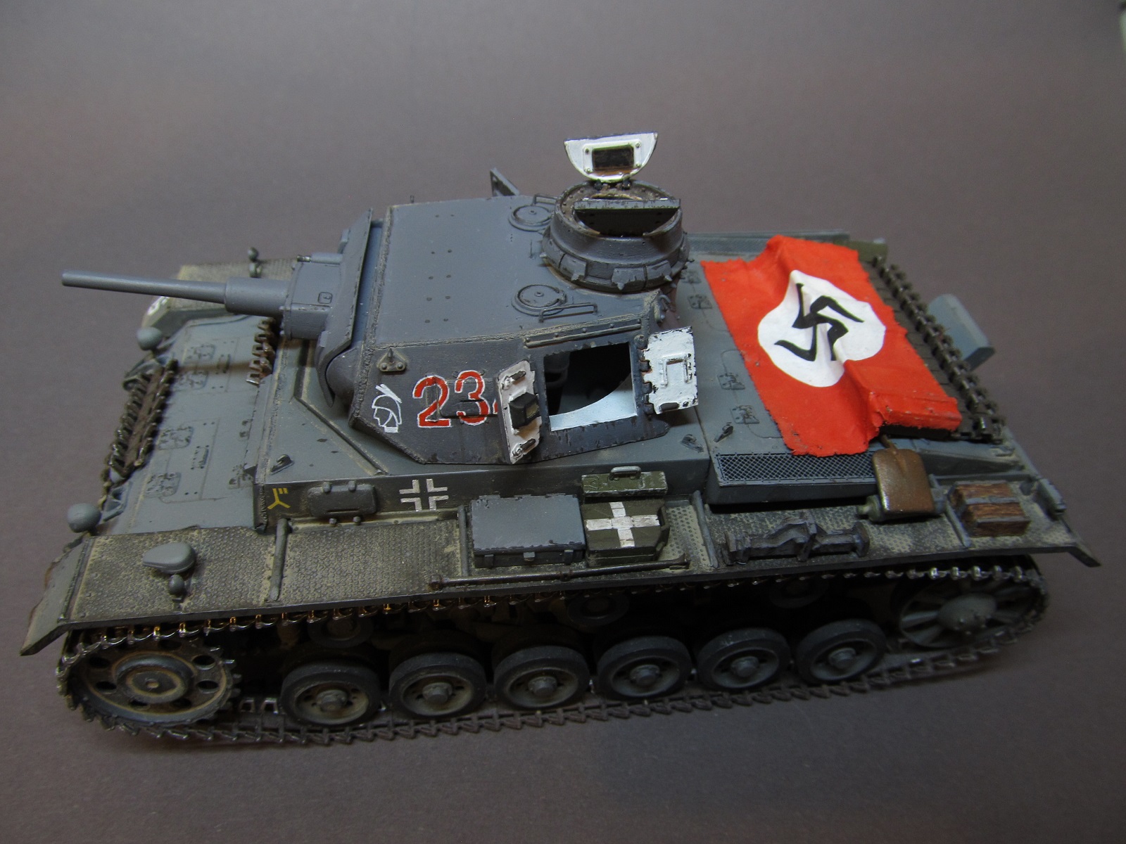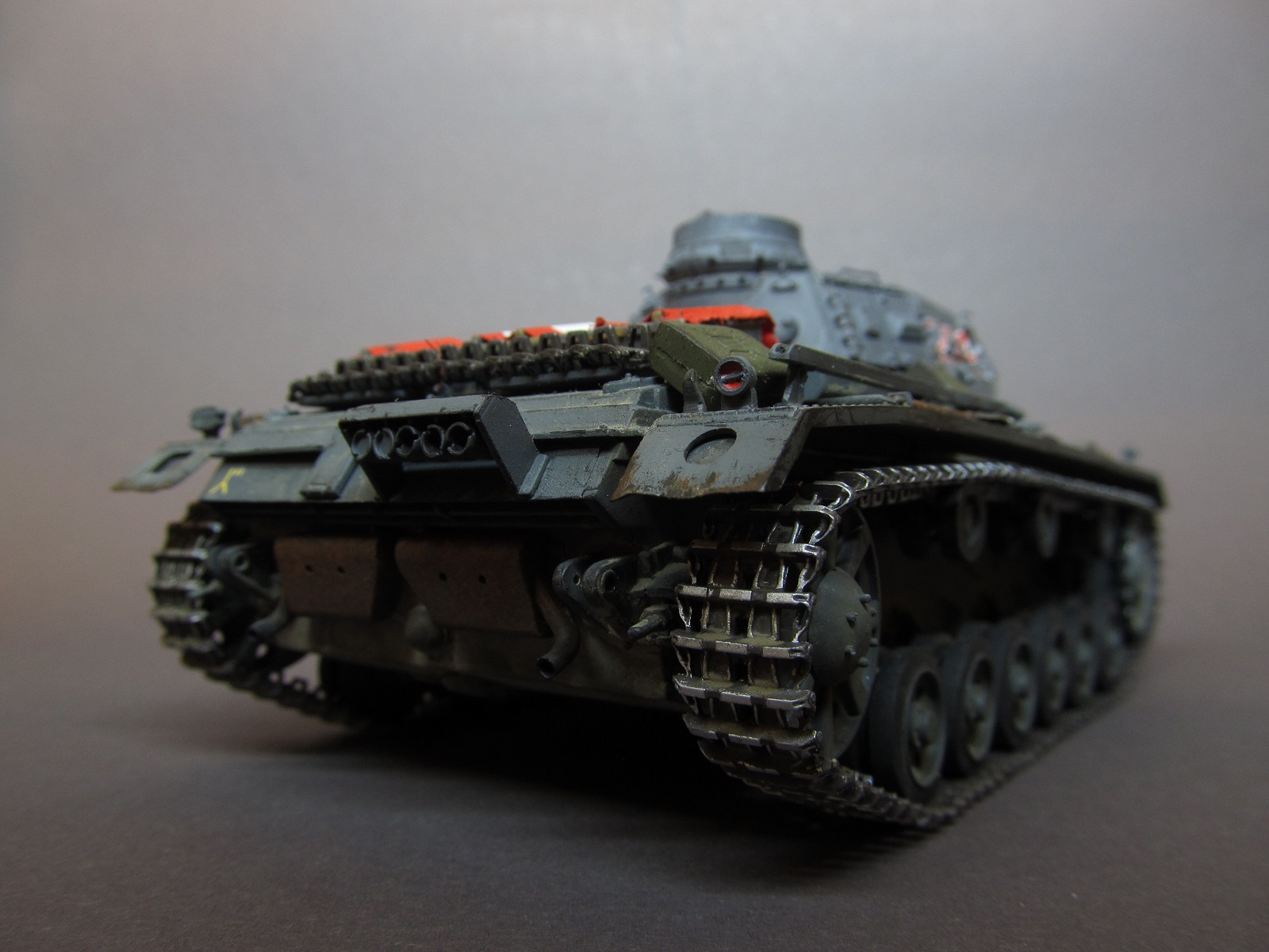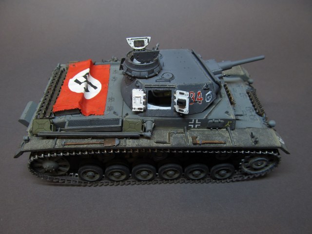 Ящик Роммеля в этом наборе отсутствует совсем, а в запасах ничего подходящего не нашлось. Будем считать, отвалился по дороге))).Да, при рисовании номеров и эмблем, я частично ориентировался и на это фото, и на ряд других машин 6 полка 3 дивизии, но в целом образ- скорее, собирательный!)) Так-то на этом фото и не "F" совсем, а скорее "G" (ведущие звездочки другие, ком. башенка другая, наклон задней стенки башни совсем не такой, как у модификации "F"