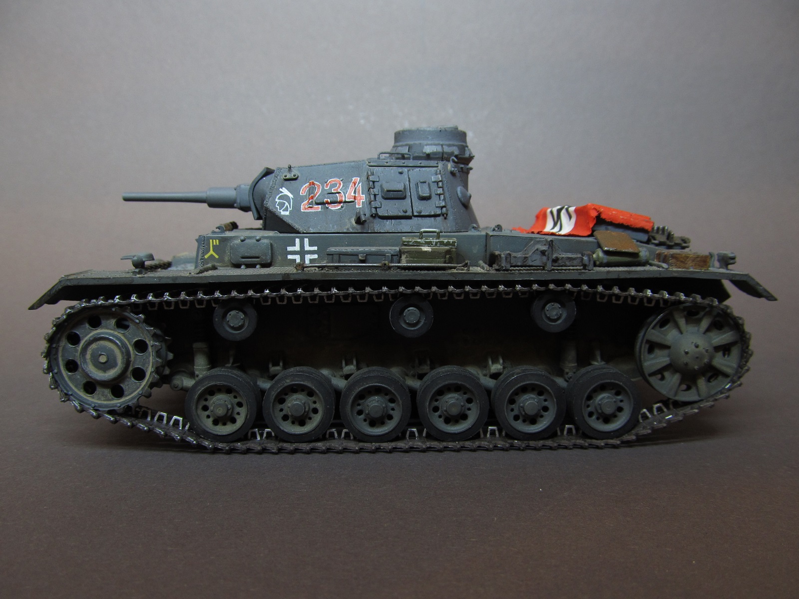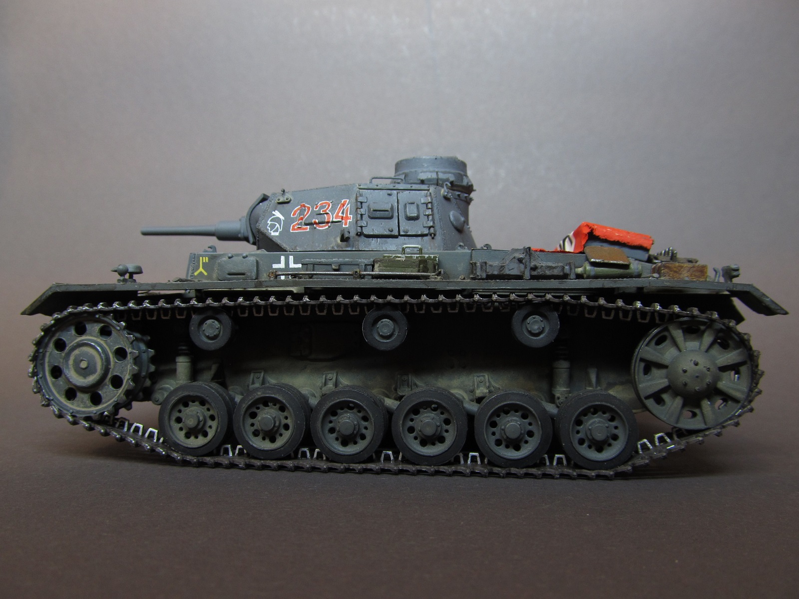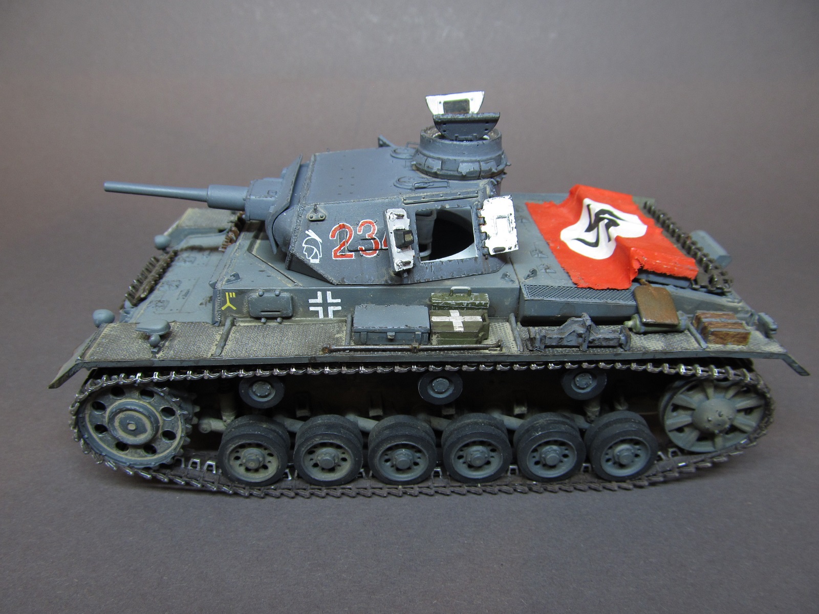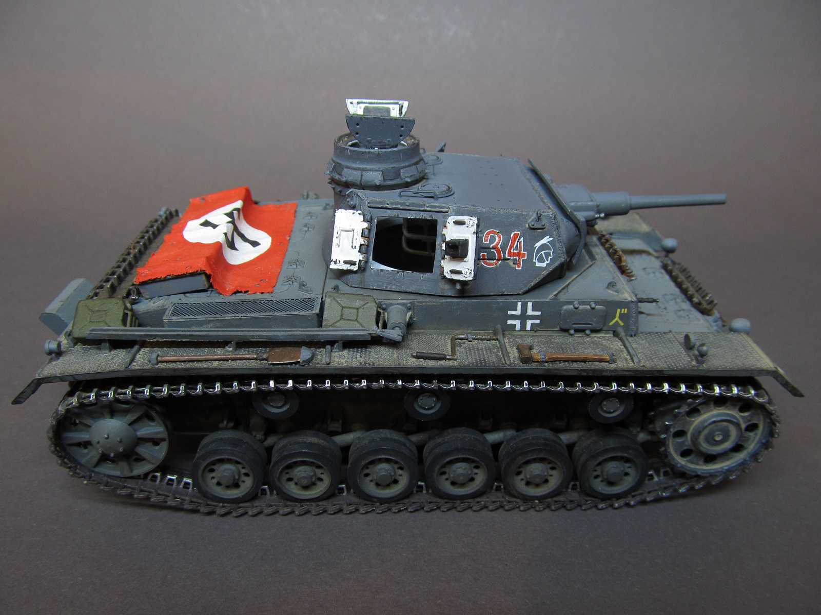 Ящик Роммеля в этом наборе отсутствует совсем, а в запасах ничего подходящего не нашлось. Будем считать, отвалился по дороге))).Да, при рисовании номеров и эмблем, я частично ориентировался и на это фото, и на ряд других машин 6 полка 3 дивизии, но в целом образ- скорее, собирательный!)) Так-то на этом фото и не "F" совсем, а скорее "G" (ведущие звездочки другие, ком. башенка другая, наклон задней стенки башни совсем не такой, как у модификации "F"