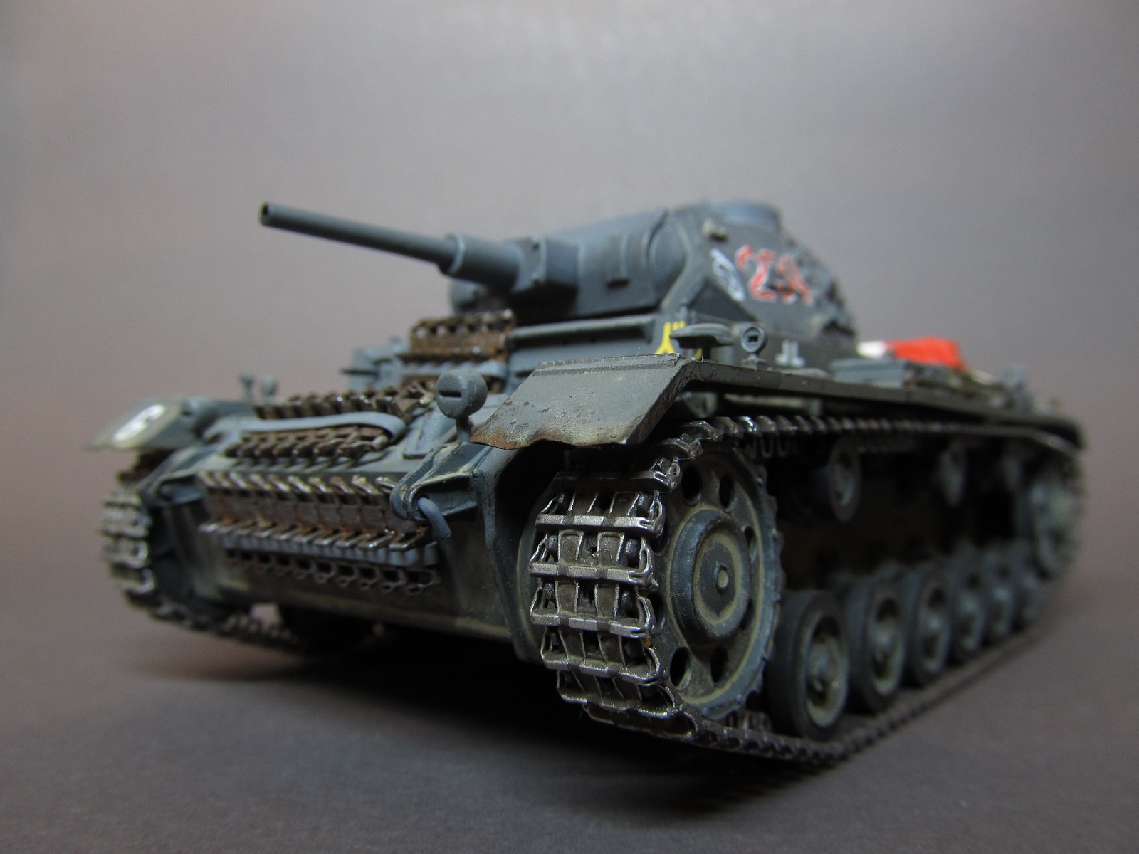 Окрашивал модель акриловыми красками от Revell и "Звезды". Традиционно не пользовался декалями, все номера- знаки рисовал кисточкой. За образец нанесения маркировки взял машину из 2 роты 6 танкового полка 3 танковой дивизии вермахта применительно к июню 1941 года (интересна эмблема в этой роте- стилизованное изображение головы улана. Предположительно 6 Panzer-Regiment был сформирован на основе 4 Reiter- Regiment- носителя традиций гвардейских уланских полков прусской армии).