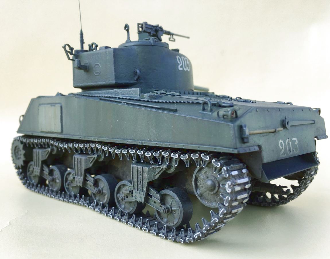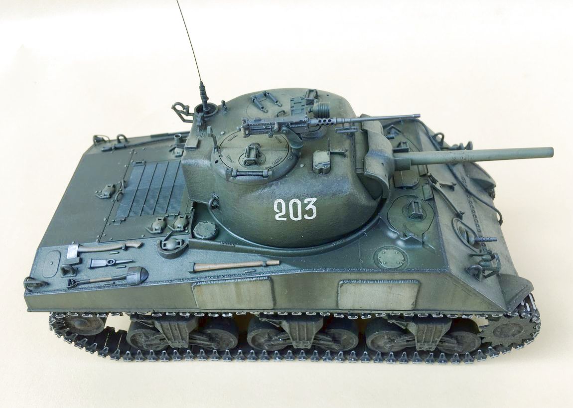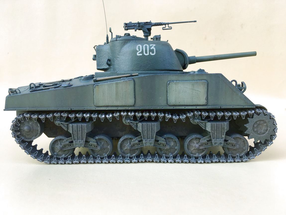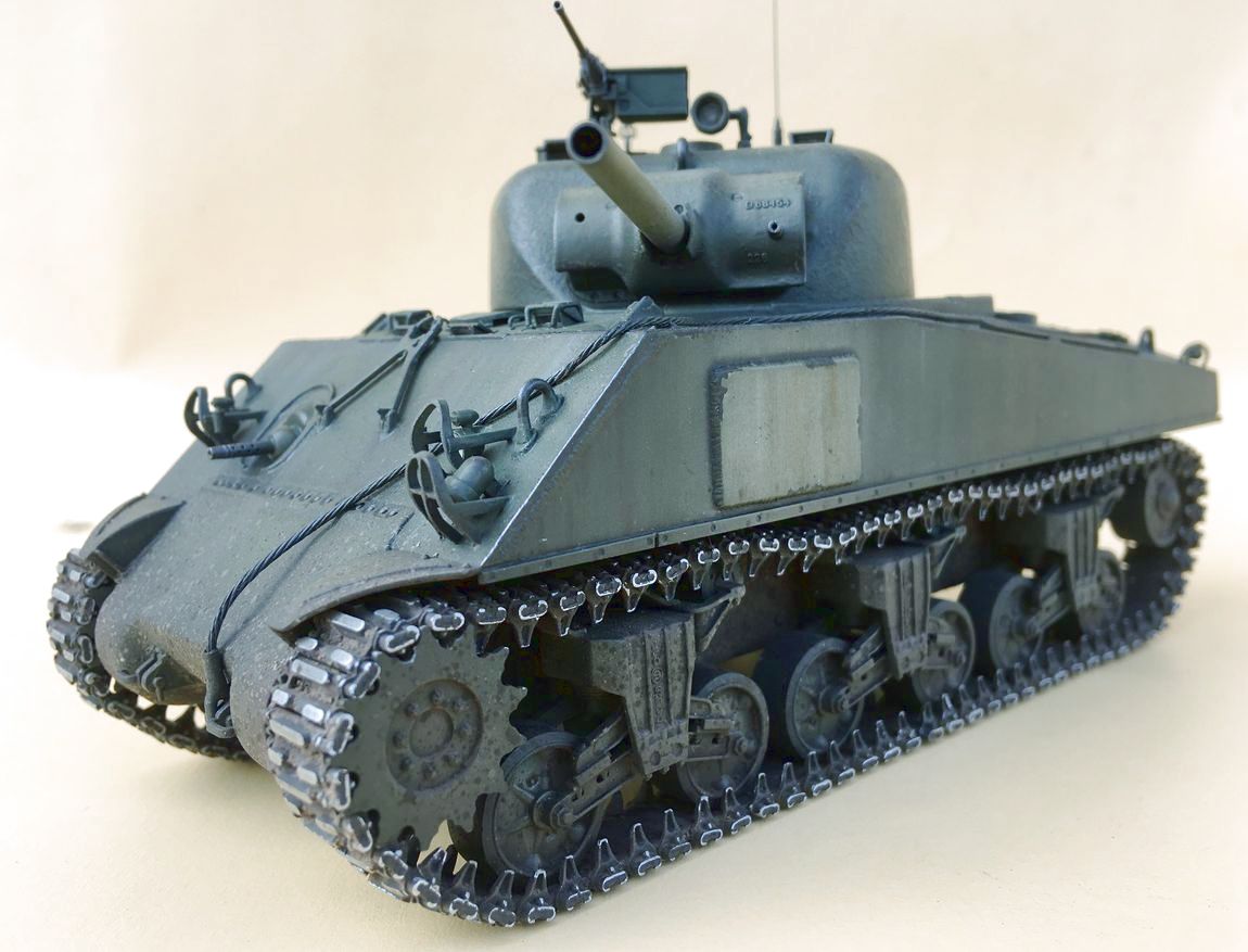 Здравствуйте уважаемые моделисты. Хочу представить вам свою модель танка Шерман.Набор от Звезды.Модель собиралась из коробки.В матчасть не лез,геометрию не исправлял. Добавил металлические траки и стволы орудия и пулеметов.Сборка проблем не вызвала. Нанес фактуру литья на башню и корпус, добавил сварочные швы. Покраска красками Тамия.Красил согласно инструкции Звезды. Далее смывка,масляные точки,сколы, нанес загрязнения и следы эксплуатации химией Аммо миг и Зип макет.Прошелся по граням простым карандашем. .Хотелось бы услышать от вас советы и замечания по модели.