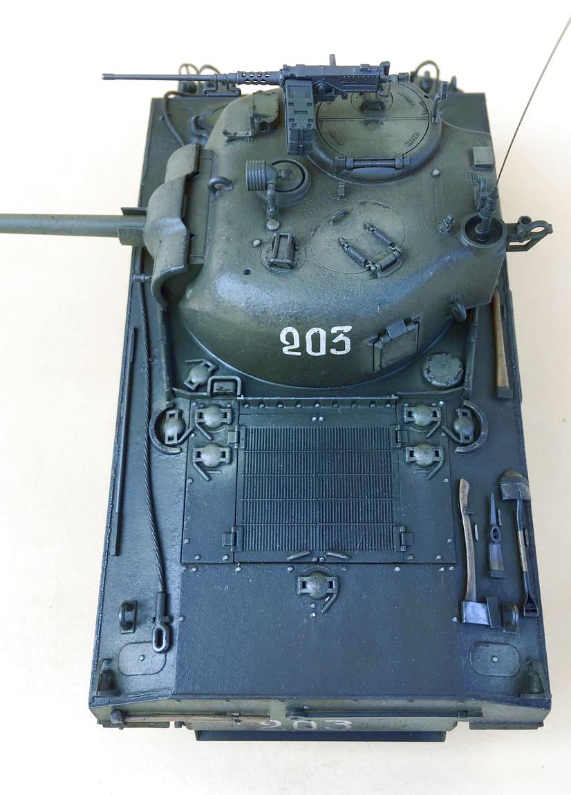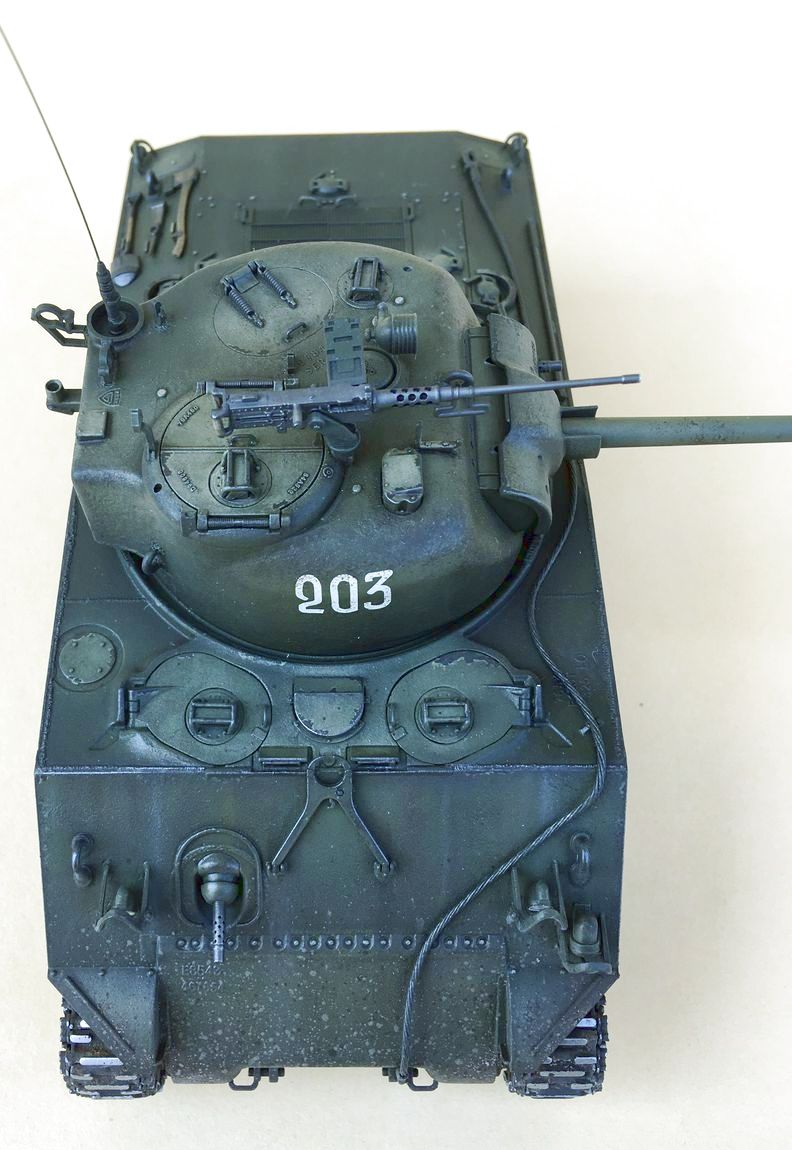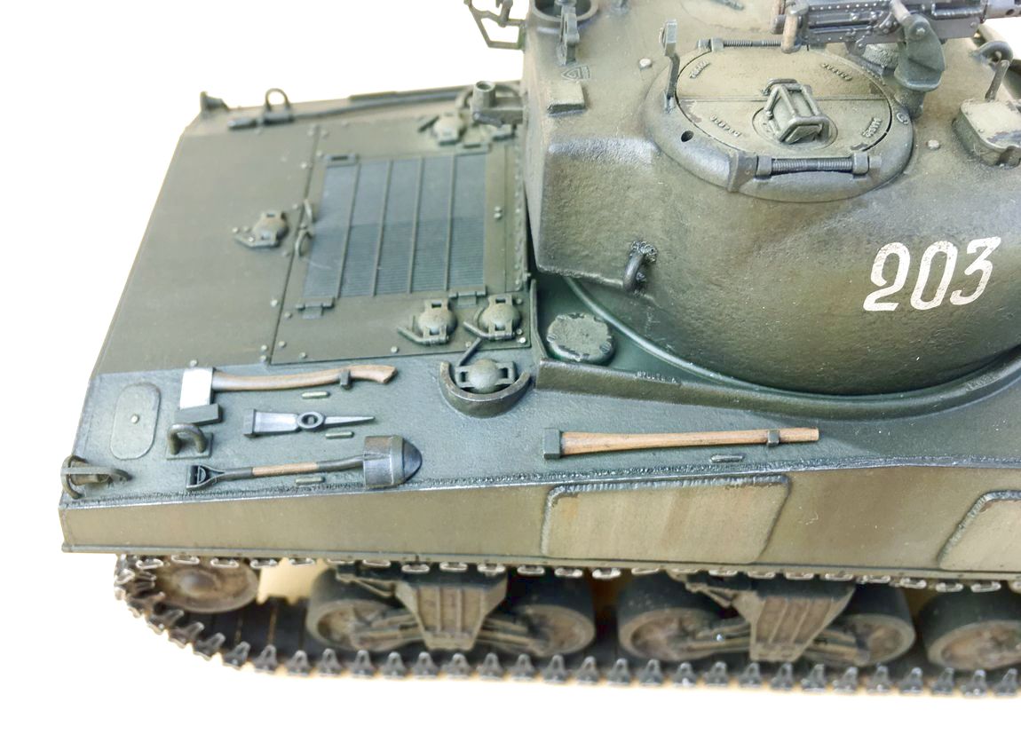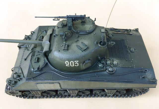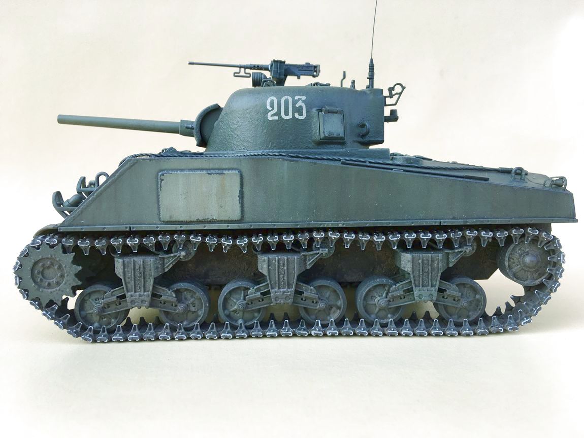 Здравствуйте уважаемые моделисты. Хочу представить вам свою модель танка Шерман.Набор от Звезды.Модель собиралась из коробки.В матчасть не лез,геометрию не исправлял. Добавил металлические траки и стволы орудия и пулеметов.Сборка проблем не вызвала. Нанес фактуру литья на башню и корпус, добавил сварочные швы. Покраска красками Тамия.Красил согласно инструкции Звезды. Далее смывка,масляные точки,сколы, нанес загрязнения и следы эксплуатации химией Аммо миг и Зип макет.Прошелся по граням простым карандашем. .Хотелось бы услышать от вас советы и замечания по модели.