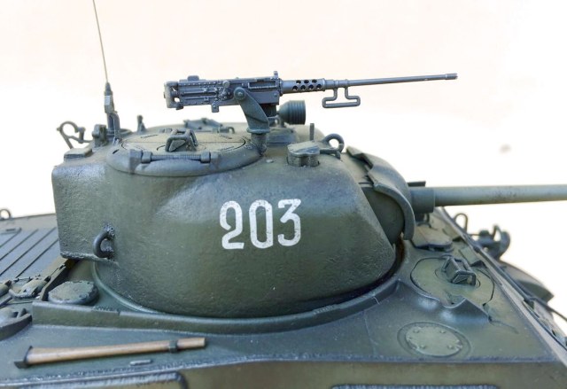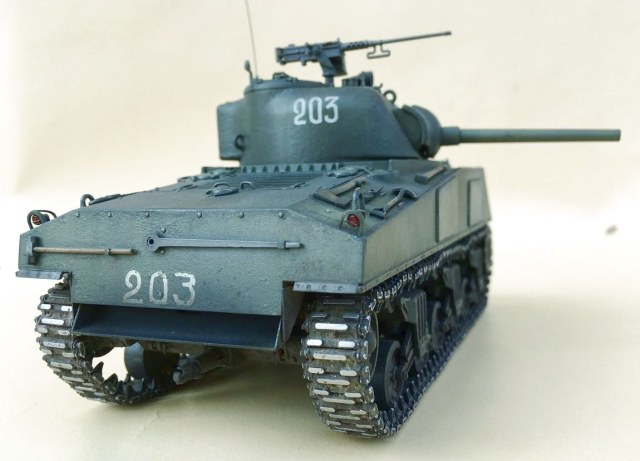 у вас лампа освещения цвет меняет, похоже на 6000к, в синеву уводит, отсюда и серый цвет модели. мне понравился шерман, чуток укоротить траки,и будет счастье. фактура башни понравилась, сейчас свой шерман делаю, уже в покраске, чую прилетит потом что без фактуры)
