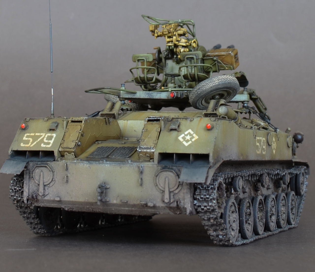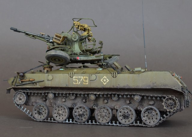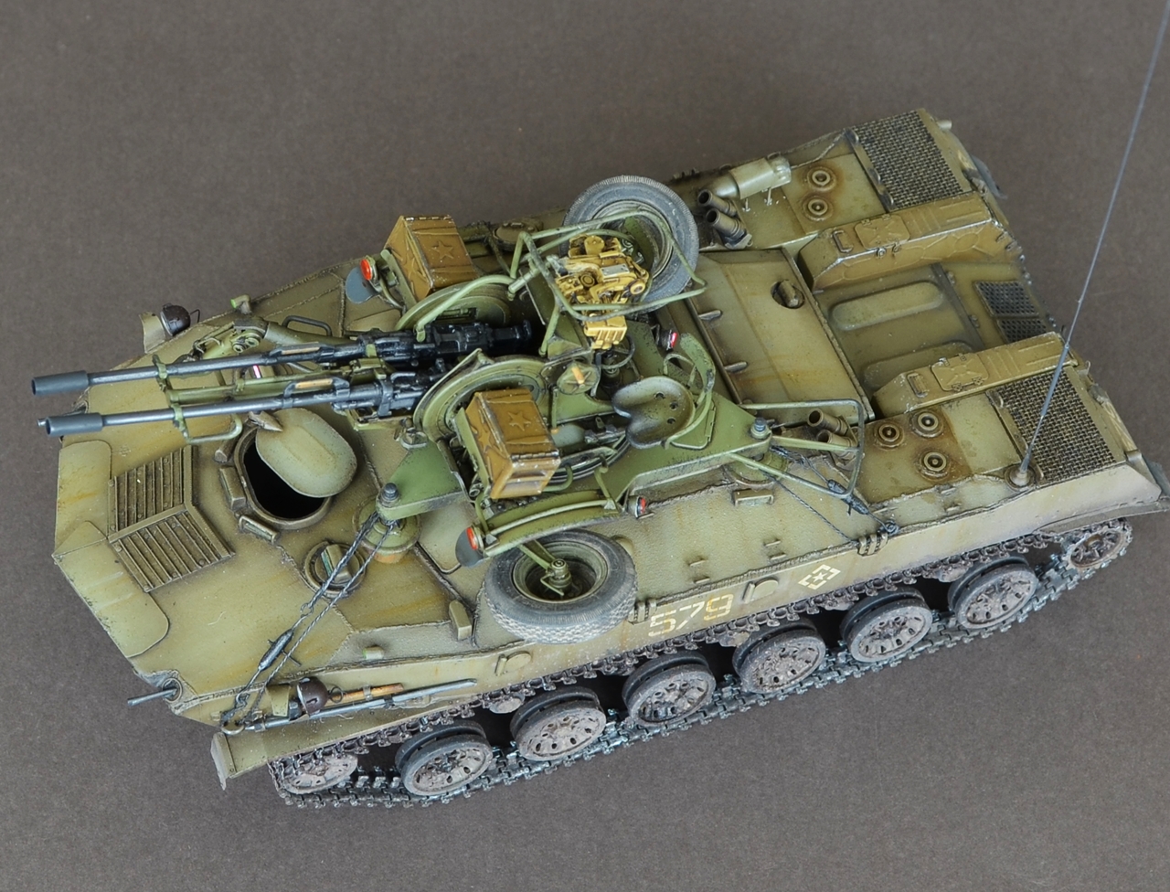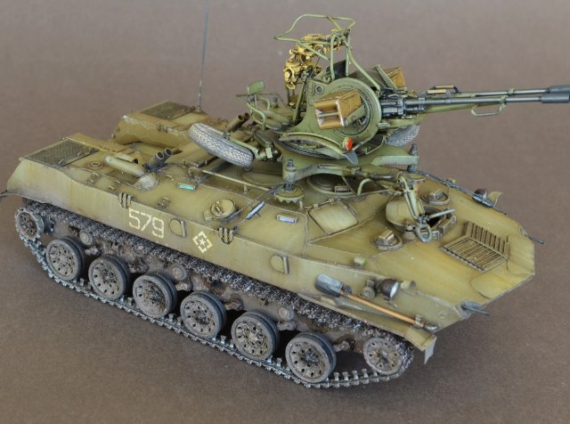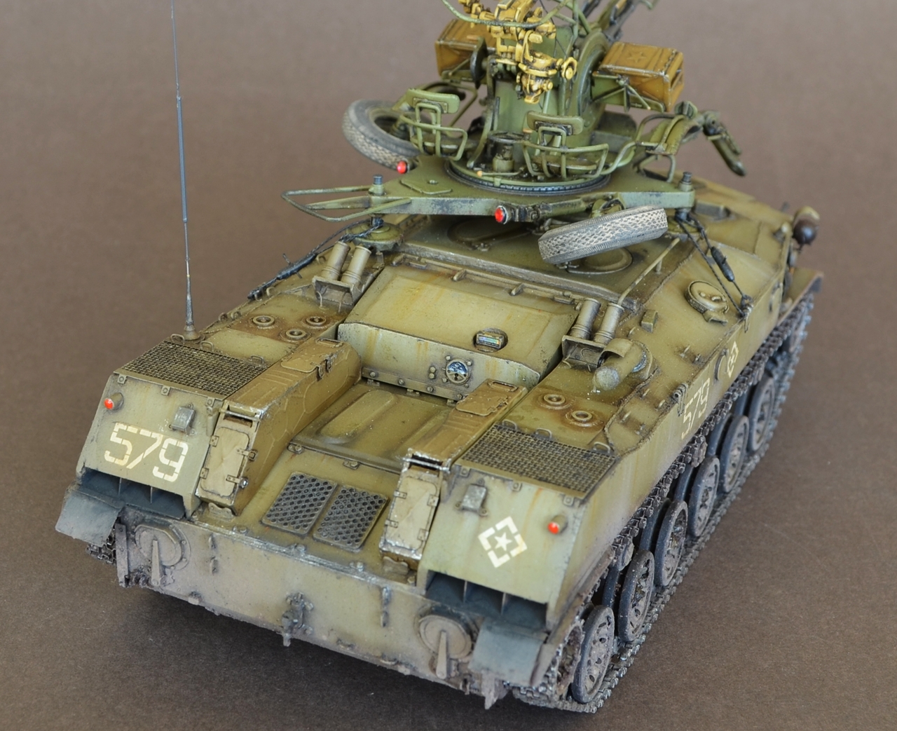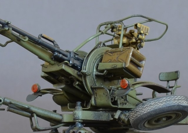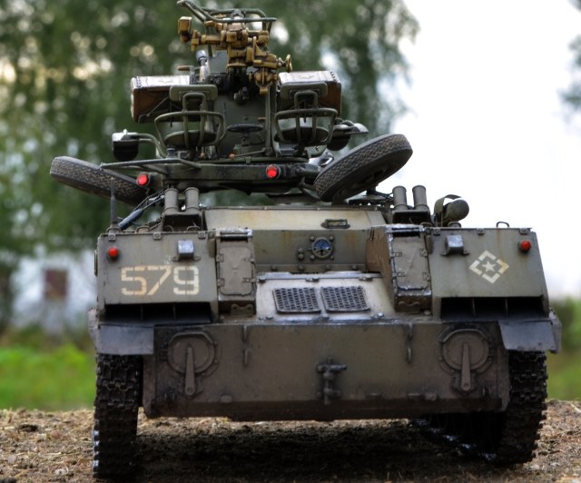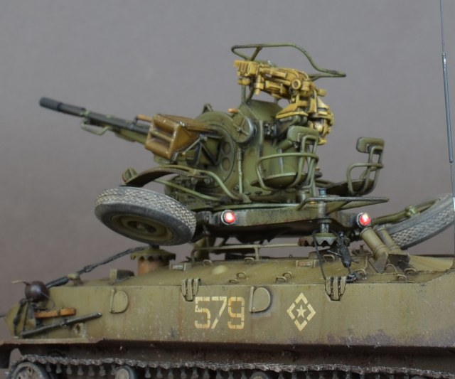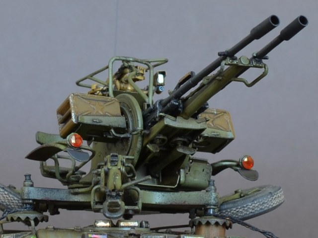 Машина просто великолепная. И деталировка и художка. Зенитка совсем другого уровня. Стволы не параллельны, сиденья из немасштабных труб, много чего по мелочи. Не удалось соединить "коня и трепетную лань". Но на полке смотрится красиво.