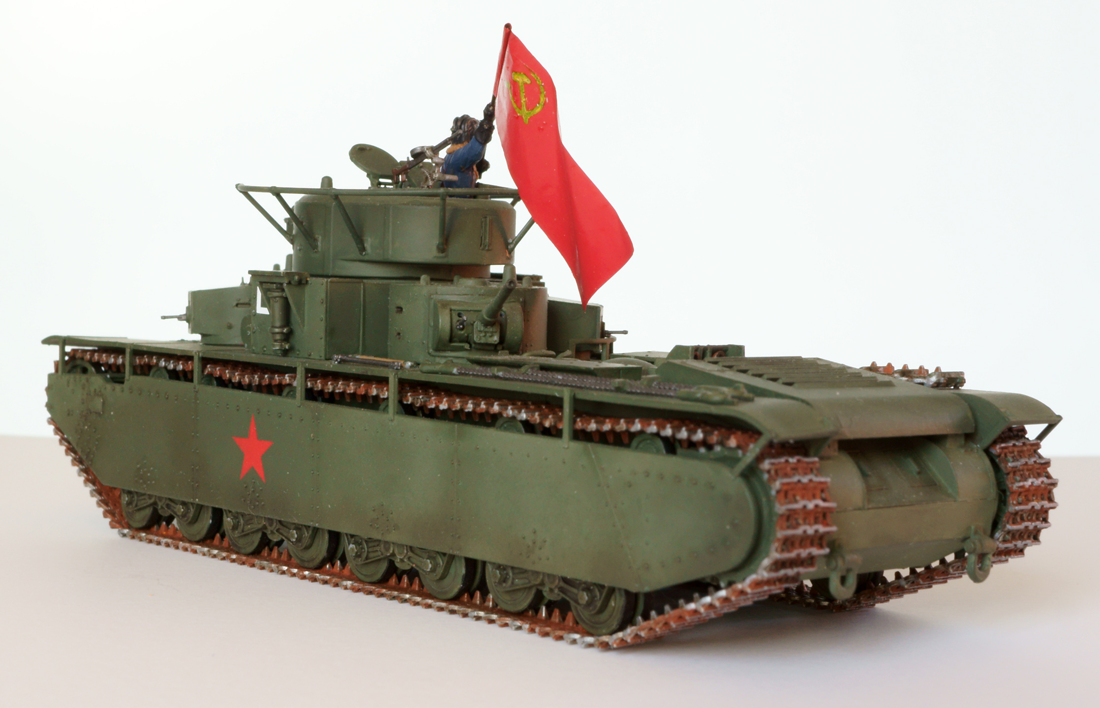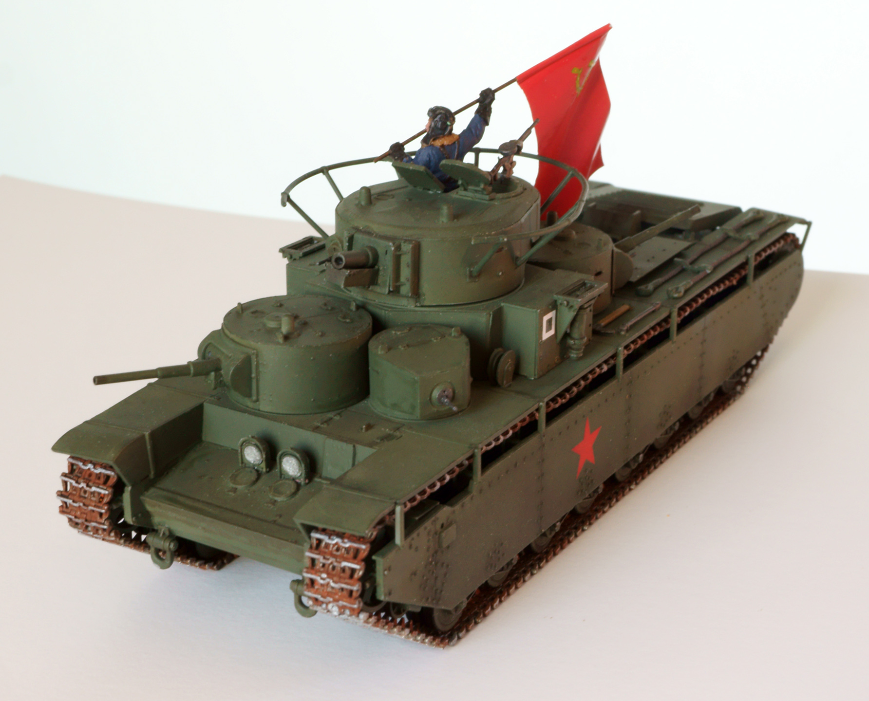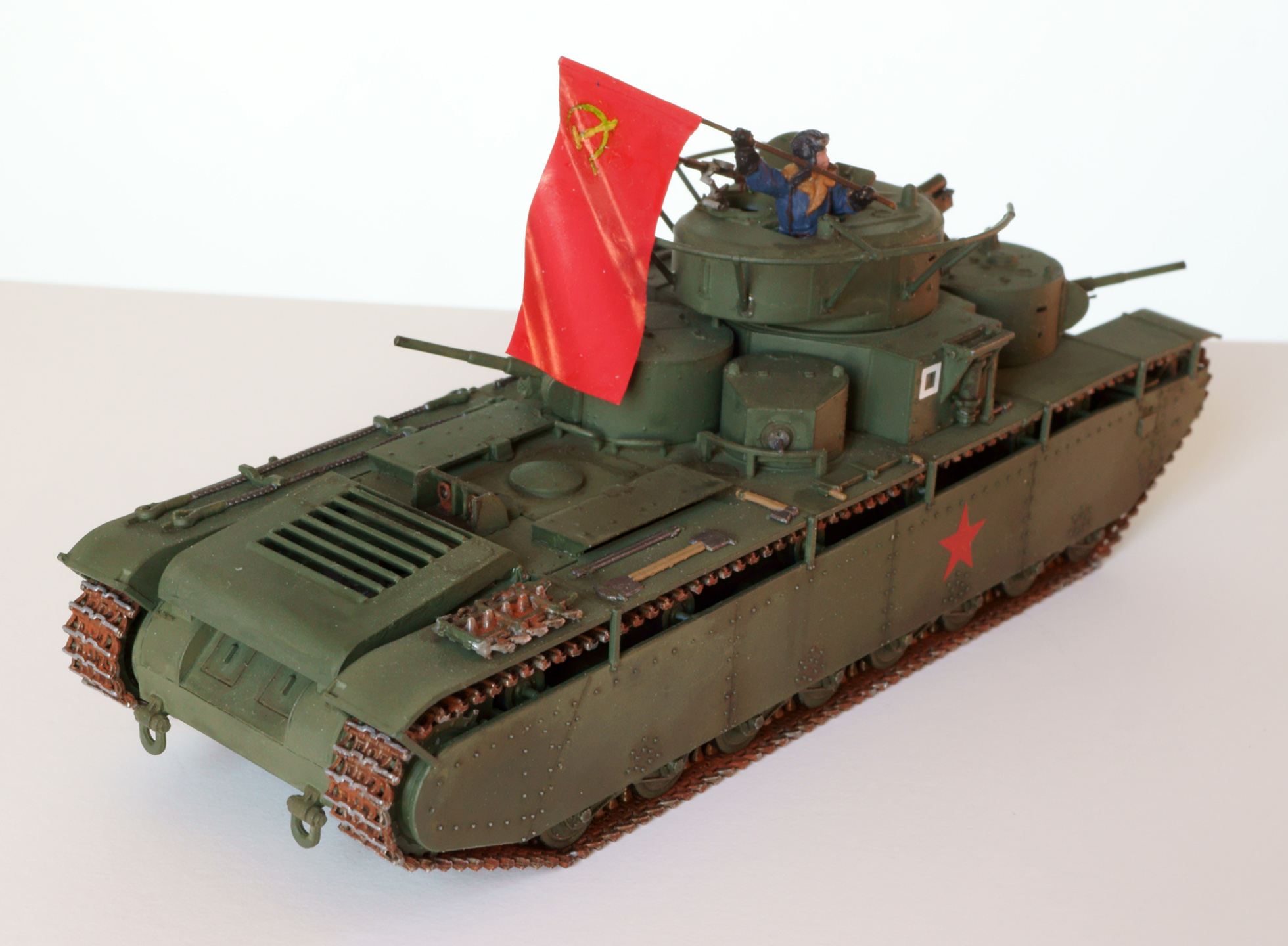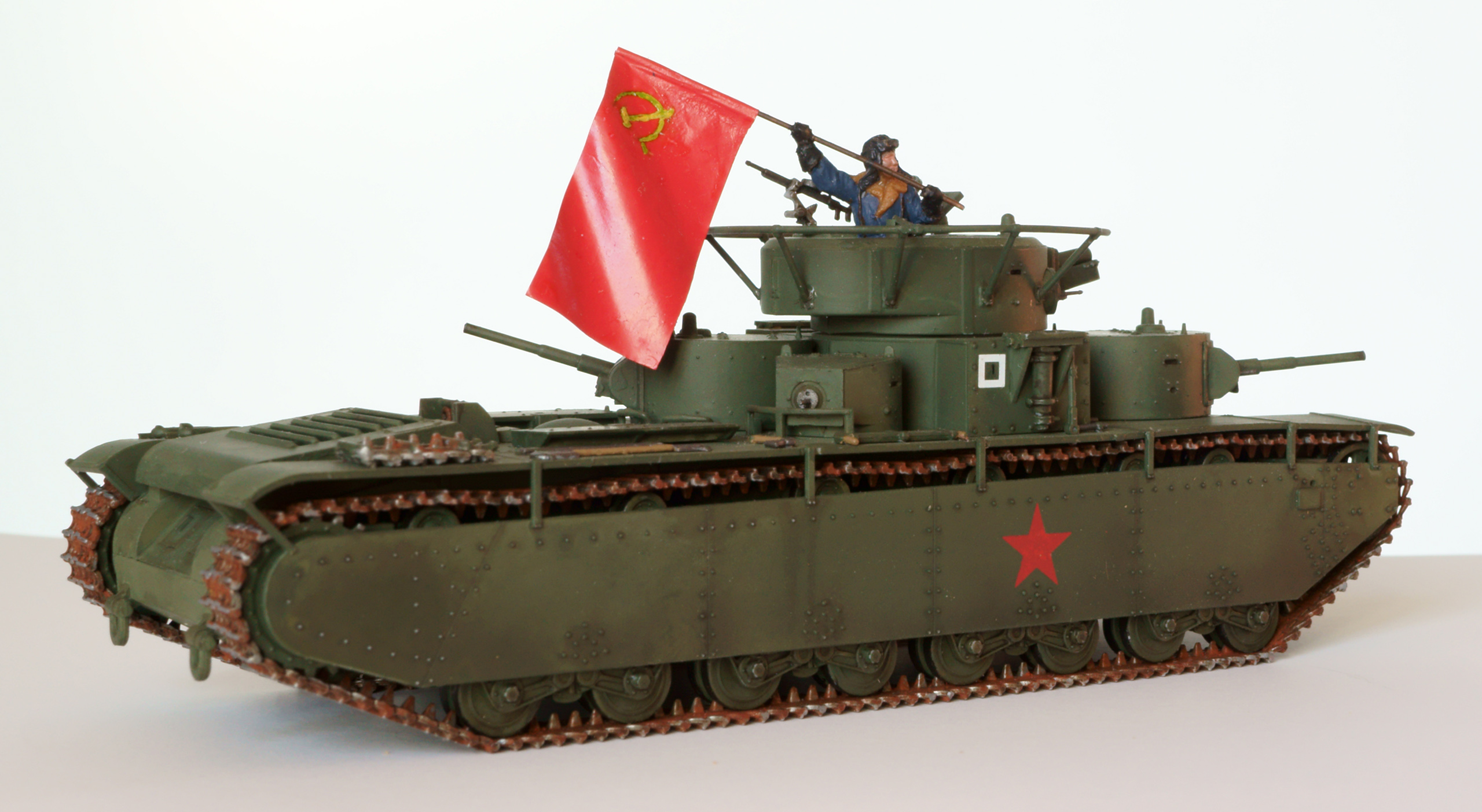 Конечно, о парадности свидететельствует не только это, а в первую очередь танкист, с энтузиазмом размахивающий флагом. Танкиста взял из набора советских танкистов. нужного положения рук там не нашлось, поэтому руки пришлось отрезать и переклеить. Флаг из раскрашенной фольги. с серпом и молотом возникли проблемы, т.к. декалей нужного размера я не нашёл. Решил напечатать на декальной бумаге, но это тоже не сработало, т.к. бумага прозрачная, и жёлтый цвет после наклеёки практически терялся. В итоге сдел настолько тёмный желто-зелёно-коричневый, насколько мог, а поверх доработал кисточкой. Получилось, конечно, не идеально, но живьём в мастабе 1:72 выглядит более-менее.