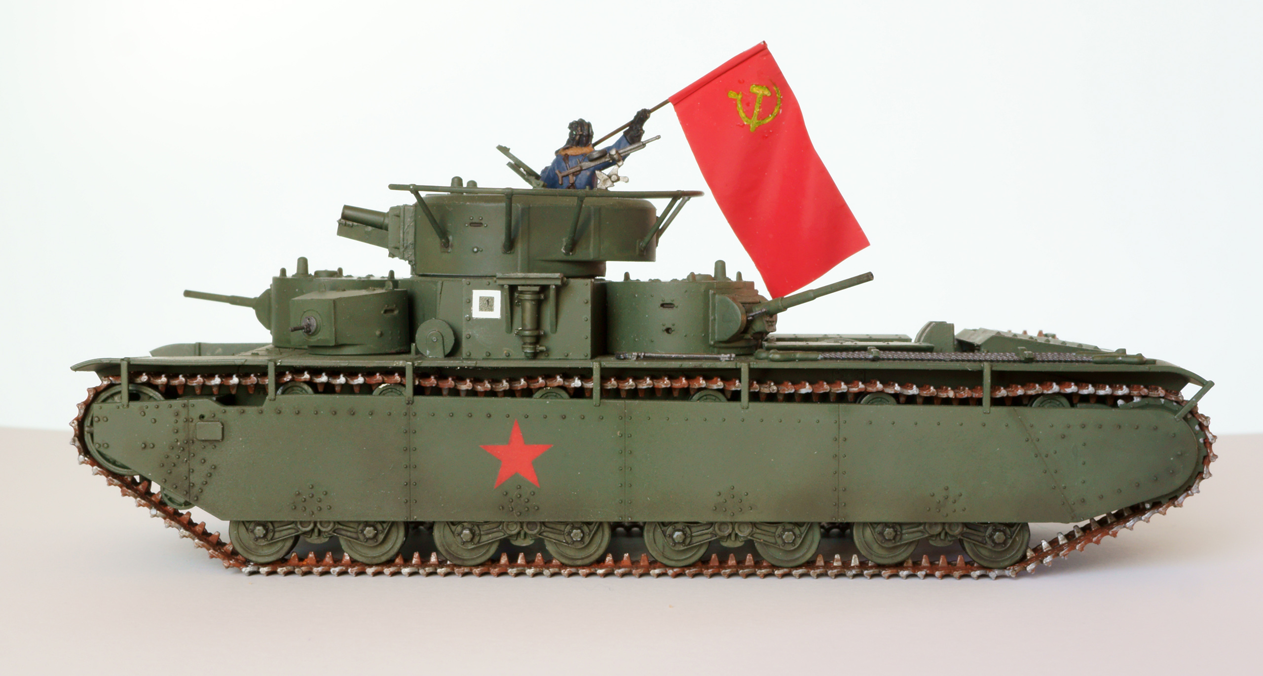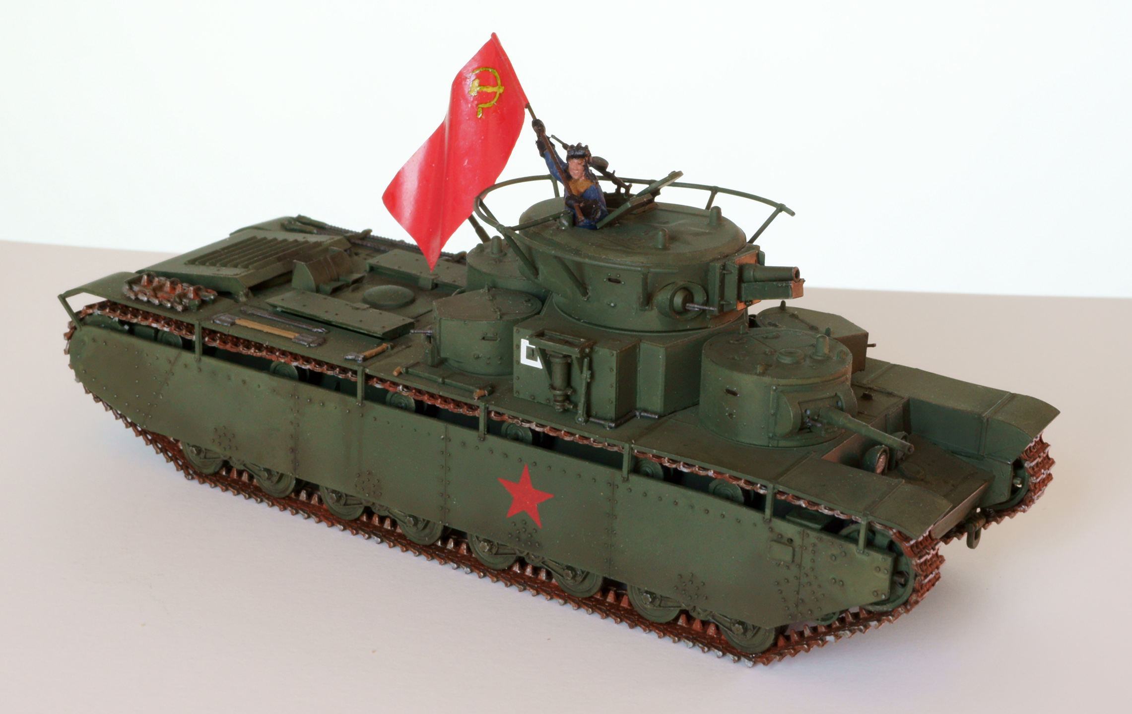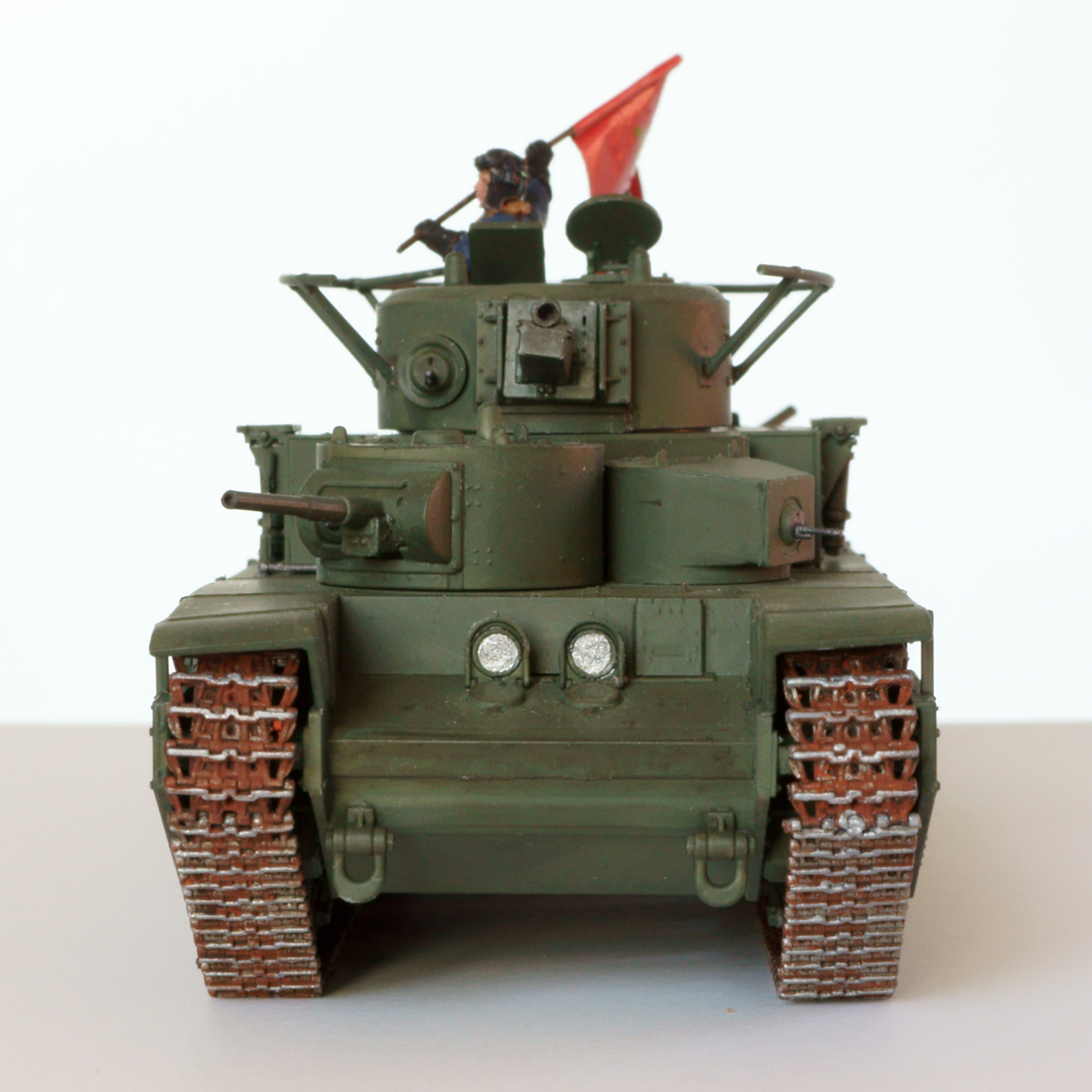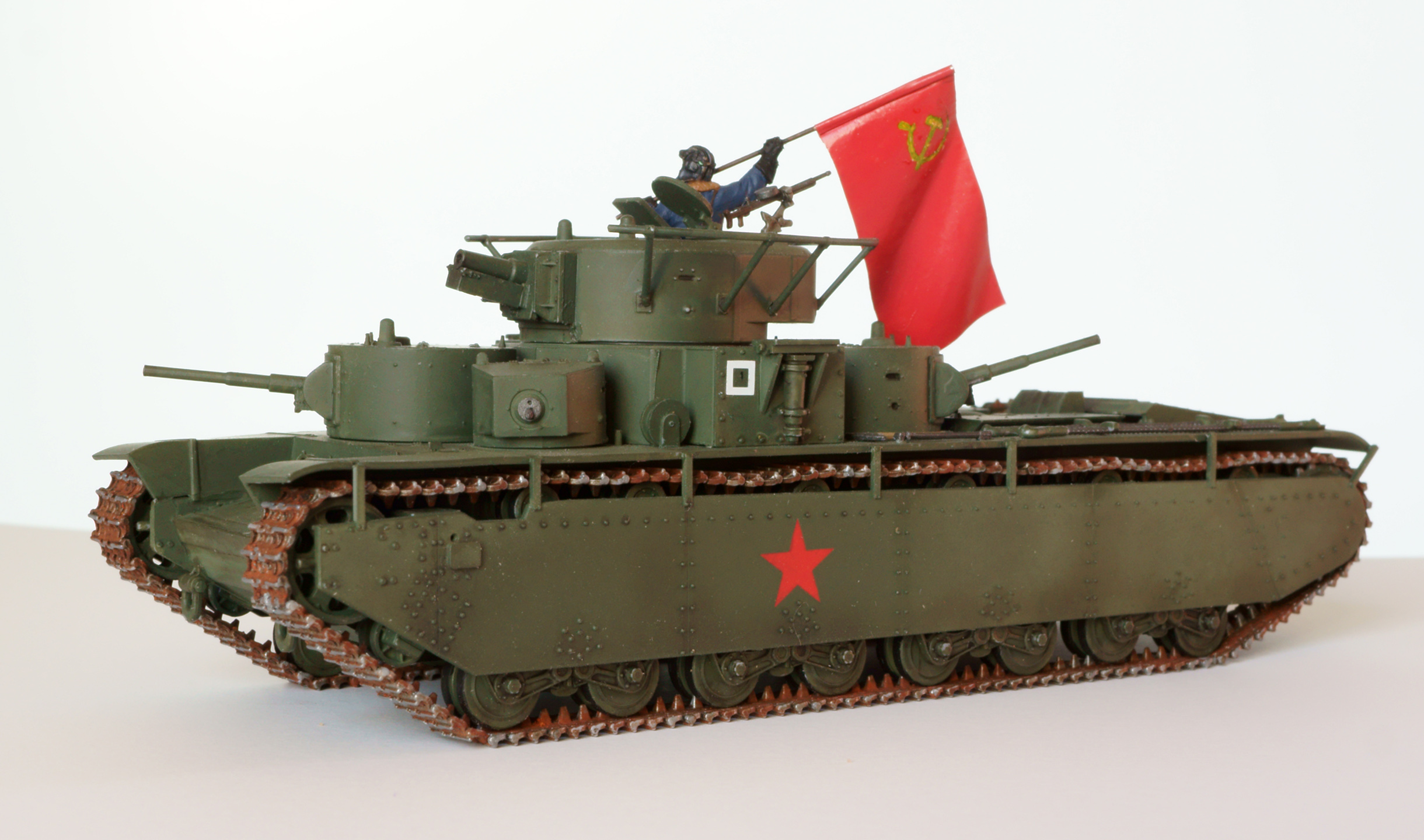 Конечно, о парадности свидететельствует не только это, а в первую очередь танкист, с энтузиазмом размахивающий флагом. Танкиста взял из набора советских танкистов. нужного положения рук там не нашлось, поэтому руки пришлось отрезать и переклеить. Флаг из раскрашенной фольги. с серпом и молотом возникли проблемы, т.к. декалей нужного размера я не нашёл. Решил напечатать на декальной бумаге, но это тоже не сработало, т.к. бумага прозрачная, и жёлтый цвет после наклеёки практически терялся. В итоге сдел настолько тёмный желто-зелёно-коричневый, насколько мог, а поверх доработал кисточкой. Получилось, конечно, не идеально, но живьём в мастабе 1:72 выглядит более-менее.