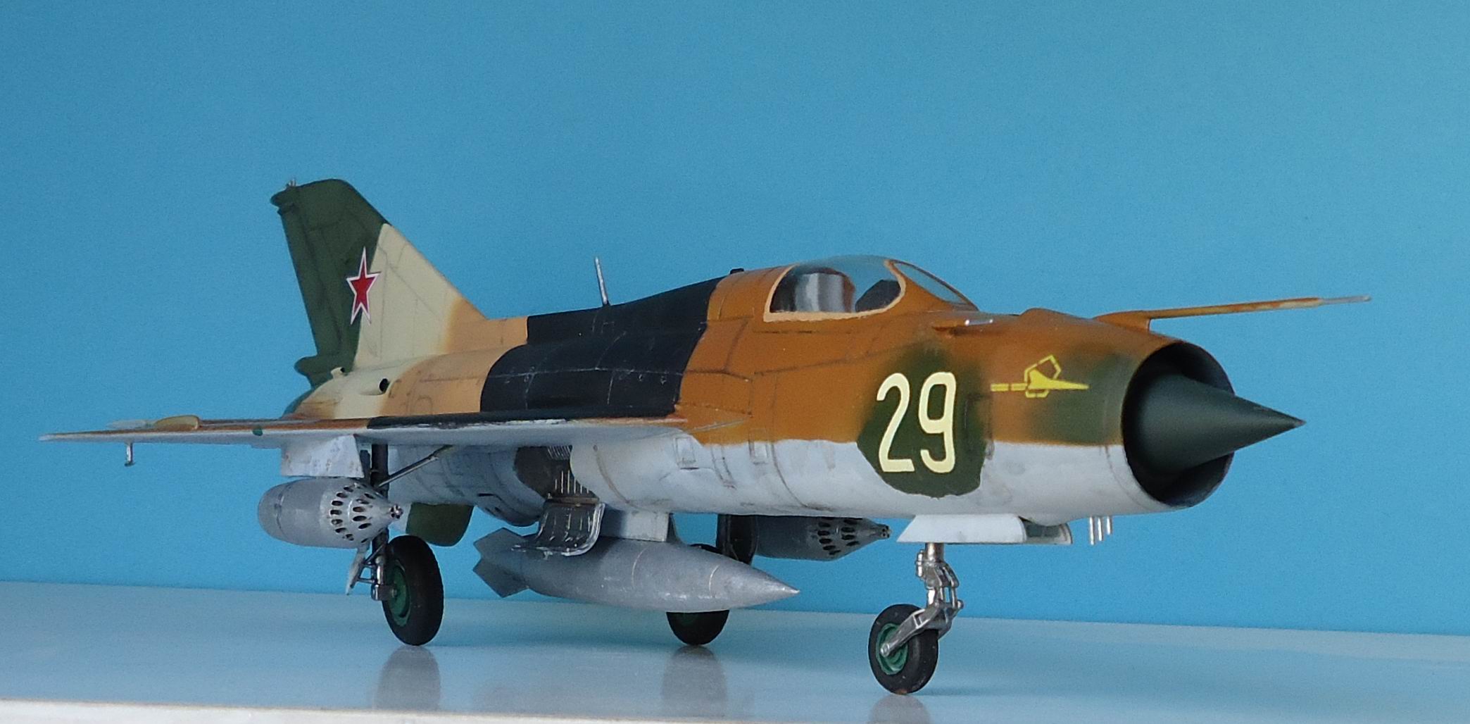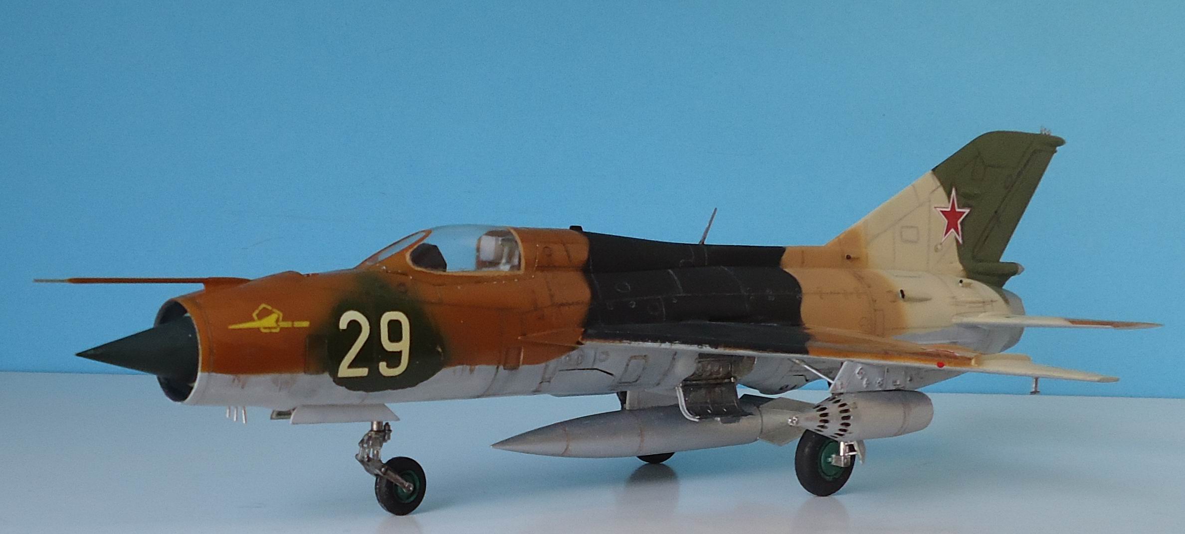 Я так понимаю, что сия модель представляет "собирательный образ" МиГ-21ПФС 59 уап Барнаульского ВВАУЛ (аэр. Славгород). Если уж для окраски как образец брался данный борт, то 3 оттенка песочного - перебор. В реале два - в носовой части песочный, в хвостовой - светло-песочный.