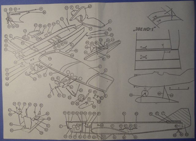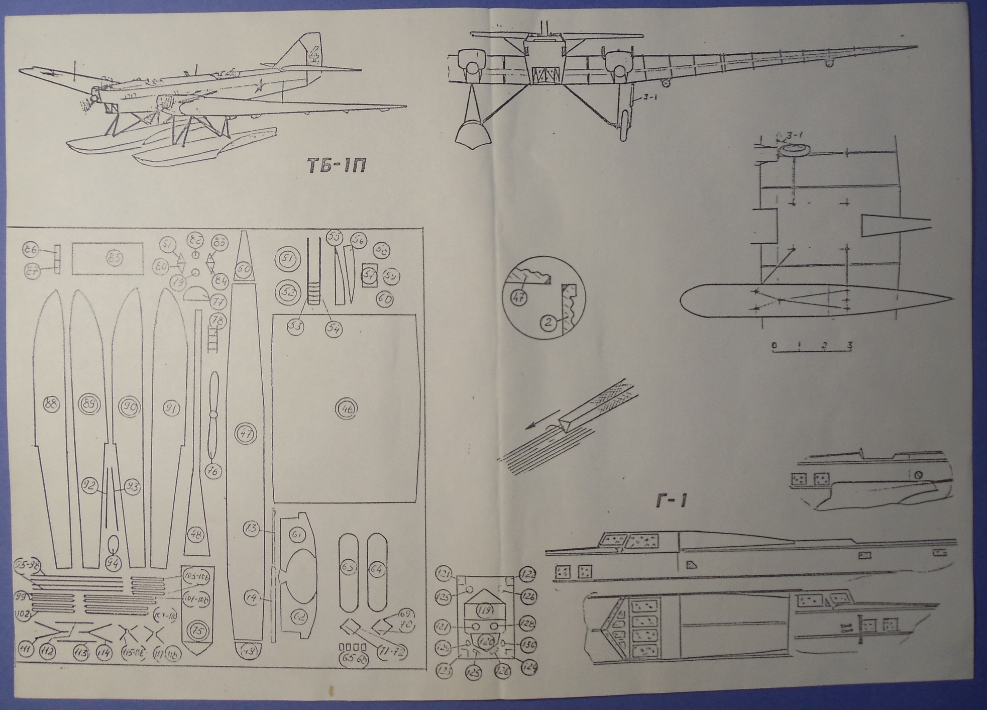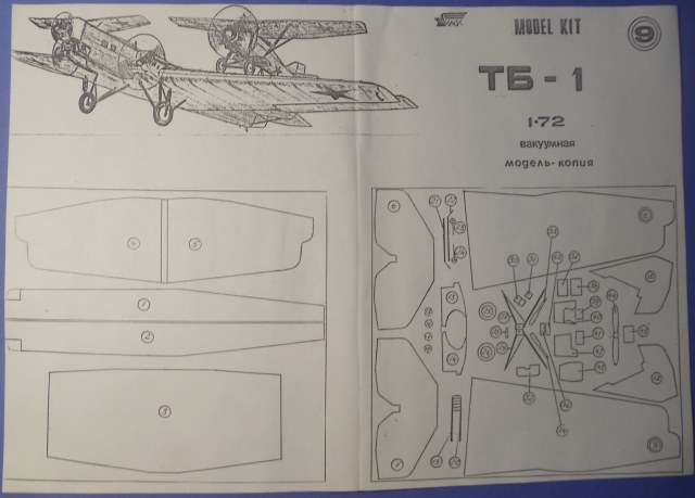 Модель состоит из трех листов инструкции, трех листов белого пластика и вакуумного остекления (свойств своих кстати от древности не потерявшего). На пластике присутствует маркировка фирмы, масштаб и год выпуска. Все это убрано в аскетичный пакет, декалей нет. Можно собрать военный вариант (ТБ-1), поплавковый (ТБ-1П), или гражданский, демилитаризованный (Г-1) с закрытой кабиной. На схеме сборки дополнительно разрисованы крепления для истребителей-сателлитов из состава звена!