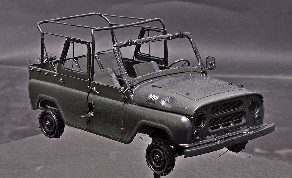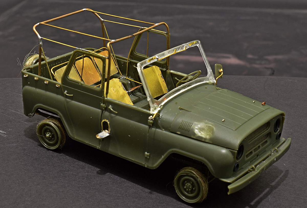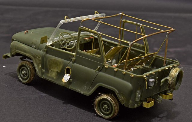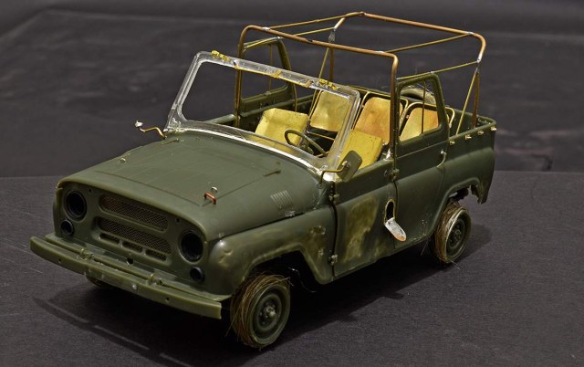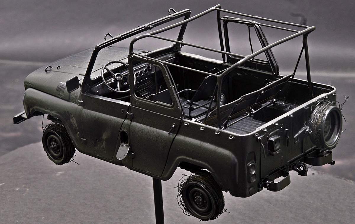УАЗик давнишний набор от TRUMPETER. Всё вроде неплохо в сборке, но пластик, кнчно, толстоват для такой модели. Но это мои придирки из-за результата отжига автомобиля. Горелость тоже не совсем так получилась, как хотел, но теперь как есть.
