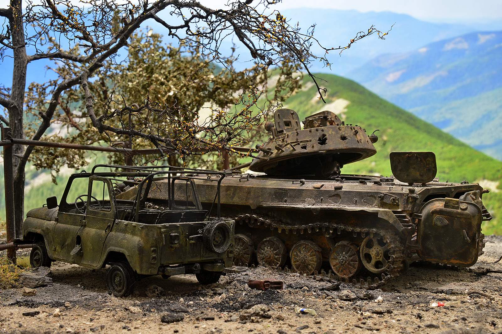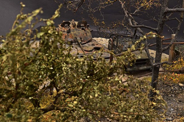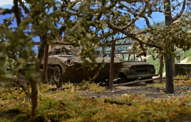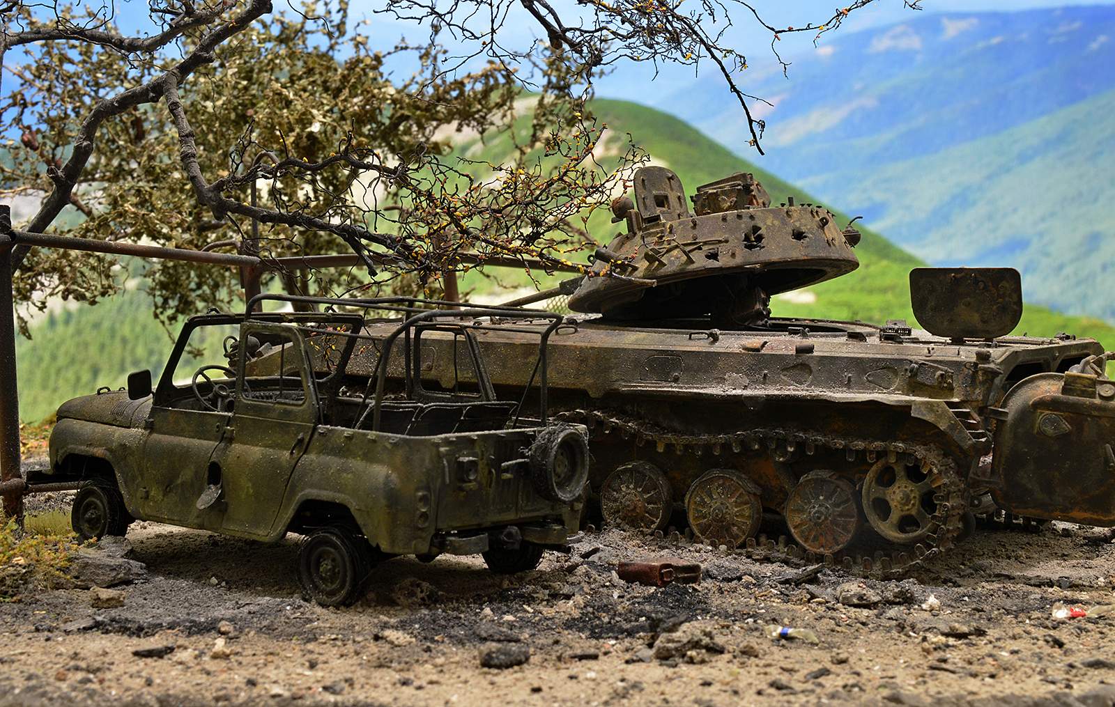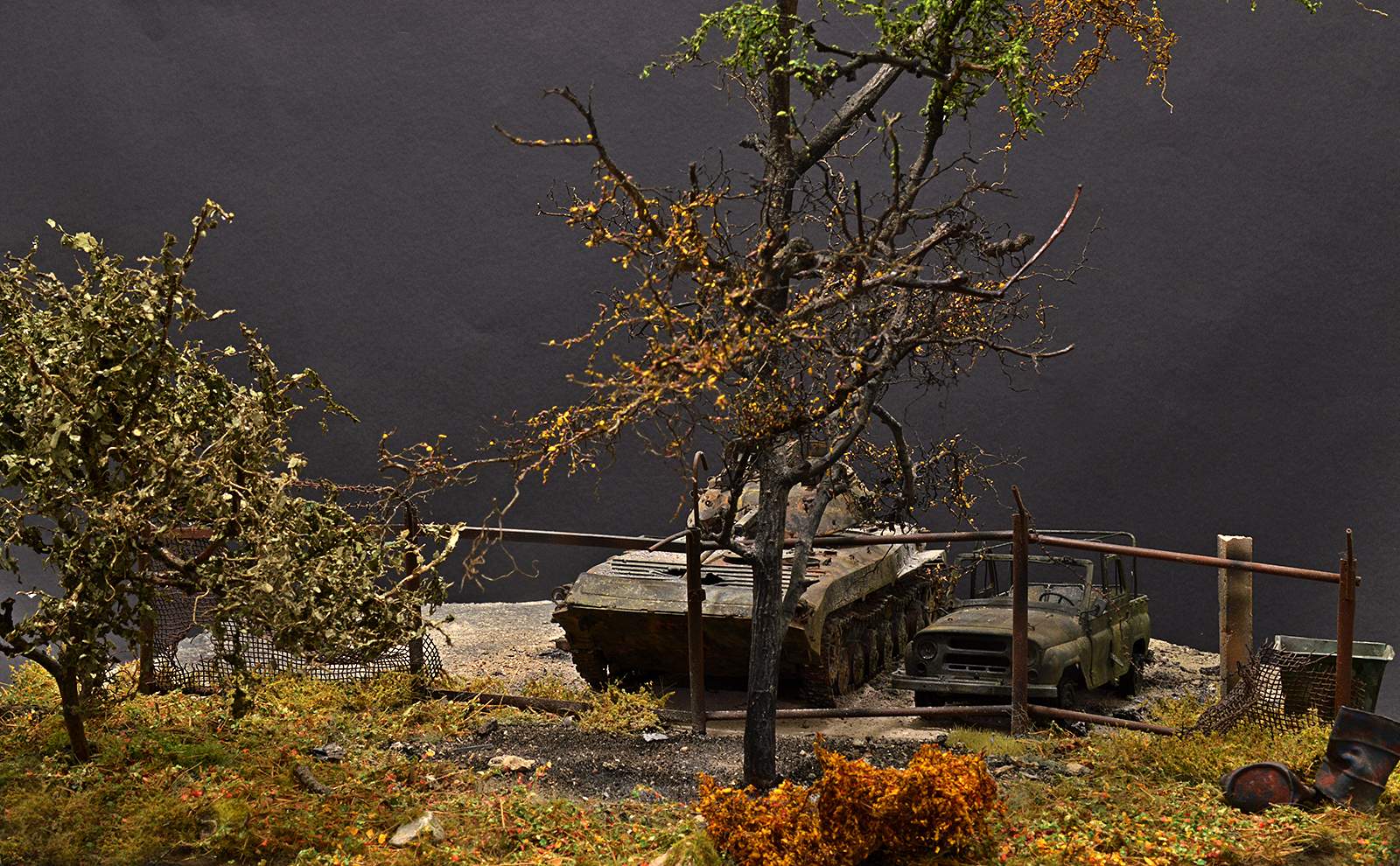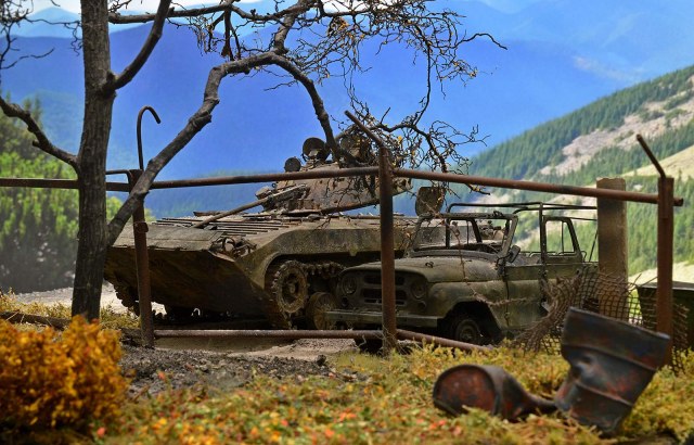 и почему я не удивлен кто это так сломал )))-работа отличная-смотрится как в реальности-добра и спокойствия не хватает же)-а фотки обалденные-фон и все такое-смотрю и вспоминаю свой блок у хим завода в грозном там мтлб сгоревшая и бмп стояли как бруствер
