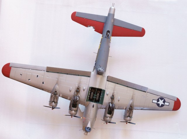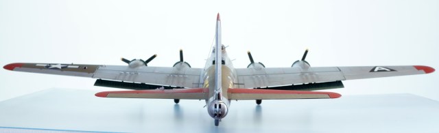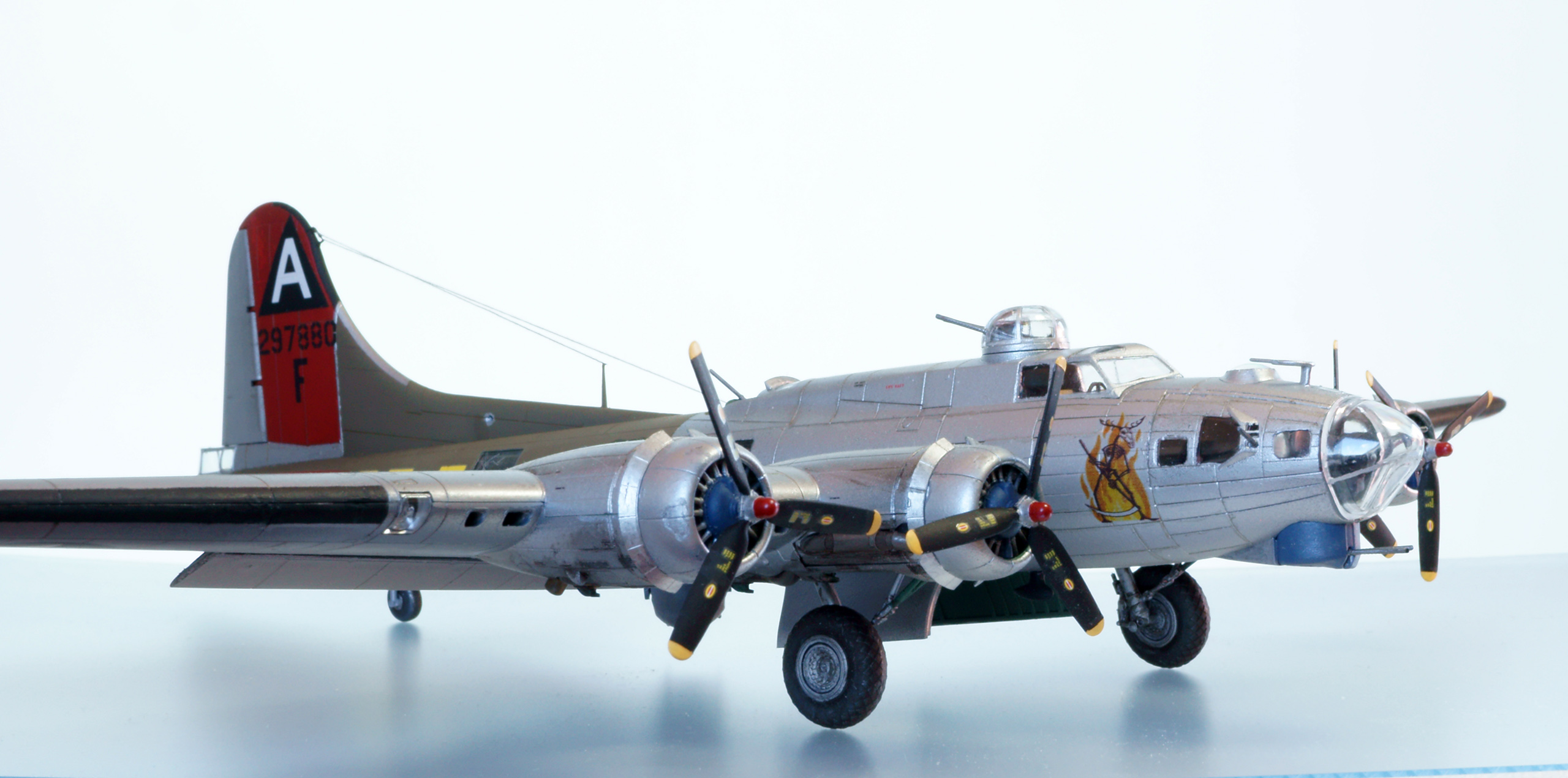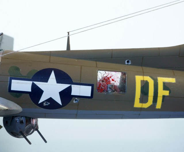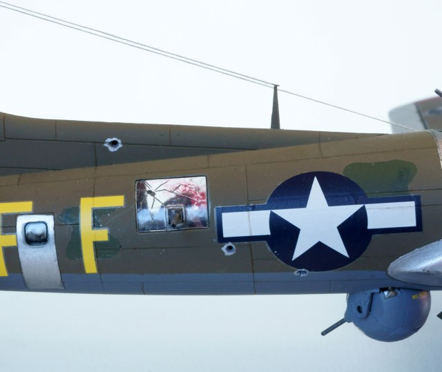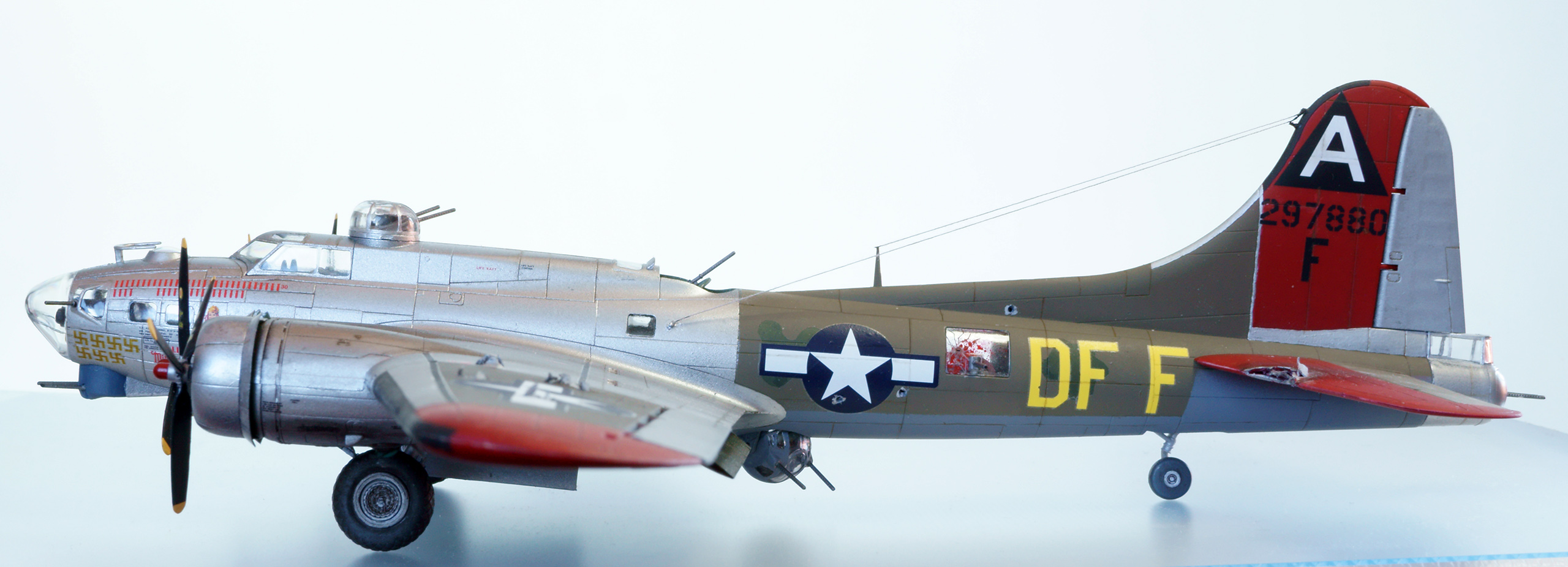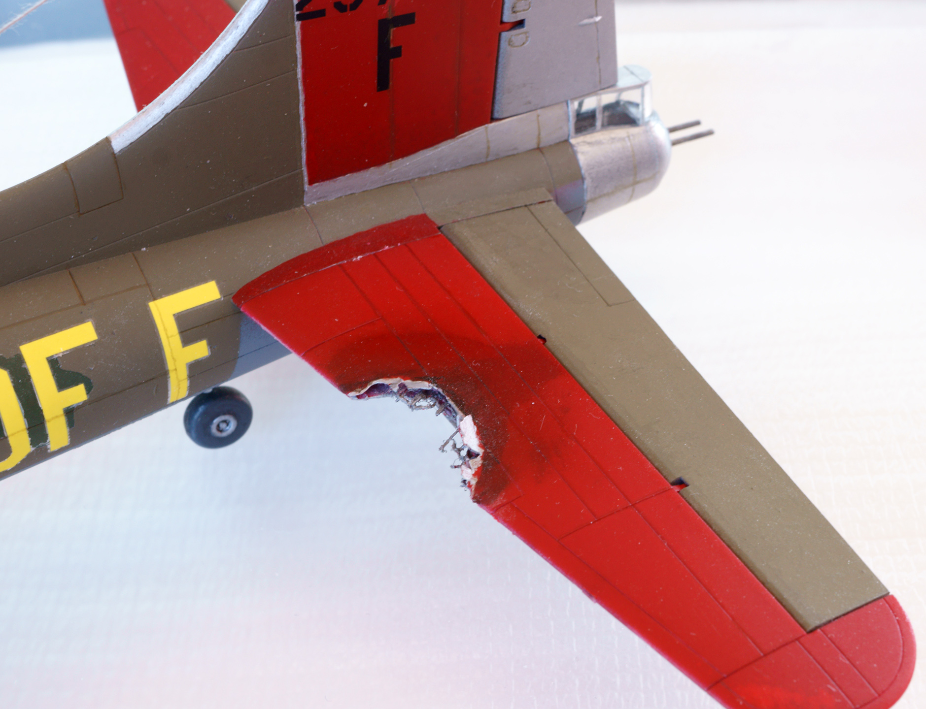 Лётчики хвалили Б-17 за хорошую выживаемость, поэтому я решил сделать модель с повреждениями, но так, чтобы не изуродовать совсем. Предполагается, что дырки на крыле - от флака, прошедшего навылет (флак взрывался на фиксированной высоте), хвостовое оперение зацепило уже взрывом флака, а фюзеляж принял пулемётную очередь от истребителя (убившую одного из стрелков).