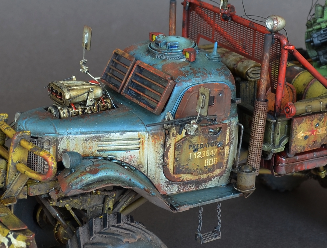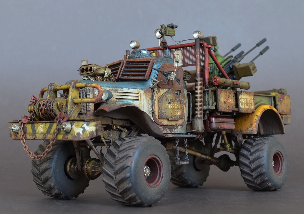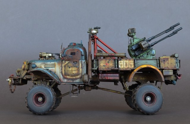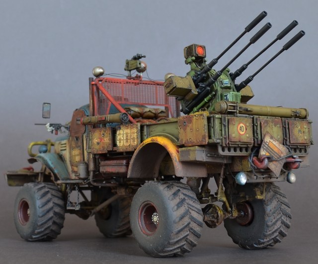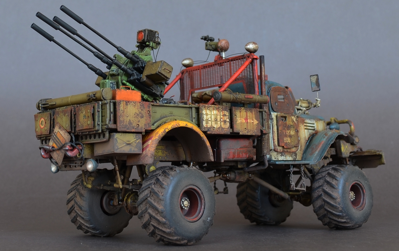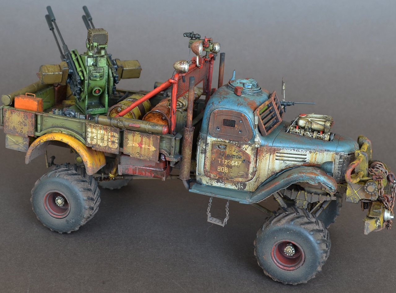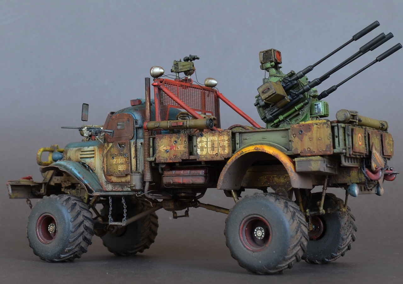 - Материалами послужили остатки от моделей.Кабина и рама от ЗиС-151 от Звезды .Передние болотники Скаут от Звезды.Задние болотники Мерседес Л4500 Звезда.Кузов ГАЗ-66 от ВЭ.Зенитка Тамия.Колеса от какой то игрушки.Прочая мелочь даже не сказу от чего.Все это было соединено пр помощи проволки пластика и различных трубок.Так же использовал остатки травления.Декали то же из остатков.