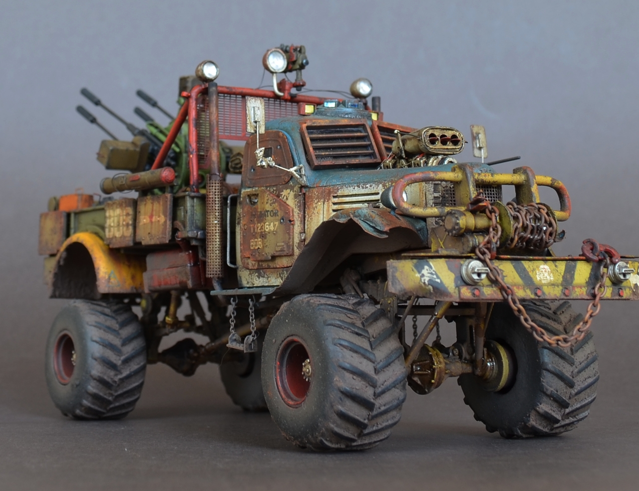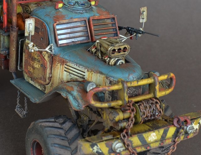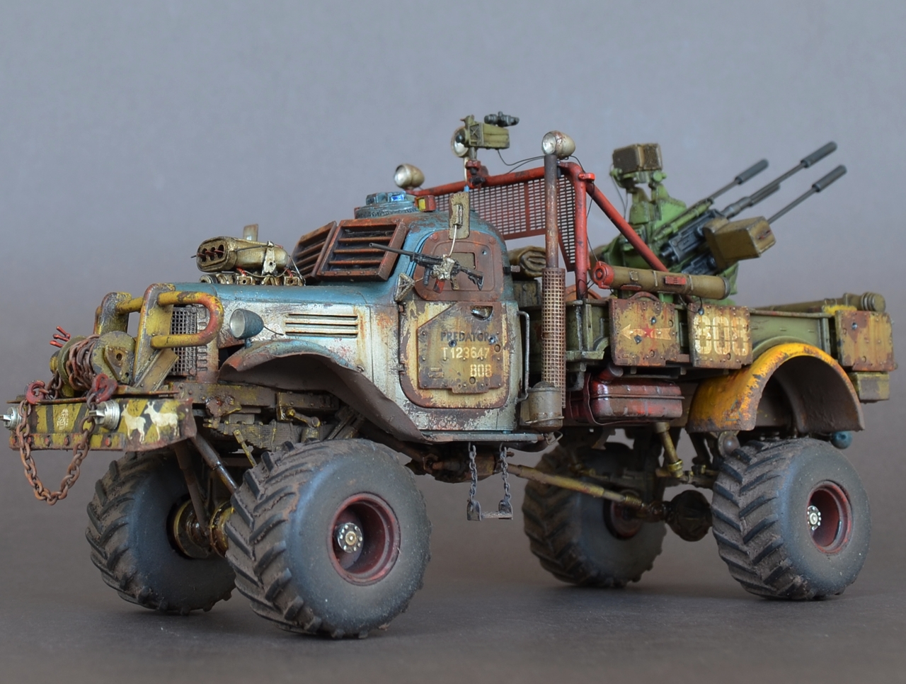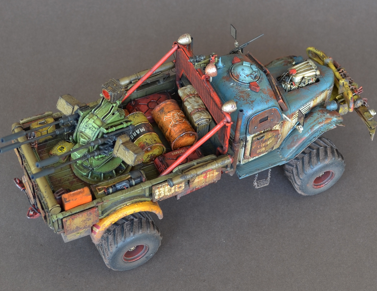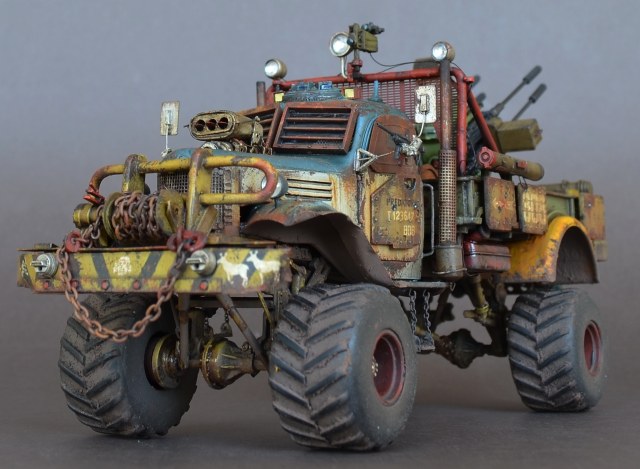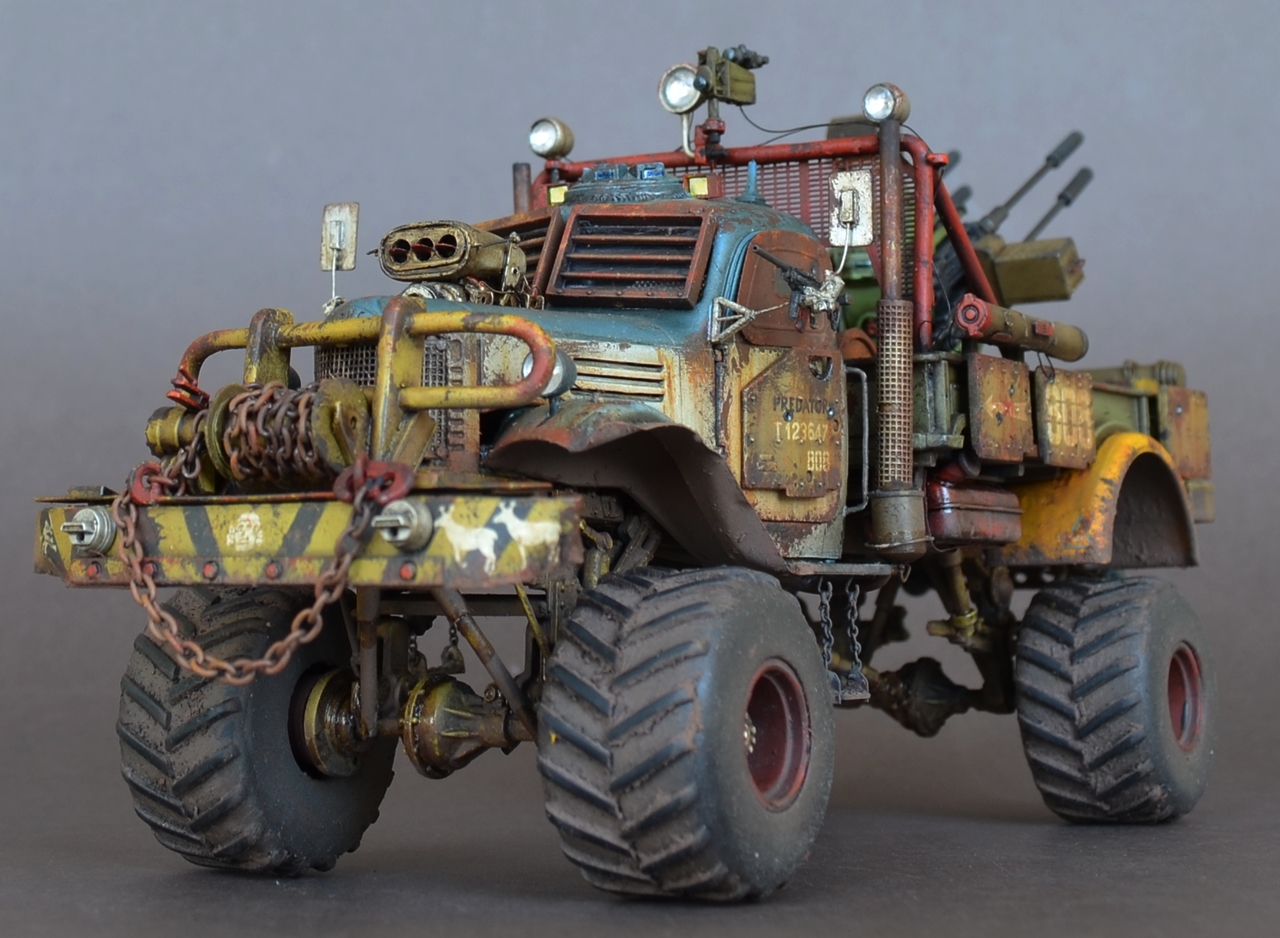 - Материалами послужили остатки от моделей.Кабина и рама от ЗиС-151 от Звезды .Передние болотники Скаут от Звезды.Задние болотники Мерседес Л4500 Звезда.Кузов ГАЗ-66 от ВЭ.Зенитка Тамия.Колеса от какой то игрушки.Прочая мелочь даже не сказу от чего.Все это было соединено пр помощи проволки пластика и различных трубок.Так же использовал остатки травления.Декали то же из остатков.