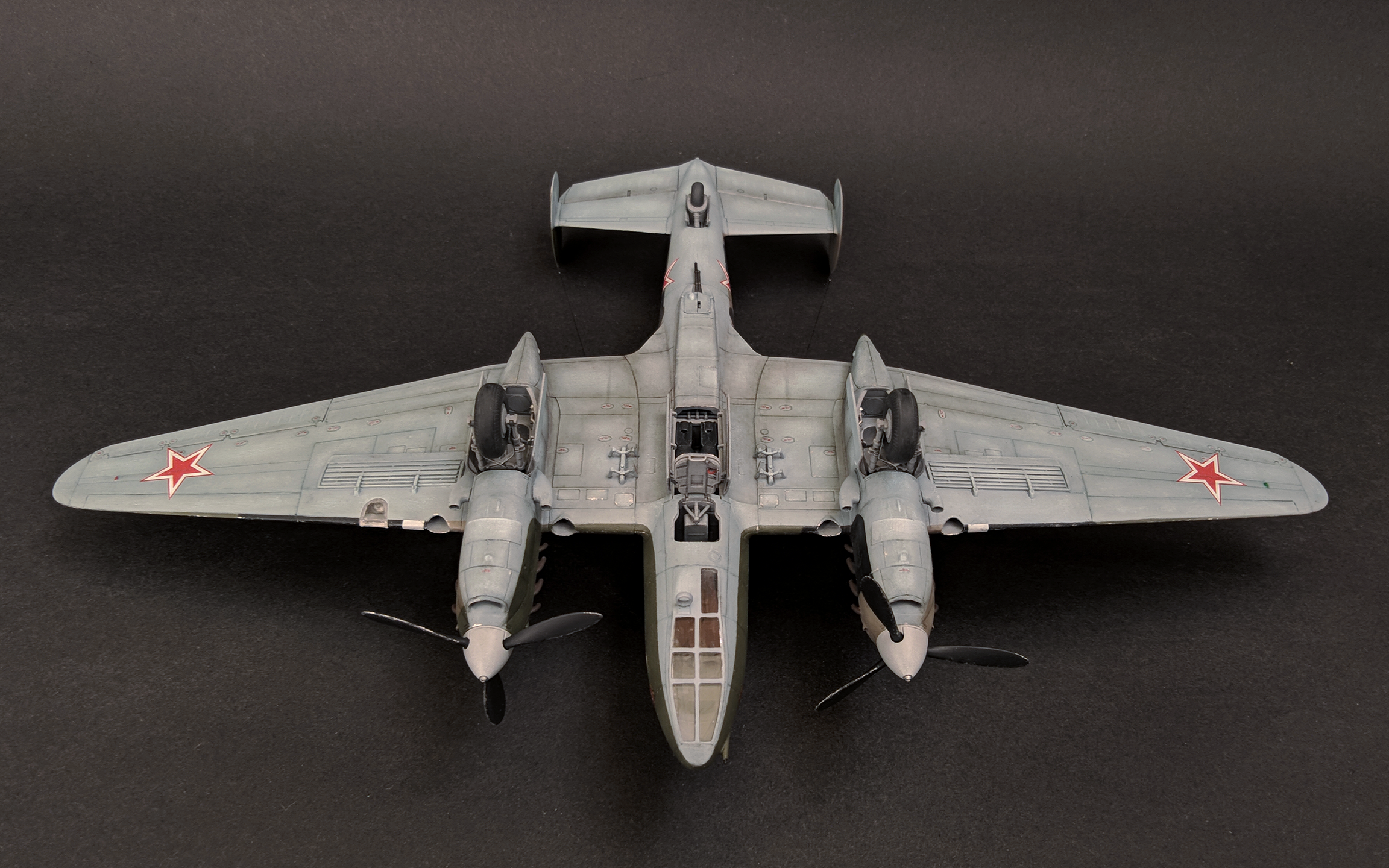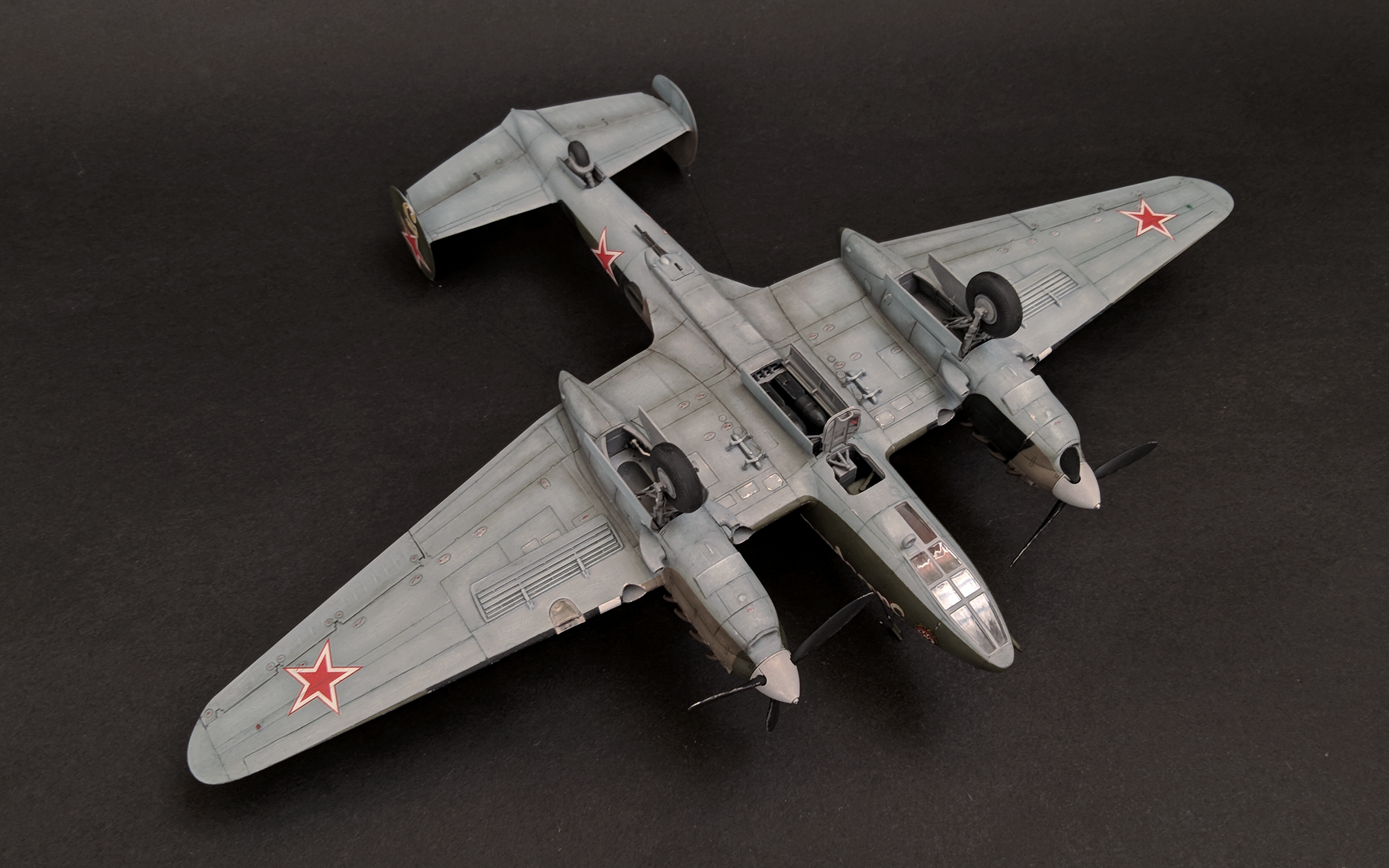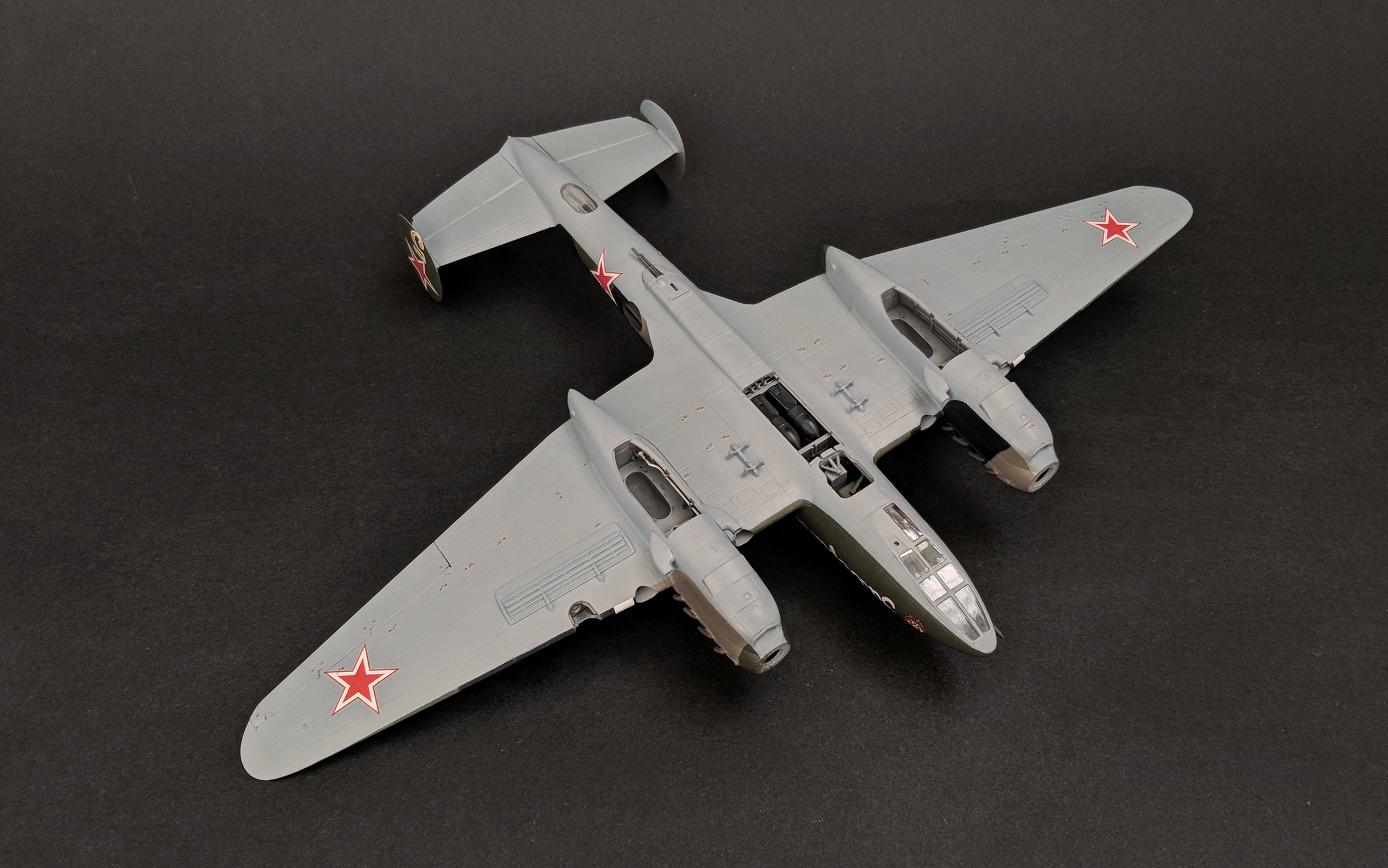 Пе-2 от Звезды в 72-м - приятный набор с приличной, как мне кажется, деталировкой "внутрянки" (которую почти не видно, но все же). Немного запарился со сборкой мотогондол, а в остальном - почти никаких трудностей. Возможно, стоило уделить чуть больше внимания обработке стыка половинок фюзеляжа и стыка верхнего люка с фюзеляжем.. Сборка практически искоробочная, доработки здесь можно сказать символические: