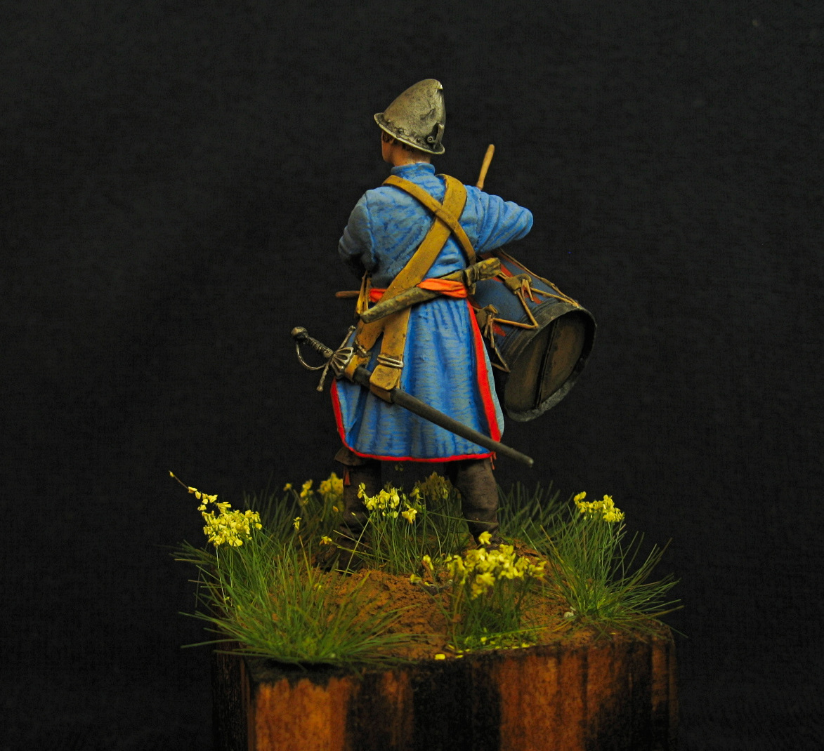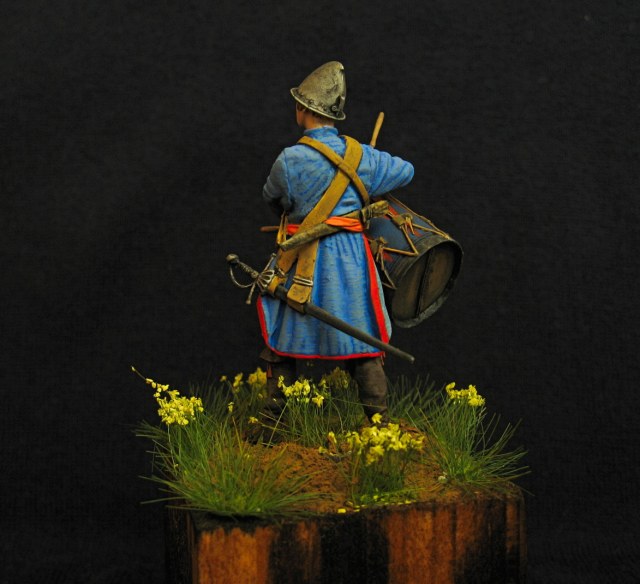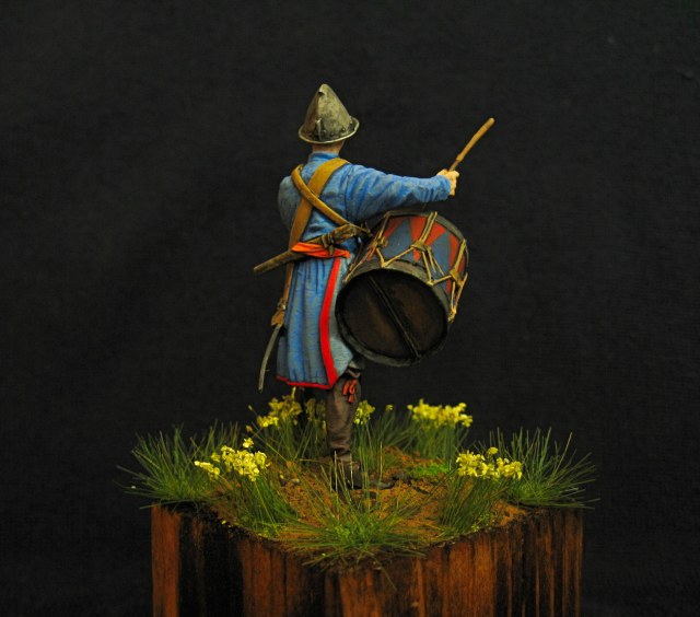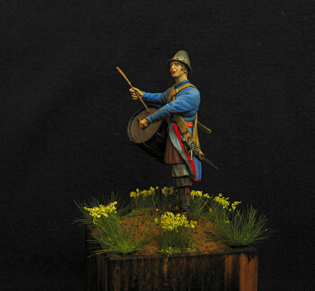 Здравствуйте. Закончил вот такого подростка барабанщика, солдатских полков. 54 мм. Смола. Акрил, эмаль. На чем основывалась реконструкция персонажа, добиться от производителя не смог.