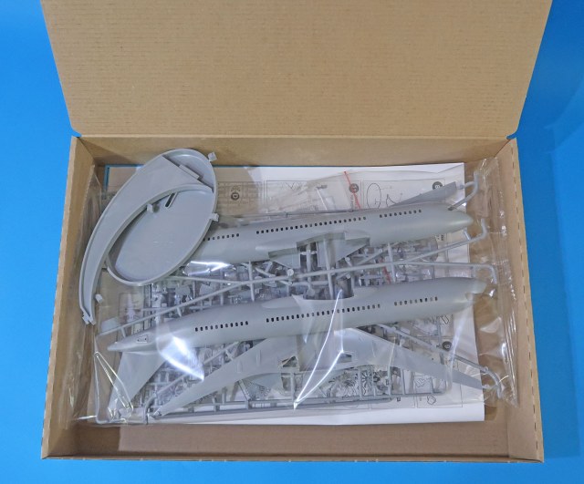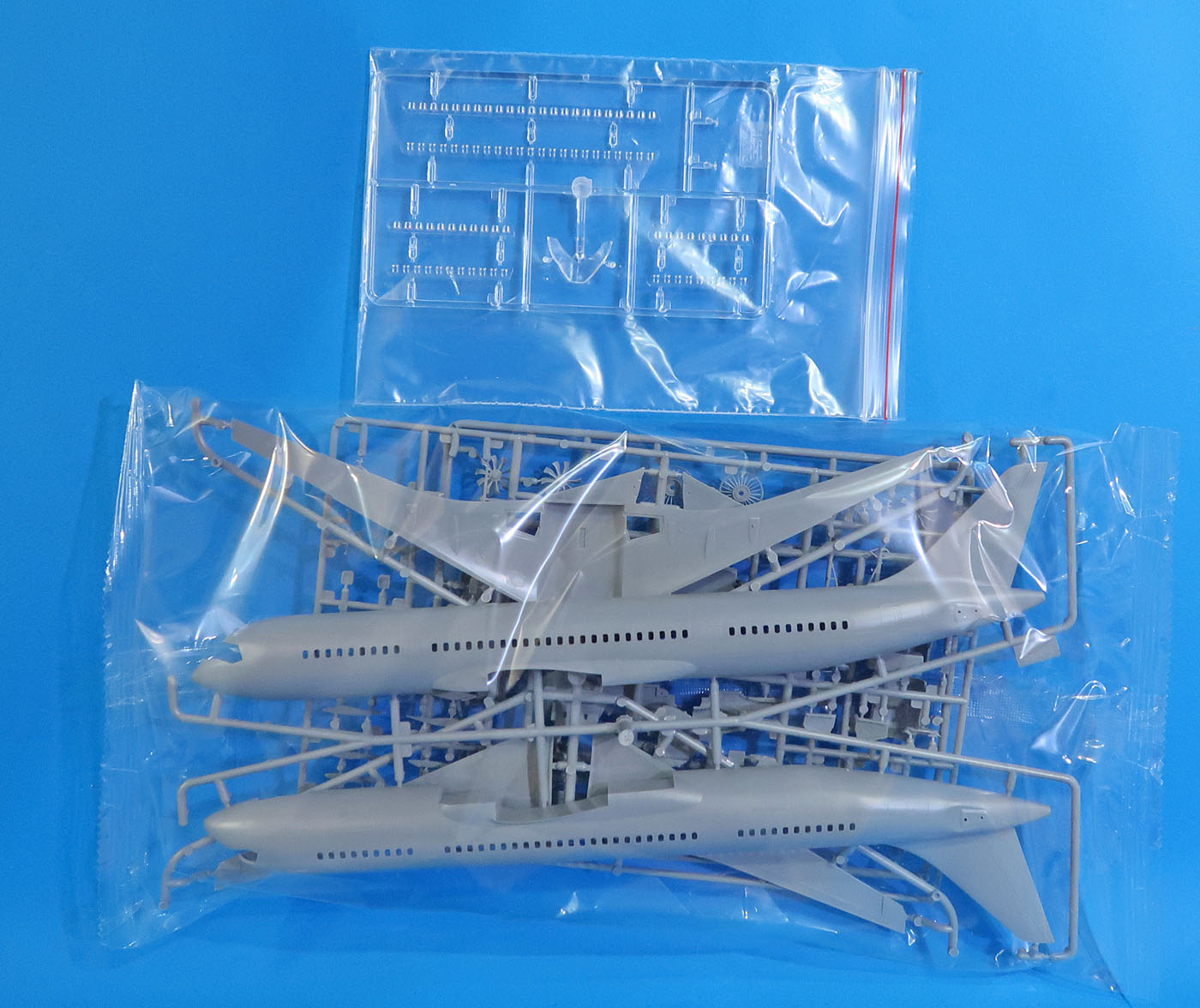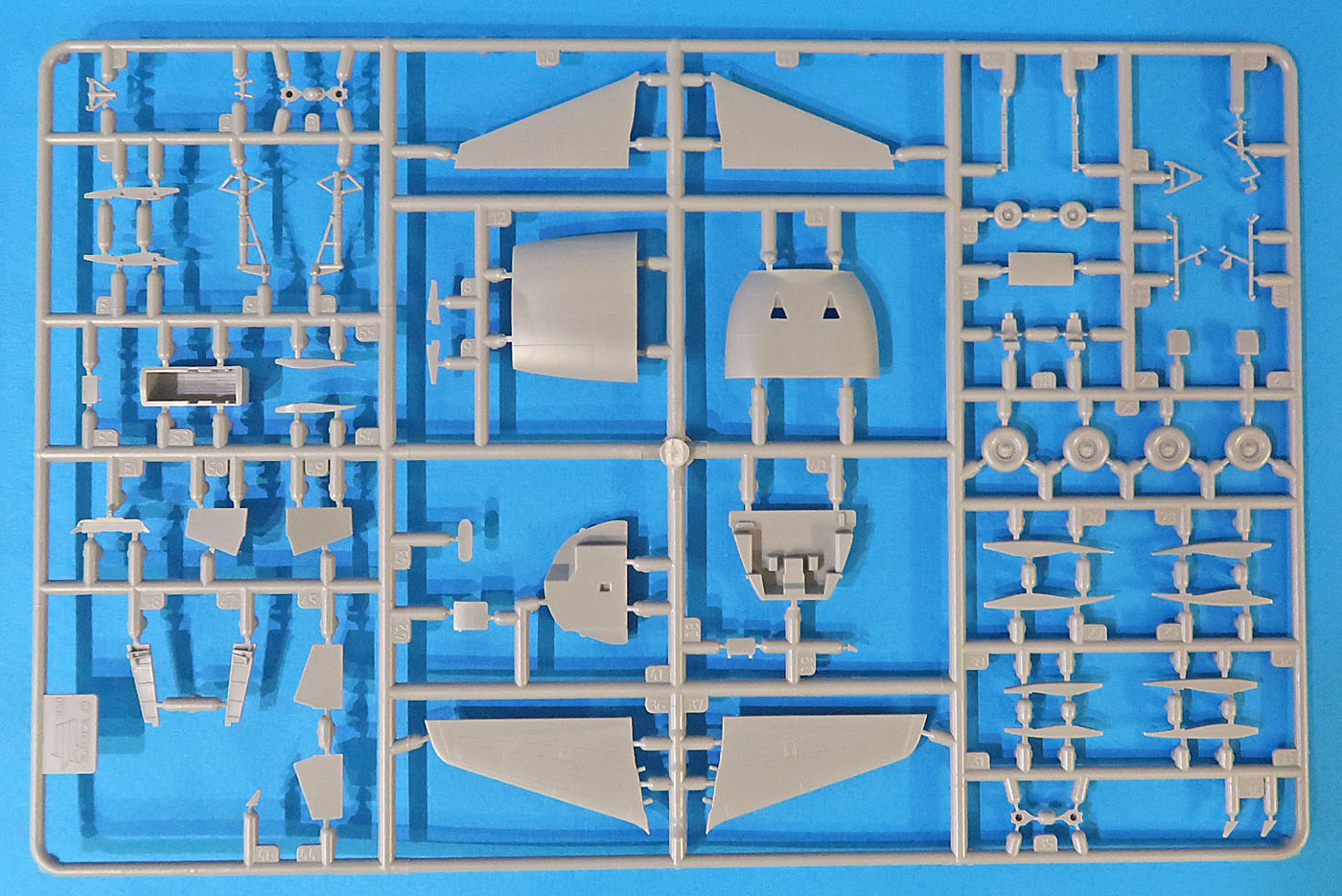 Не так уж много всего - большой пакет с литниками запаянный, небольшой пакетик с прозрачным литником на замке, подставка, декаль да лист А3 инструкции.