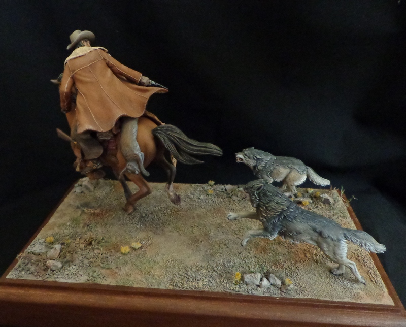 Вообще данная миниатюра, как мне показалось в процессе формирования композиции, весьма сложна в расстановке фигур. Нападающие волки ,по-реализму, должны находиться на относительно бОльшем расстоянии от объекта нападения, но тогда подставку пришлось бы делать более длинной, чтоб растянуть всю сцену, что приводит к большому размеру готового изделия. А ещё и прозрачный колпак заказывать... Громоздкое изделие получается. Поэтому сделал всё несколько компактней, волкОв ближе к жертве разместил. По оценкам моих коллег на работе - всё получилось вполне реалистично.