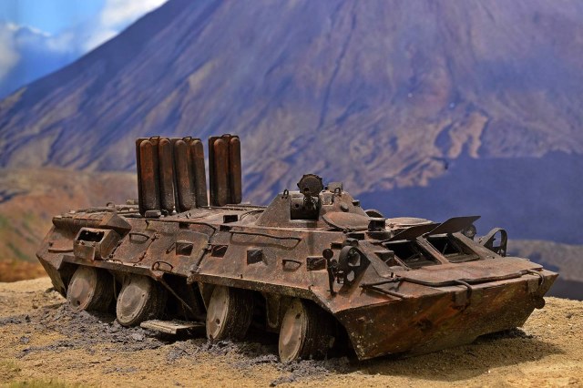 Работа сделана в моём стиле и относится к периоду 90-х годов в Таджикистане, подрыв на мине. Но при этом модель не имеет конкретного прототипа, так что по мотивам, так сказать. Можно определить данную модель практически к любому периоду, включая ближайшую современность боевых действий.