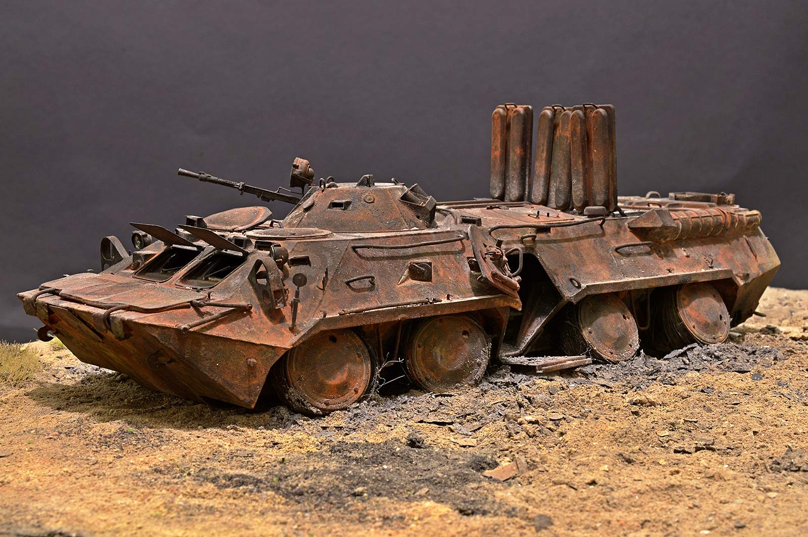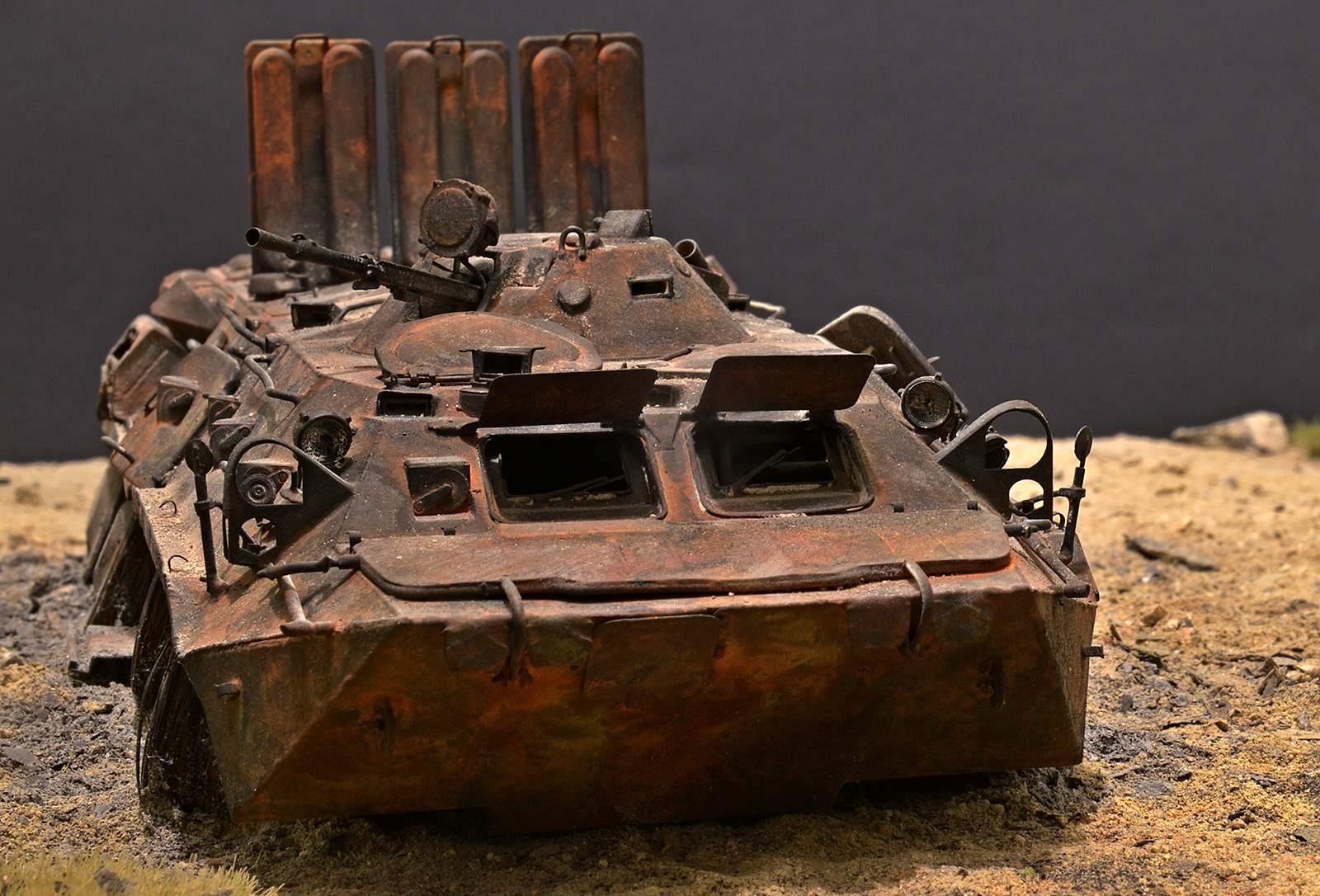 Спасибо за отзыв, коллега! БТР когда на скорости подрывается, то проскакивает точку подрыва за секунду. Вся отдача под днище уходит, и колёса в раскоряку. Если скорость приличная, то колёса не успевает оторвать, а само место подрыва остаётся сзади, как минимум в нескольких метрах. У меня воронка как раз сзади модели. А так это лишь временная подставка...
