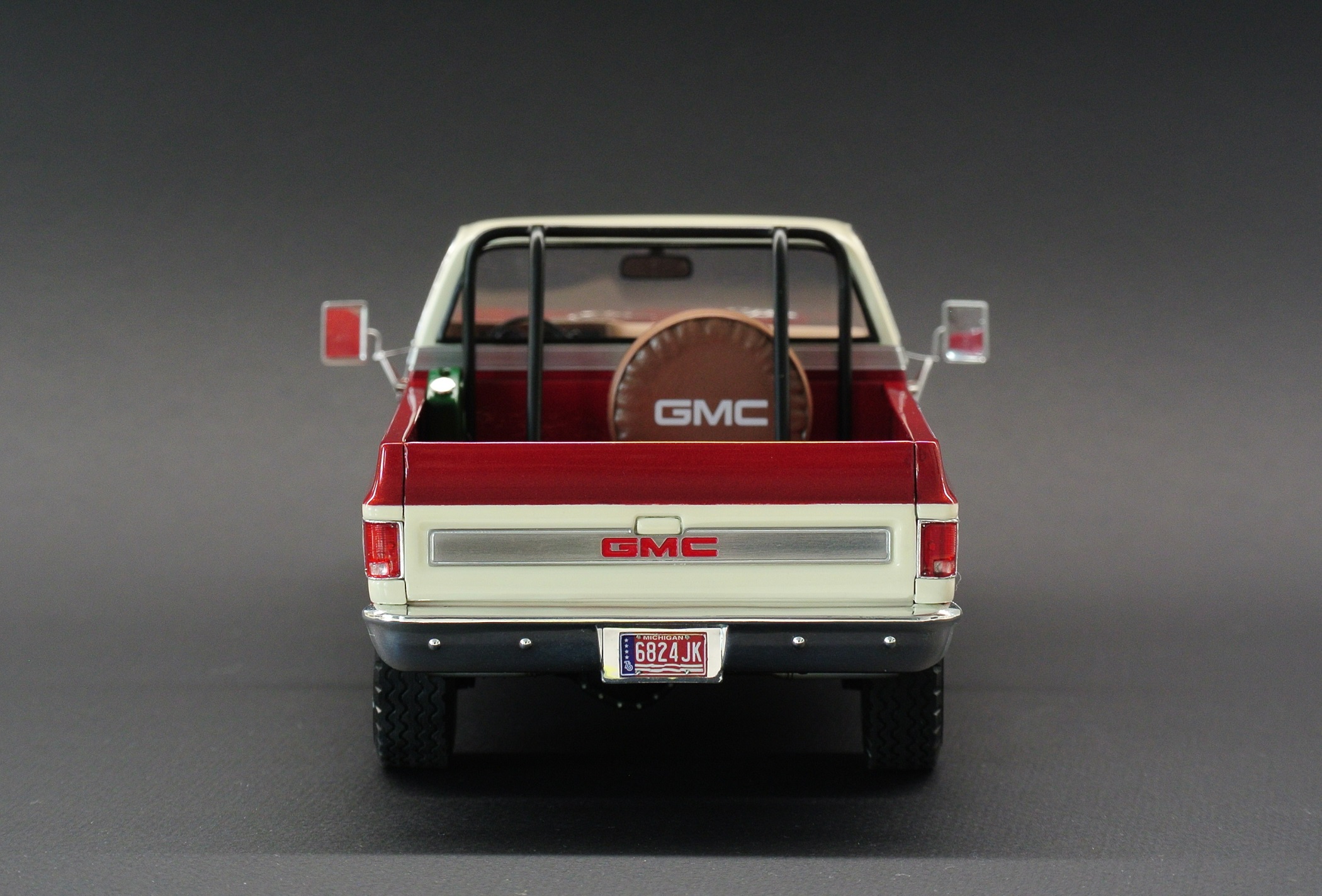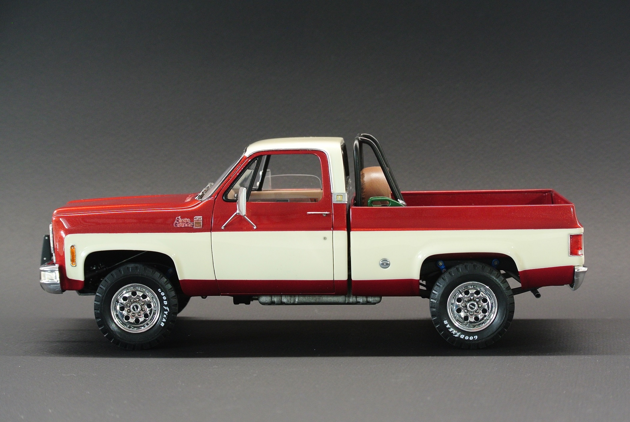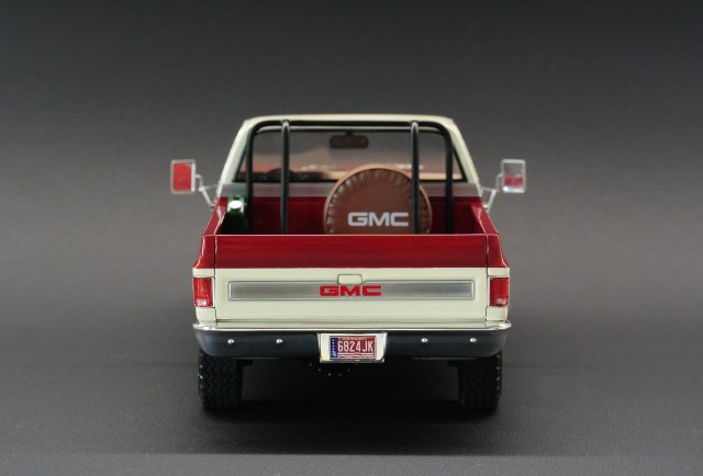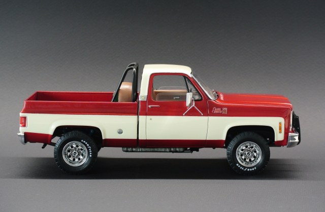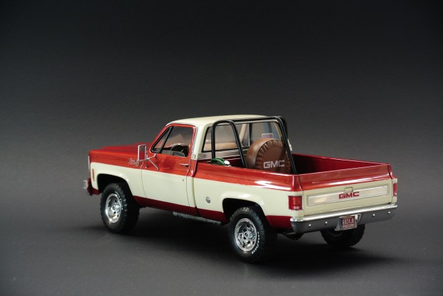 За основу был взят набор GMC Pickup with Snow Plow от Revell, выпуск образца 2012 года с отвалом для сборки варианта снегоуборщика. Поковырявшись в интернет не сложно определить что сам прототип является лифтованным GMC Sierra 1977/78 года 4х4. Первый выпуск набора датируется 78 годом и по сему имеет ряд нюансов типа беднейшей подкапотки и плоских дверных карт без детализации. Решено было реализовать чистенький лифтованный пикап. С цветовым решение выбиралось в процессе постройки, но то что окраска будет двухцветной, было очевидно с самого начала.