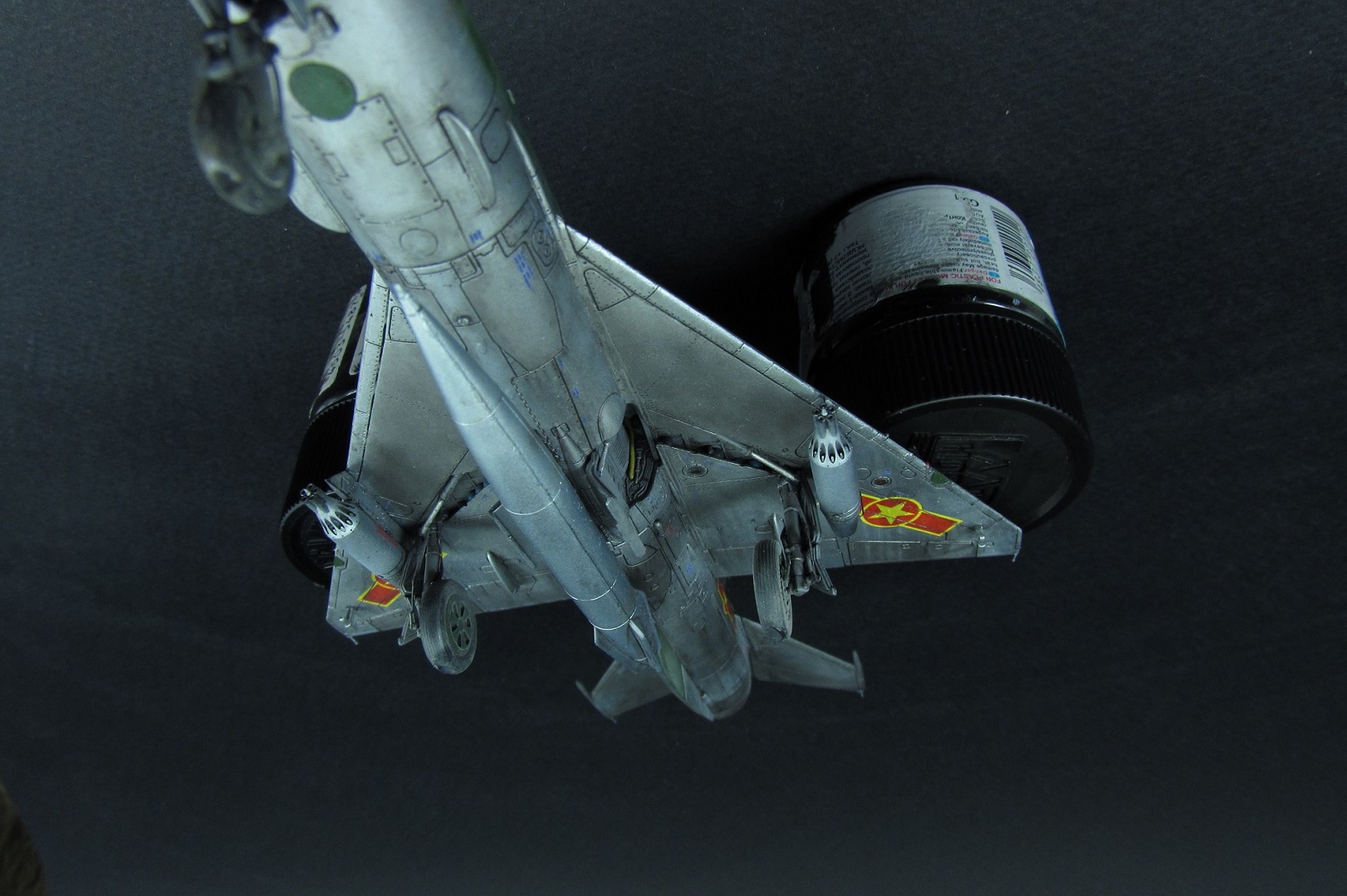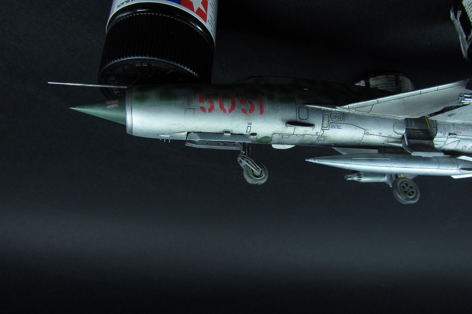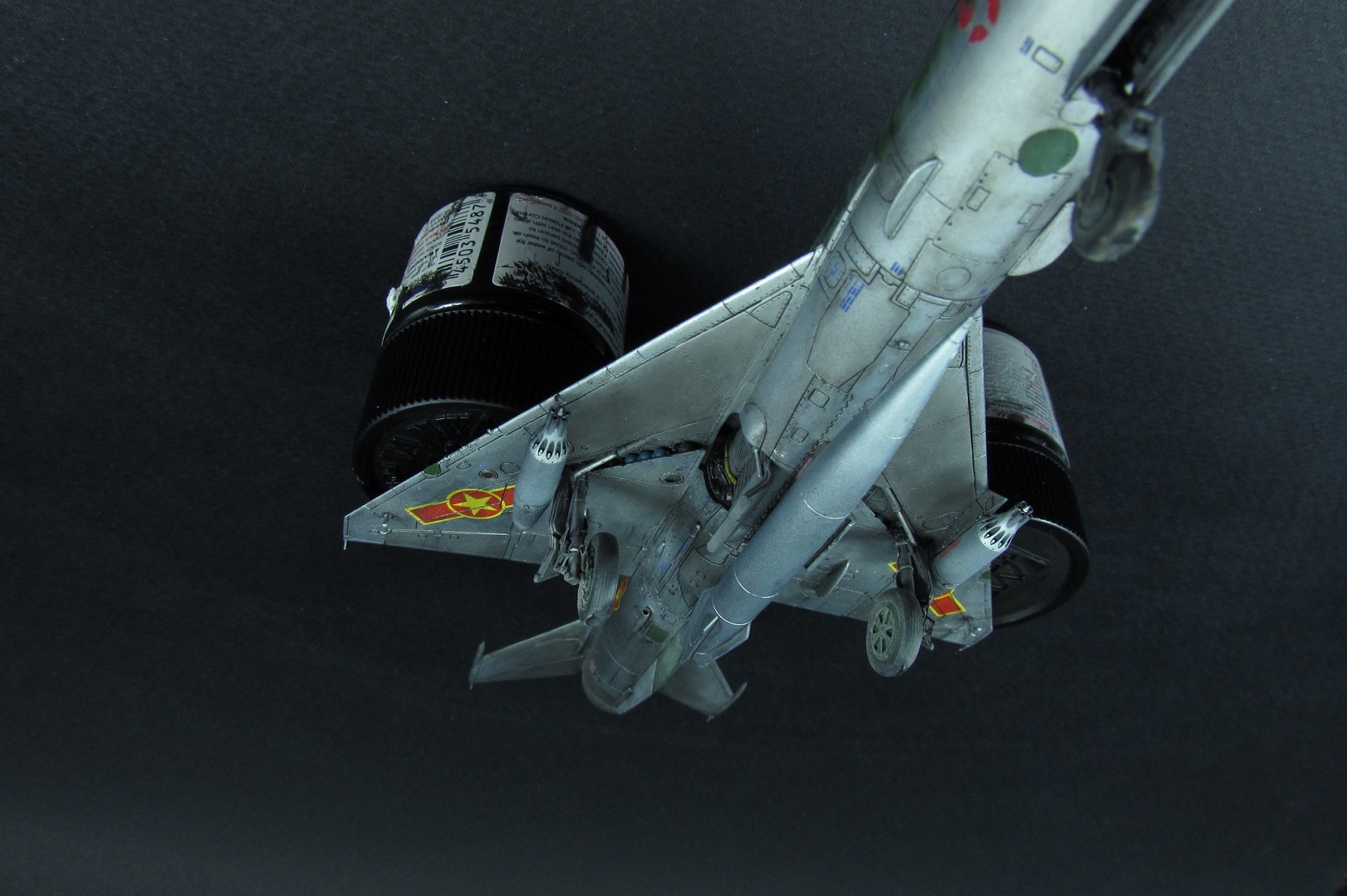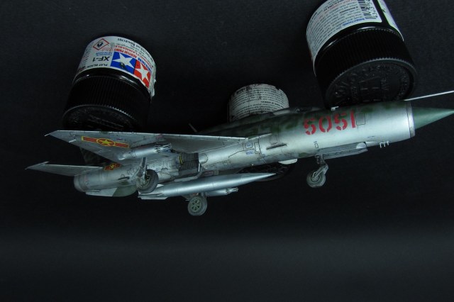 Покраска. Как писал выше, был поздно обнаружен косяк с камуфляжем данным Эдуардом. Но результат так интересно смотрелся, что я решил не перекрашивать. Просто поменял бортовой номер и назвал это МИГ-21 по мотивам вьетнамских ВВС. В это раз я старался красить все максимально отдельно. Отдельно были сопло, пилоны, стабилизаторы, носовой конус, стойки шасси, нижний гребень. Все это конечно в плане покраски очень удобно, но вот дальнейшее приклеивание требует некоторой сноровки и большой аккуратности, а так же хорошей предварительной подгонки деталей. К тому же оказалось что АКшные металлики мгновенно растворяются текучем клеем, поэтому нужна предельная аккуратность! Металликами, как вы поняли, пользовался от АК-interactive. Из всего что есть и пробовал это самое лучшее. Близко к ним еще Supermetallic и Silver8 от Mr.Hobby. Но для себя понял что однозначно АК, тем более их не нужно разбавлять, они уже готовы к заливке в аэрограф. Изобразил панельный эффект, но за камуфляжем и визерингом его почти не видно.
