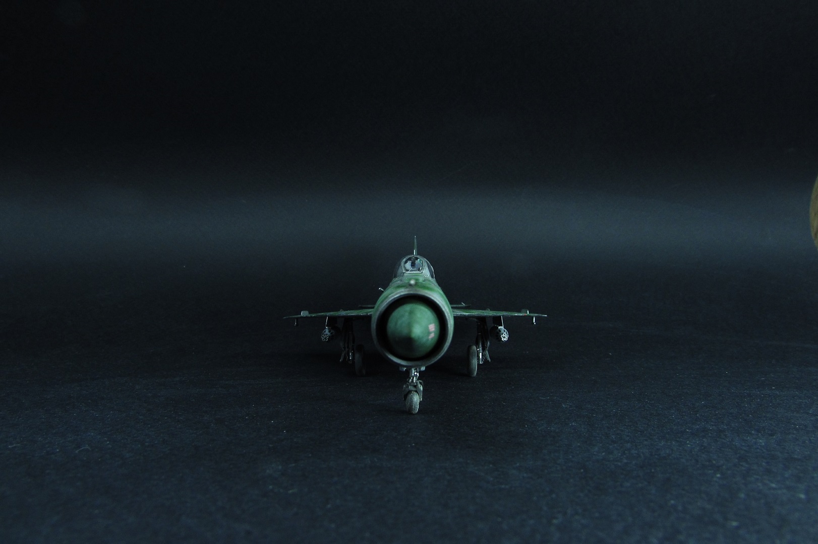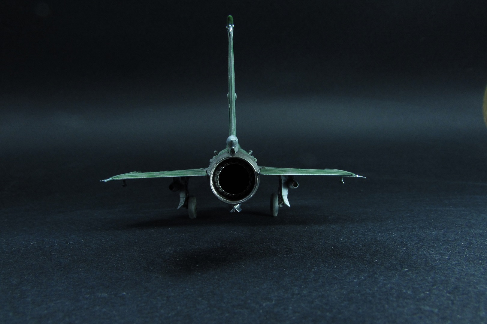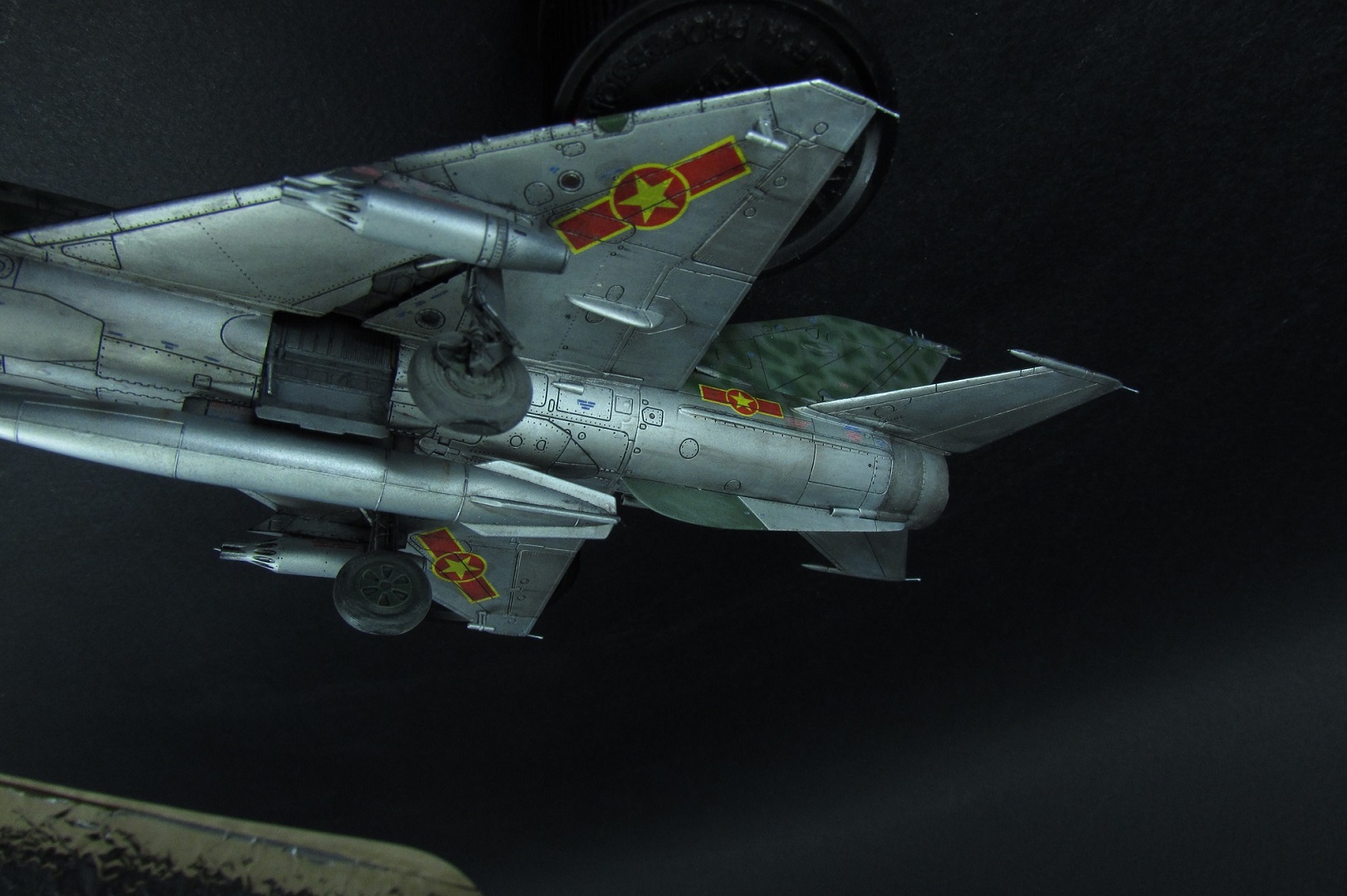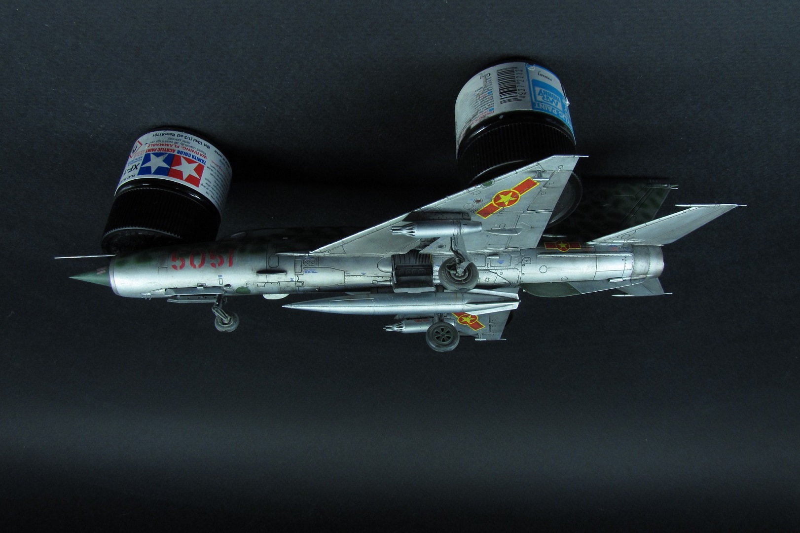 Покраска. Как писал выше, был поздно обнаружен косяк с камуфляжем данным Эдуардом. Но результат так интересно смотрелся, что я решил не перекрашивать. Просто поменял бортовой номер и назвал это МИГ-21 по мотивам вьетнамских ВВС. В это раз я старался красить все максимально отдельно. Отдельно были сопло, пилоны, стабилизаторы, носовой конус, стойки шасси, нижний гребень. Все это конечно в плане покраски очень удобно, но вот дальнейшее приклеивание требует некоторой сноровки и большой аккуратности, а так же хорошей предварительной подгонки деталей. К тому же оказалось что АКшные металлики мгновенно растворяются текучем клеем, поэтому нужна предельная аккуратность! Металликами, как вы поняли, пользовался от АК-interactive. Из всего что есть и пробовал это самое лучшее. Близко к ним еще Supermetallic и Silver8 от Mr.Hobby. Но для себя понял что однозначно АК, тем более их не нужно разбавлять, они уже готовы к заливке в аэрограф. Изобразил панельный эффект, но за камуфляжем и визерингом его почти не видно.