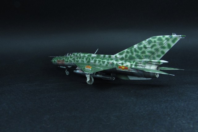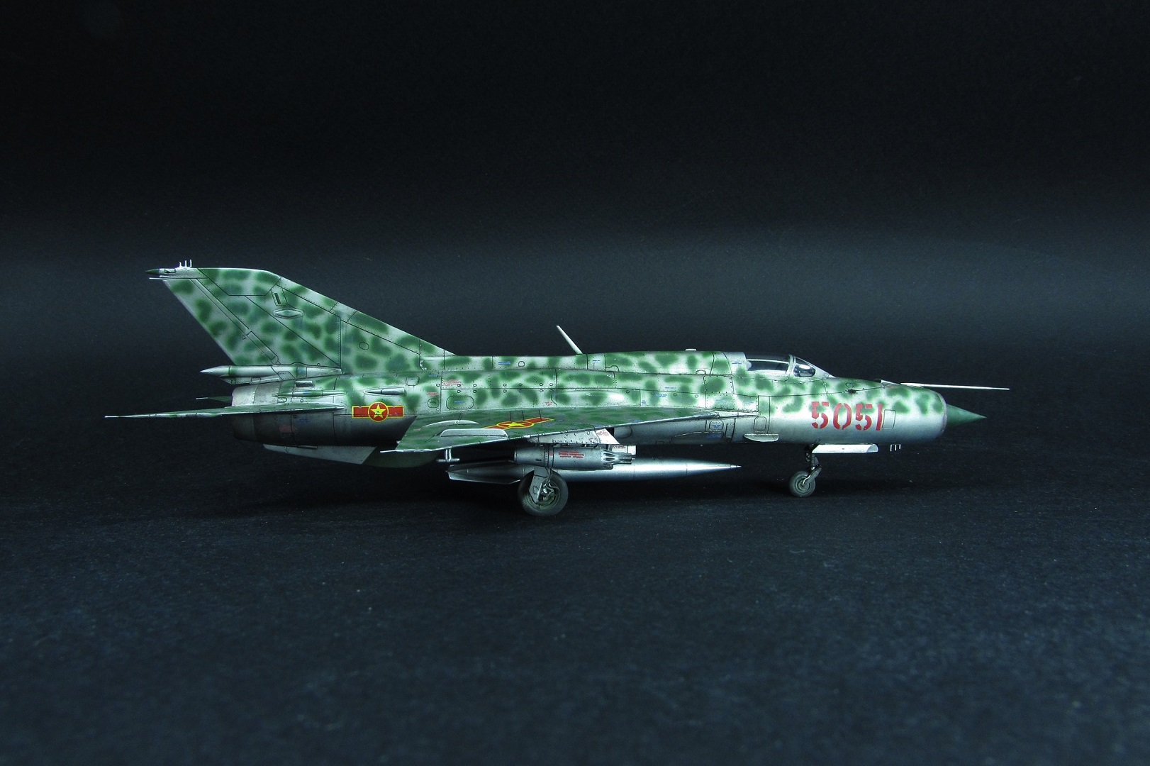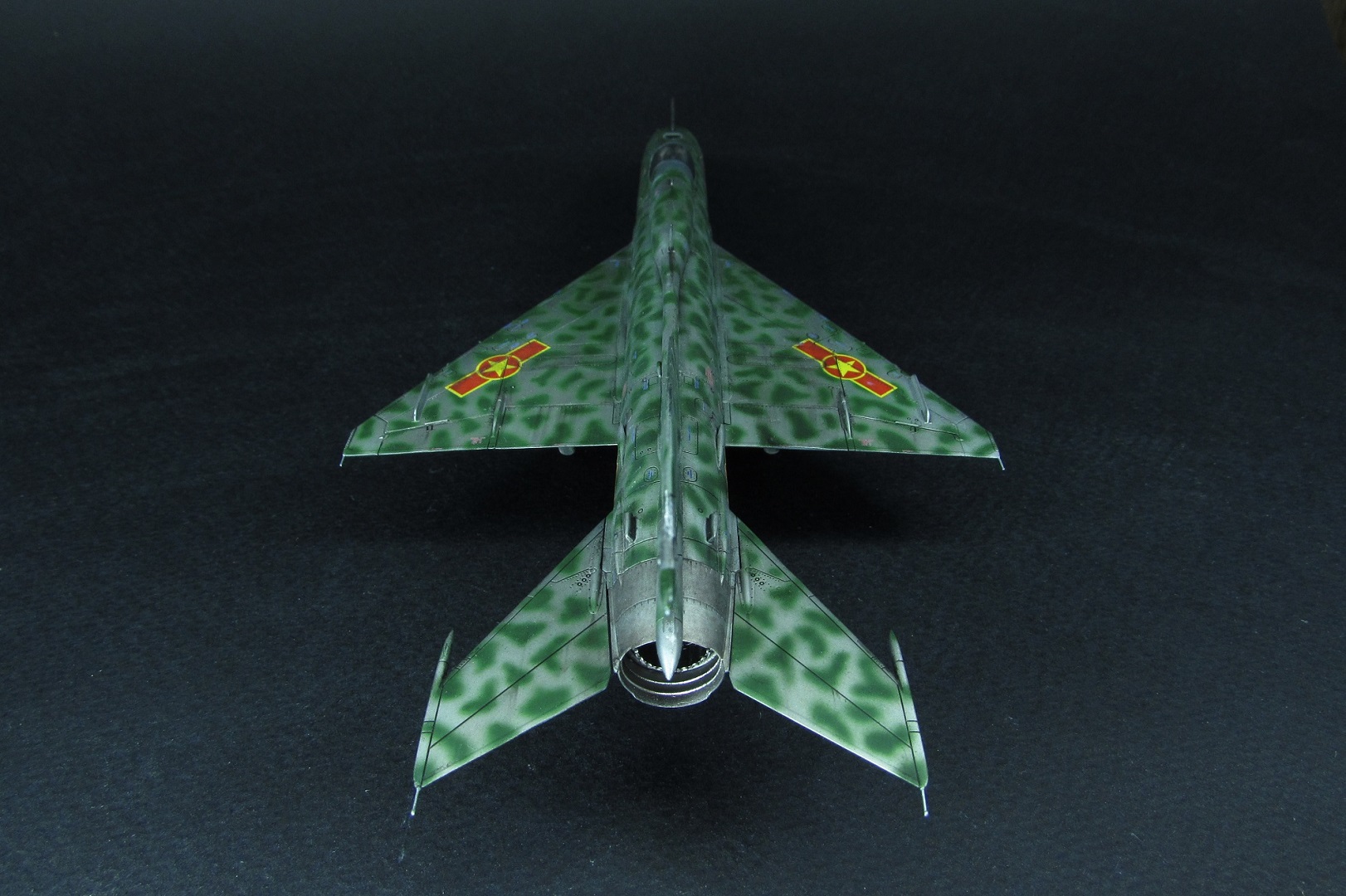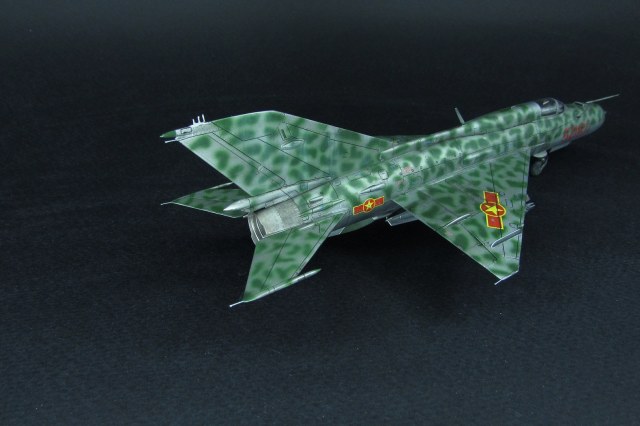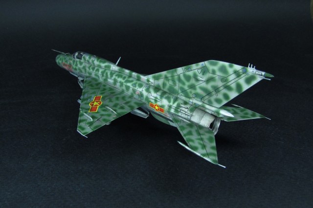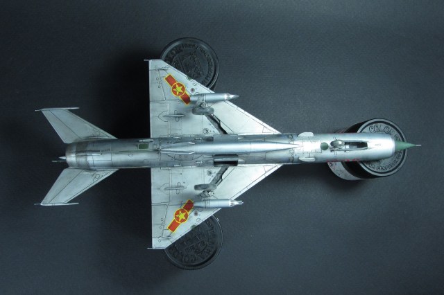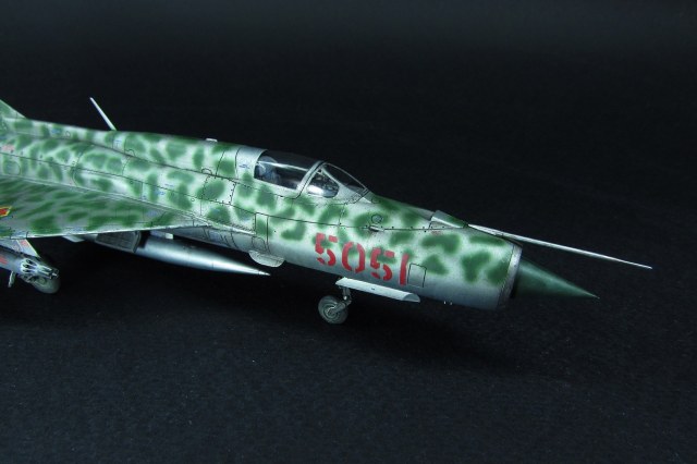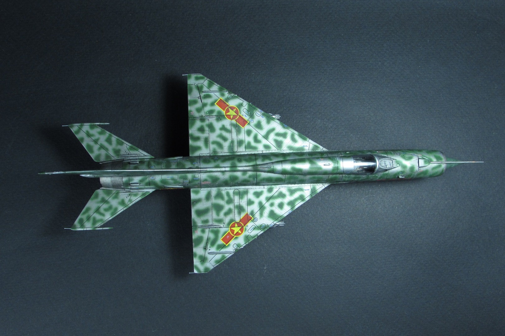 Заказчиком был выбран вариант вьетнамских ВВС. Оказалось, что в схеме, которую дает Эдуард, есть ошибка - фон камуфляжа должен быть зеленным, а не серебристым. Её я естественно обнаружил когда уже покрасил. Было решено что реального прототипа у этого самолёта не будет, просто модель по мотивам вьетнамских МиГ-21. В итоге получилось очень даже симпатично, мне нравится. Цели охоты за мм и блохами не стояло).