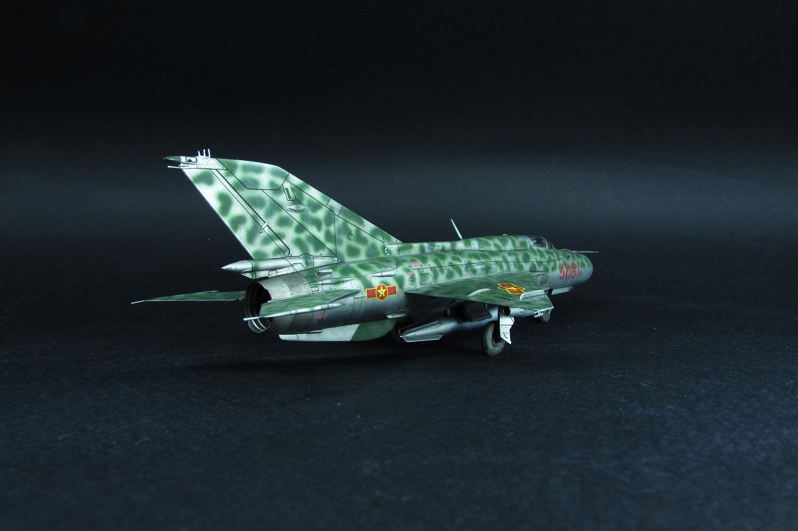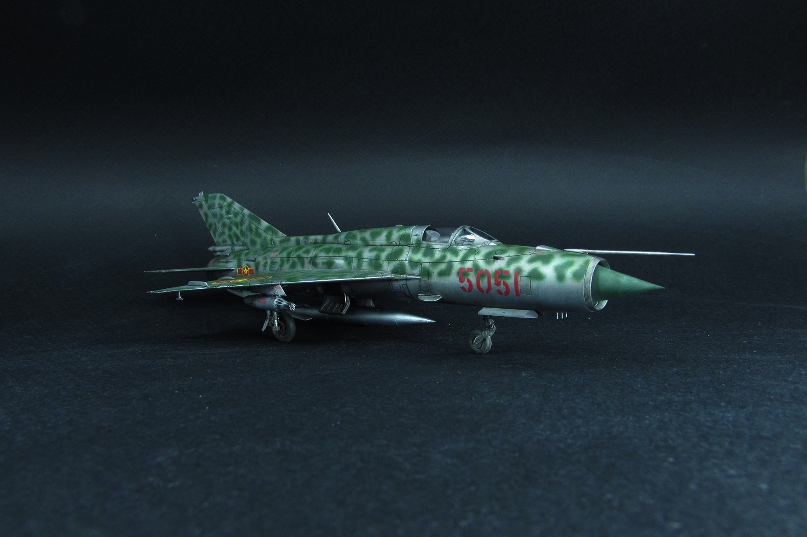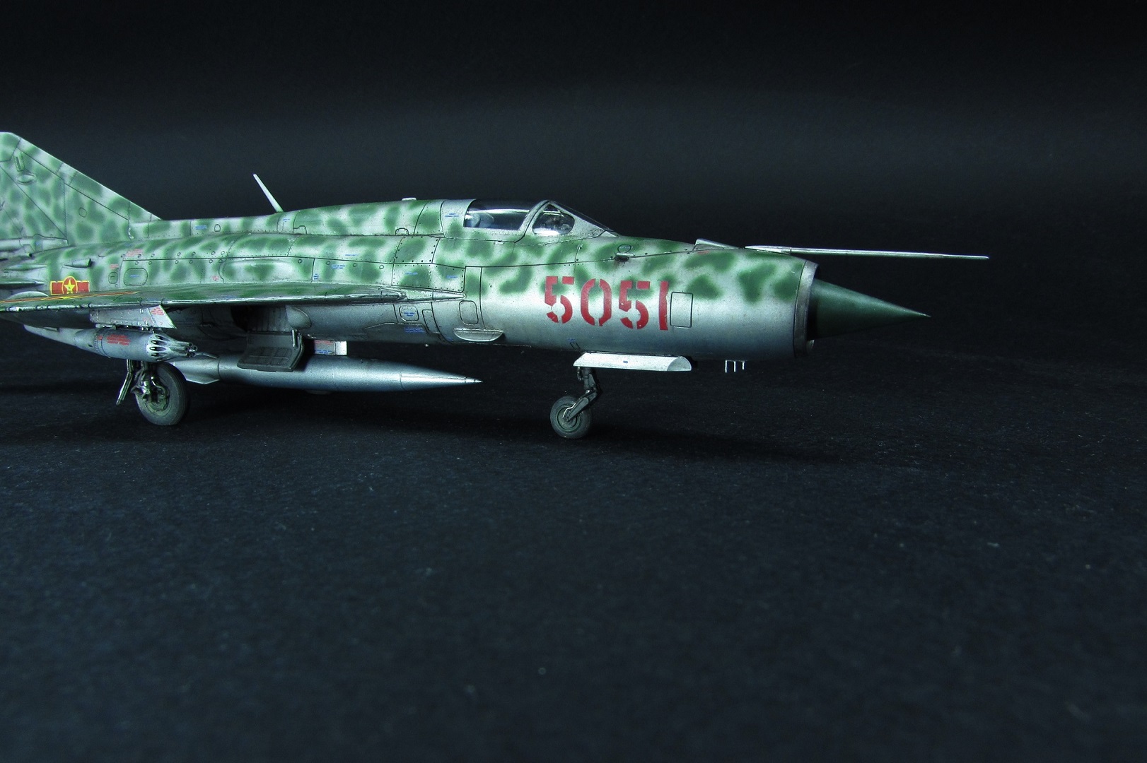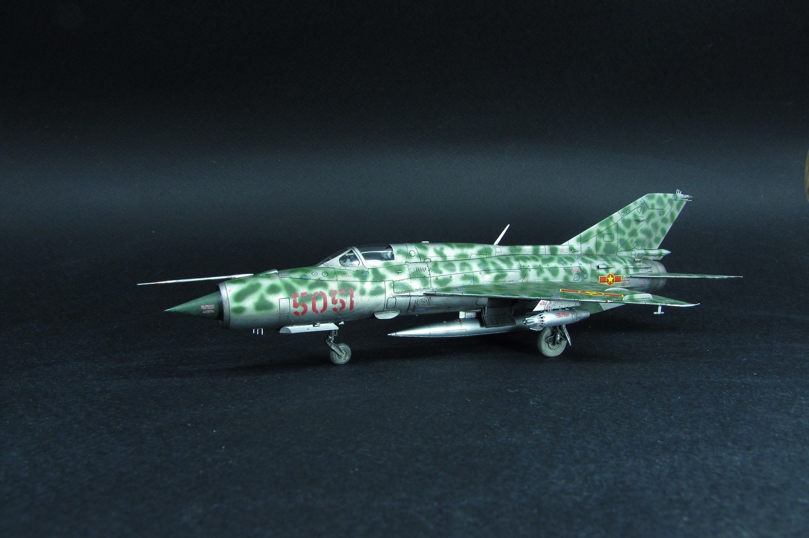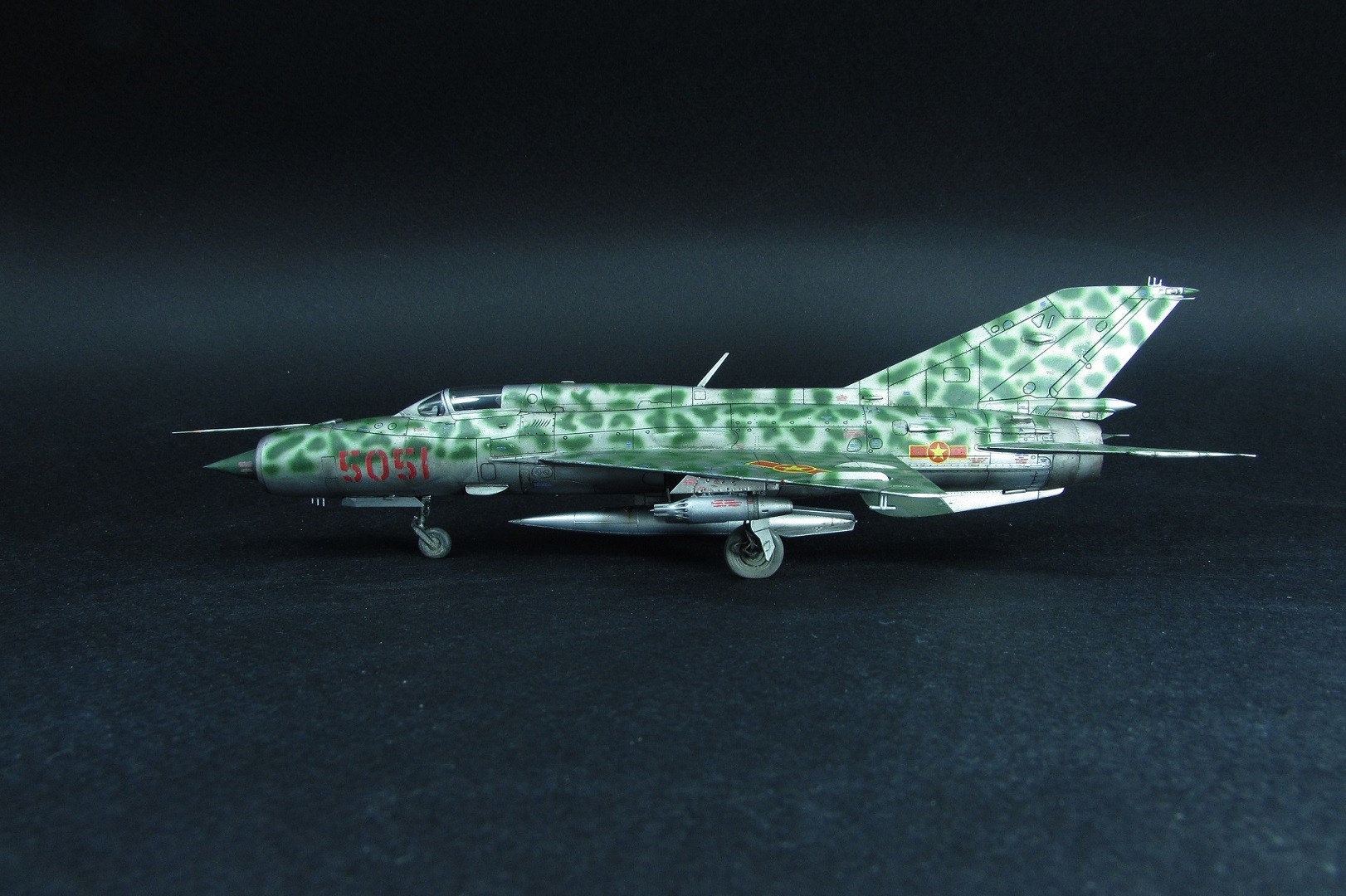 Заказчиком был выбран вариант вьетнамских ВВС. Оказалось, что в схеме, которую дает Эдуард, есть ошибка - фон камуфляжа должен быть зеленным, а не серебристым. Её я естественно обнаружил когда уже покрасил. Было решено что реального прототипа у этого самолёта не будет, просто модель по мотивам вьетнамских МиГ-21. В итоге получилось очень даже симпатично, мне нравится. Цели охоты за мм и блохами не стояло).