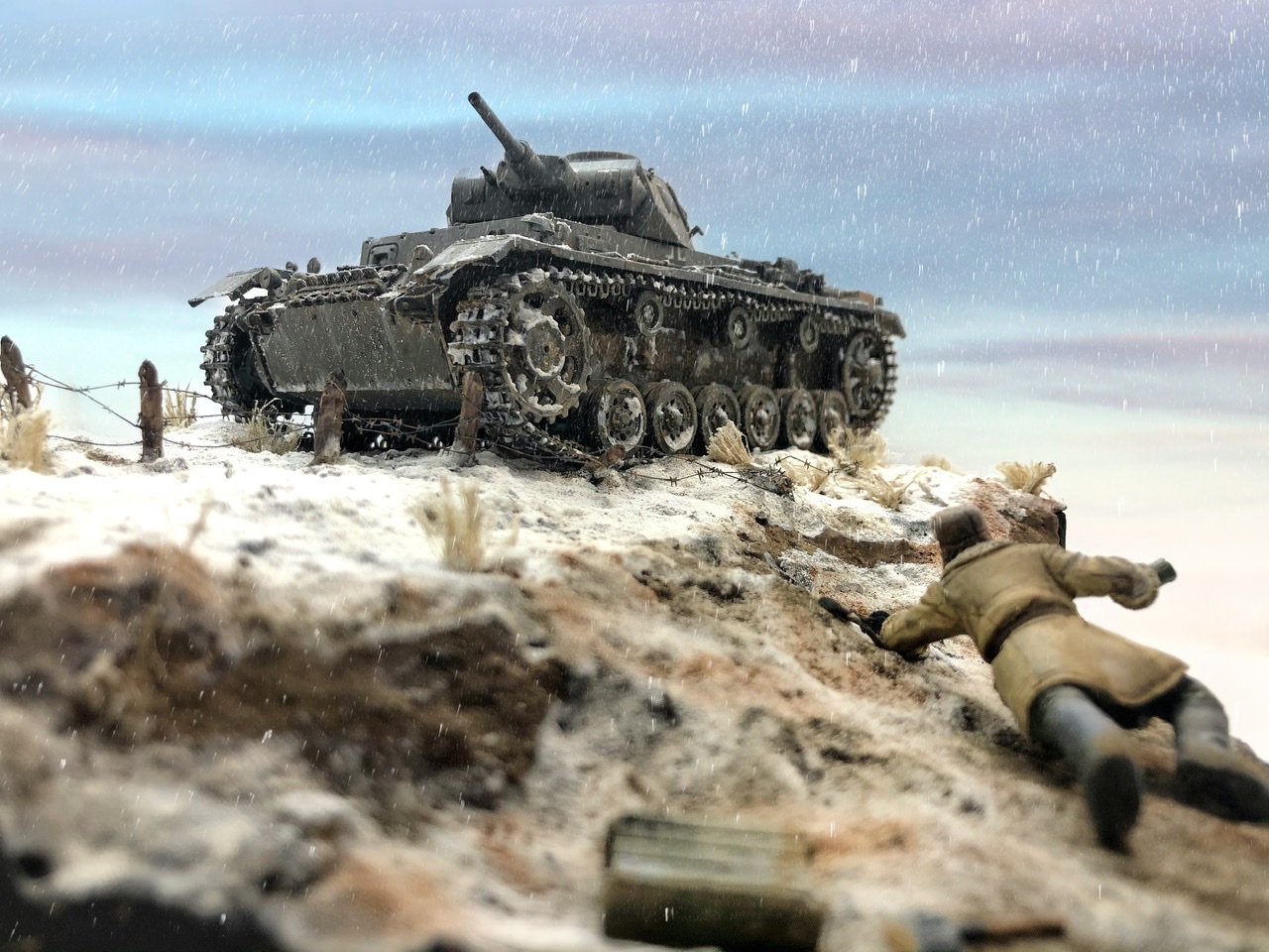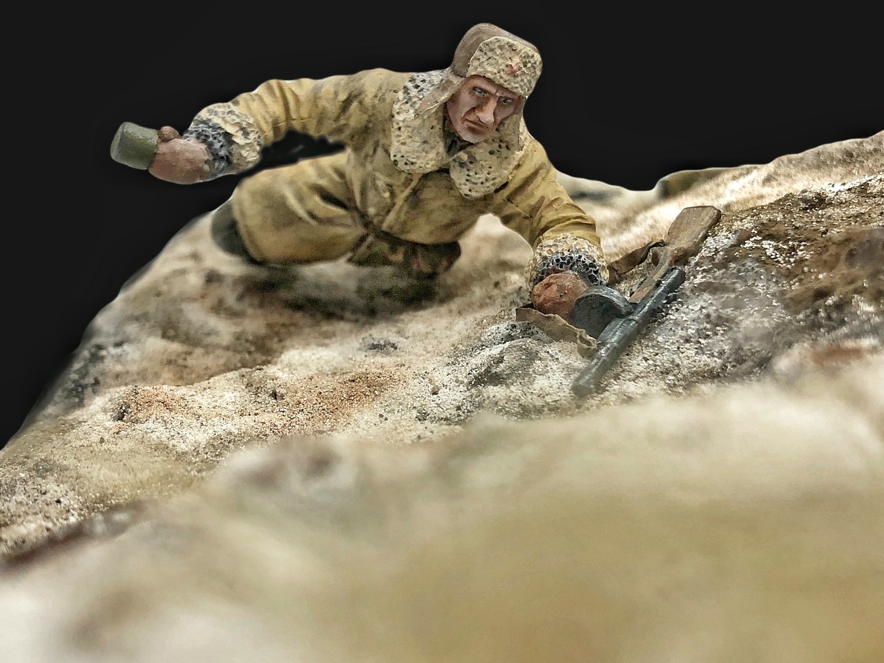 2. Мне показалась, что поза фигурки немного деревянная. Не понятно, что солдат делает. Если он выглядывает, что бы примериться к броску гранаты, то наверное тело должно быть более пластично и к грунту "прилипать". А если он уже напрягся "в планку" для броска гранаты, то рука должна быть отведена назад и в позе читаться "динамика" броска.
