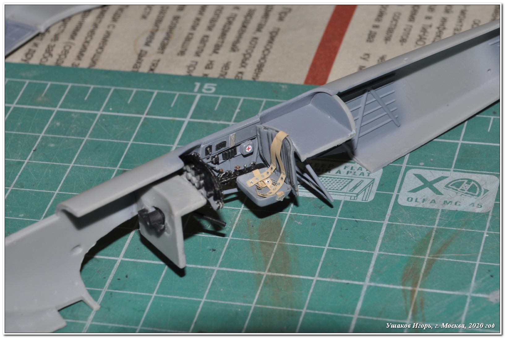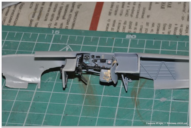 Работу над моделью начал несколько не стандартно – со сборки крыла. Долго возился, удаляя облой с деталей, следы питателей и т.п., затем подгонка. Сильно пришлось помучиться выводя заднюю кромку нормальной толщины. Далее вклеил и заполировал топливомеры. Затем сборка водорадиатора. Доработал его, изготовив из пластикового прутка тягу РВ. И наконец, перешел к кабине. Травление Анатолия ака GONZA несомненно украшает модель. Проработка всех деталей четкая и продуманная. Мне понравилось. Но трудоемкость сборки возросла многократно, ибо разместить на своих местах такое огромное количество мелких деталей для меня оказалось непросто. Отмечу отсутствие в наборе травления рукоятки управления закрылками (на левом пульте прорезь под нее есть, а детали нет). Взял похожую рукоятку из Эдуардовского набора травления. Сборка фюзеляжа прошла непросто: шпаклевка, вклейка пластика и прочее… Приличными словами это вряд ли опишешь. Стыковка в дальнейшем фюзеляжа и центроплана тоже непростая задача, но клеил небольшими участками, один борт, потом второй и практически вывел все без щелей. Далее доработал стойки шасси проволокой 0,3 мм, таким образом имитировал шланги гидравлики (монтировал проволоку уже после окраски и тонировки стойки), а также на подкосах заменил пластиковую имитацию пружин, свив их из проволоки 0,25 мм. В завершение работ из ворса кисти сделал «солдатики» основных стоек шасси. ПВД из трубочки 0,6 мм.