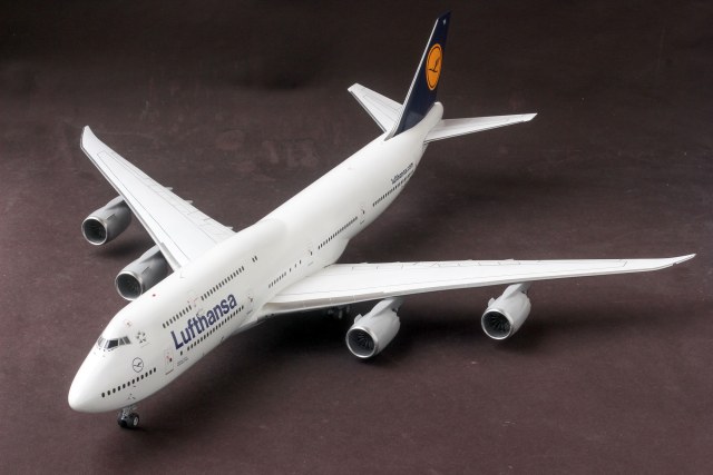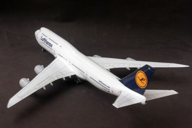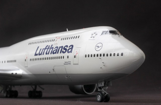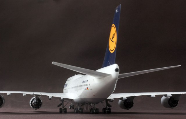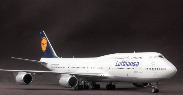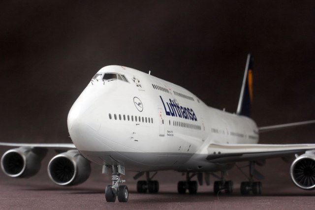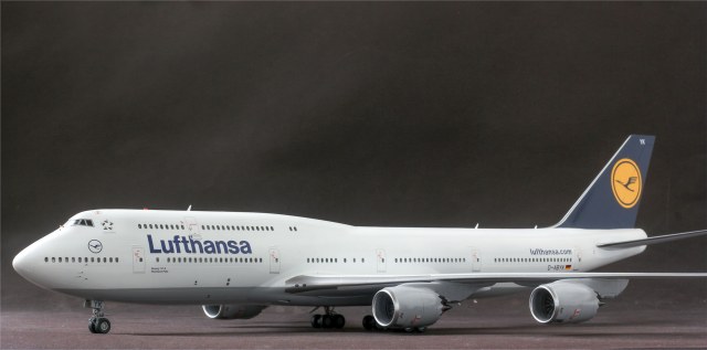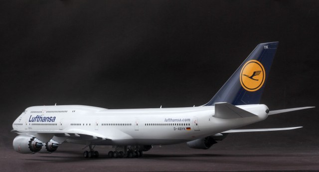 Boeing 747-8 Lufthansa D-ABYK. Набор от Звезды. Декаль шелковая, от Uprise-decals. Окраска химией Mr.color. Немного испачкал тамиевской эмалью на уайтспирите. Немного датчиков и антенн из набора 777 микродизайна. Были небольшие танцы с бубном, при выравнивании основных опор шасси в основном всё нормально сошлось.