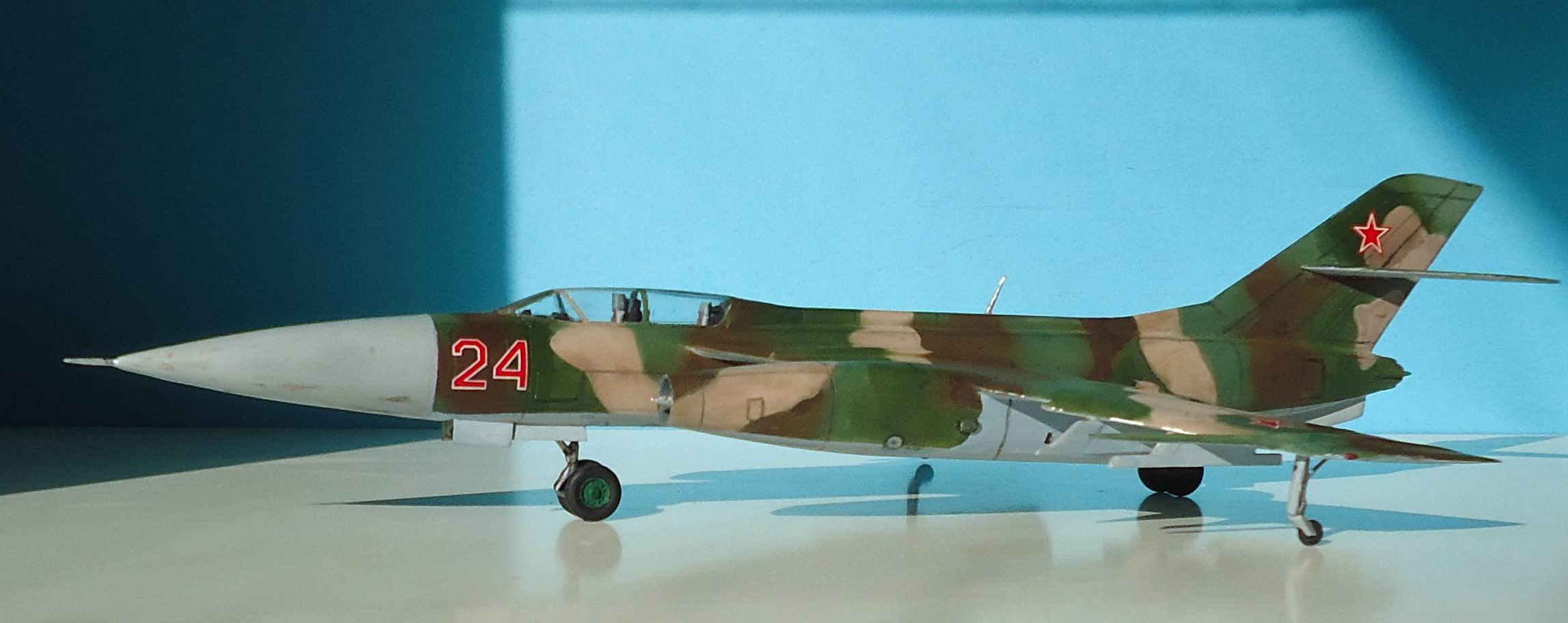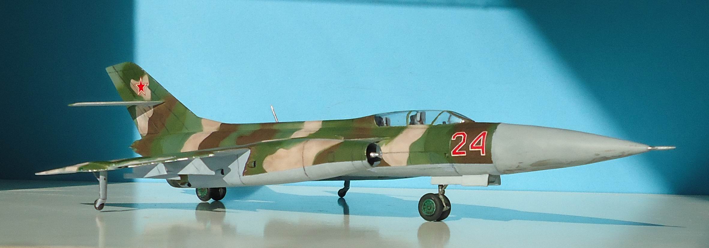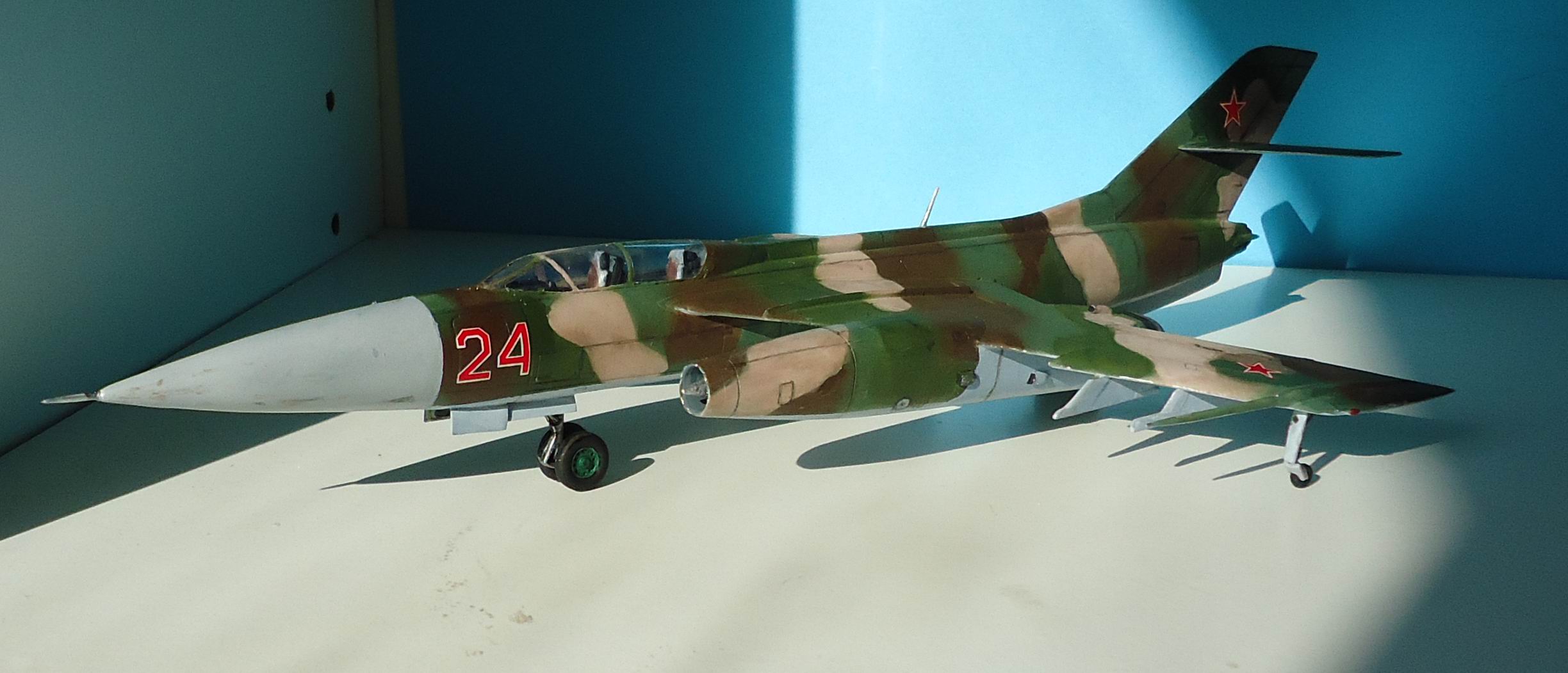 Гондола правого двигателя задрана вверх, колеса на передней и задней стойках приклеены криво! Грань радиопрозрачной краски на носовом конусе окрашена криво, ровно как и граница камуфляжа с нижним голубым! Диски колес шасси тоже окрашены на тяп-ляп! Камуфляж "аля я так вижу" - да и ... с ним! Расшивка- будто дорисованная простым карандашом, какие-то пятна на нижней части носового обтекателя, похожие на не стертую смывку, рандомно нанесенные мазки "серебристого" цвета похожие на фекалии птиц! Редкая в наше время модель красивого самолета была потеряна! МогЁте, Александр - МогЁте!!!!