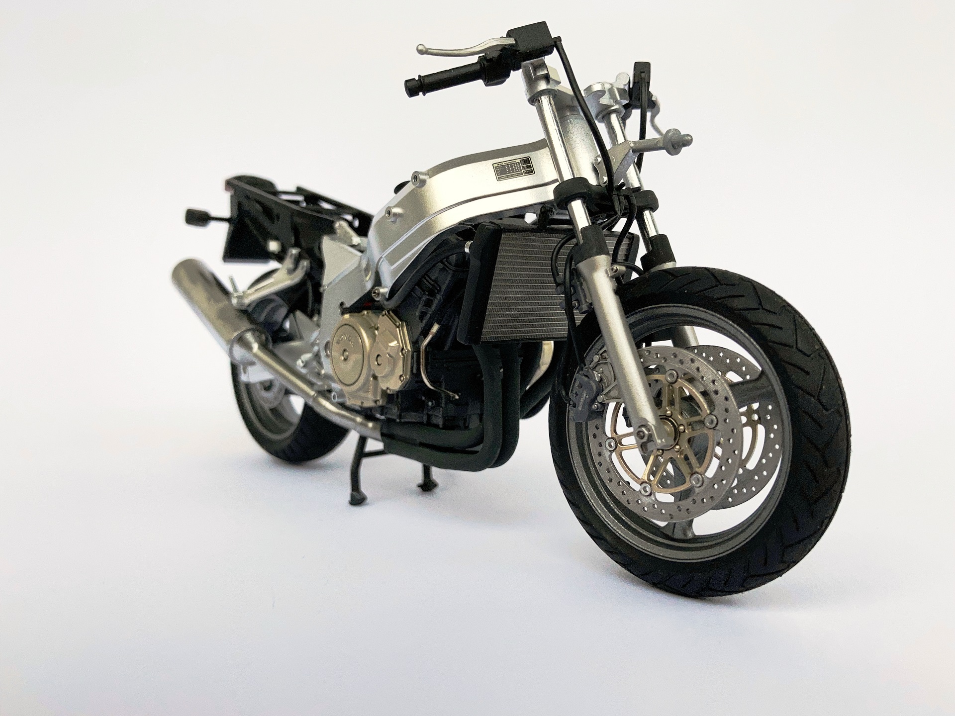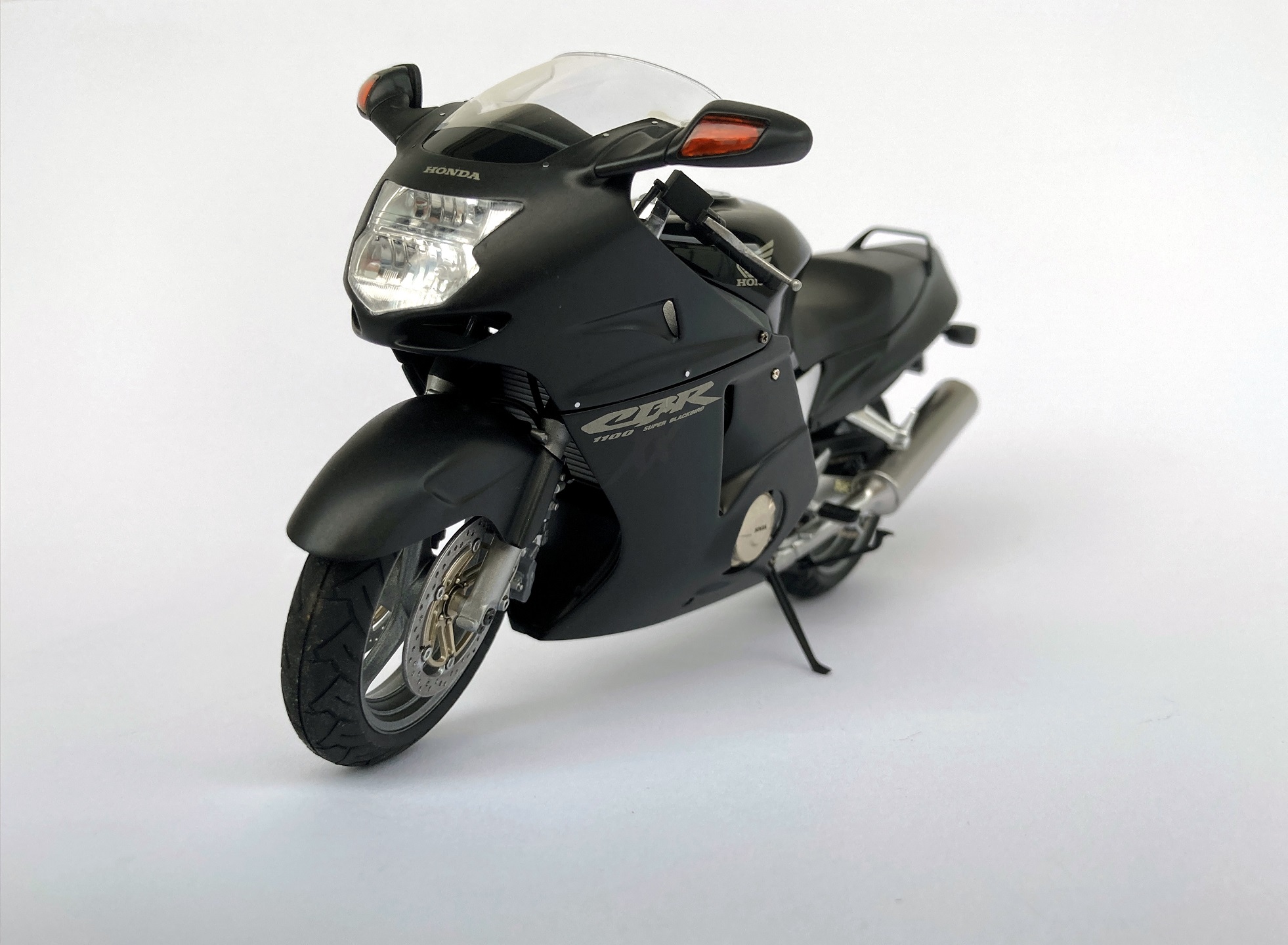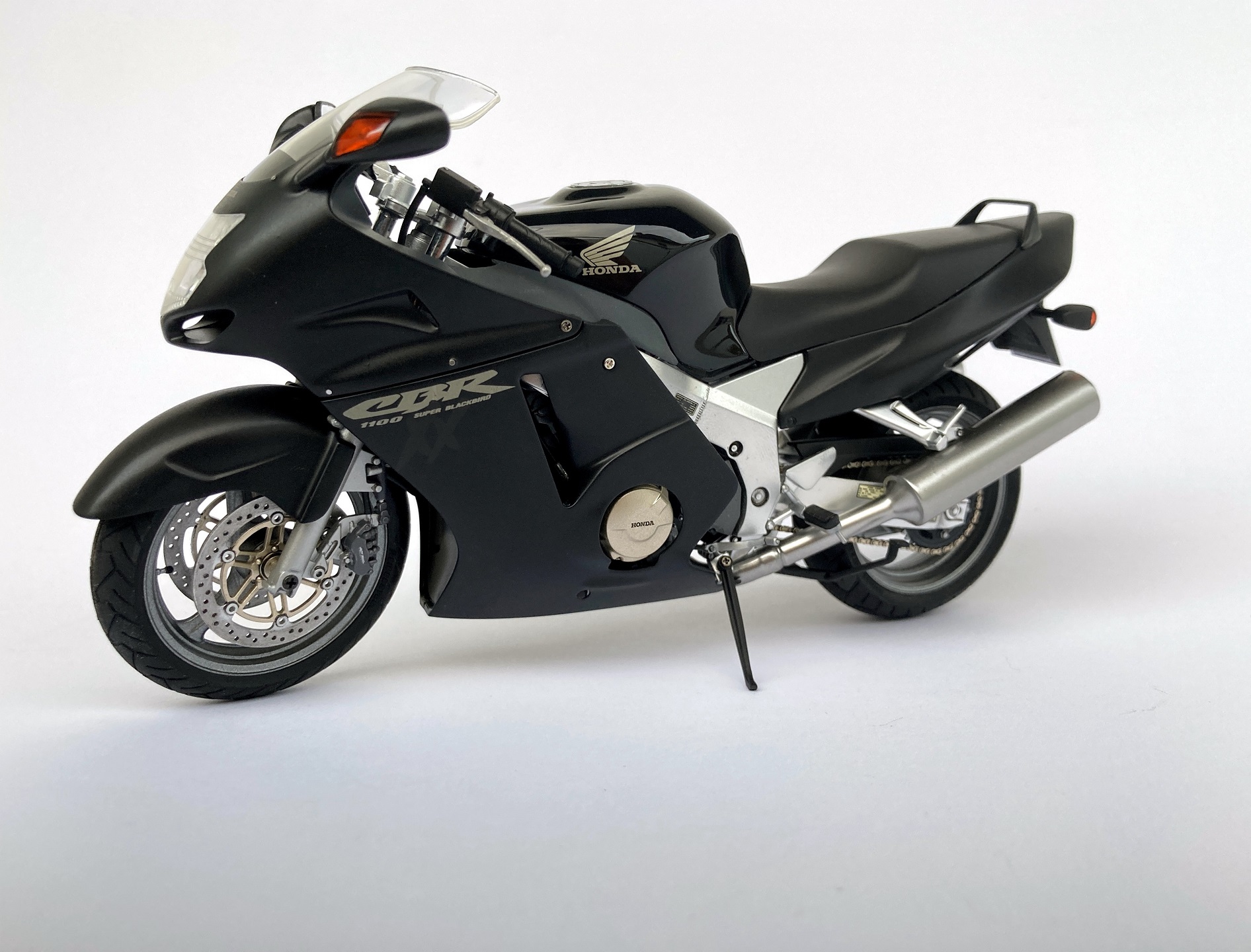 Здравствуйте Уважаемые Коллеги. Представляю Вам свою крайнюю работу. Мотоцикл Honda CBR1100XX от фирмы Tamiya в масштабе 1:12. К моделям мотоциклов я в принципе равнодушен, но здесь я решил отдохнуть от автомобилей. Сама сборка доставила мне удовольствие, но во время финальной сборки отличное впечатление "смазалось" недочетами. Например такими как кресло мотоцикла никак не соприкасается с обшивкой, пришлось придумывать на ходу... Или перья, которые не хотели вставать в нижнее крепление вилки. Пришлось их спиливать и делать из металла. Но в целом результат получился не плохой. Из доработок: Просверлены все тормозные диски, с заднего тормозного диска убрана толщина, цель была просверлена между звеньев, добавлены шланги и провода, сделаны трубки и шланги охлаждения масла, добавлено немного проводки при помощи "тянутого литника". Окрашивалось красками Tamiya Acrylic, Zero Paints, Mr. Color, Revell Aqua. Покраска наружных элементов производилась по следующей схеме: грунт, базовый черный, декали, 2к лак, полировка, полу матовый лак. Фото как всегда сделаны на телефон. Спасибо за внимание. С Уважением.
